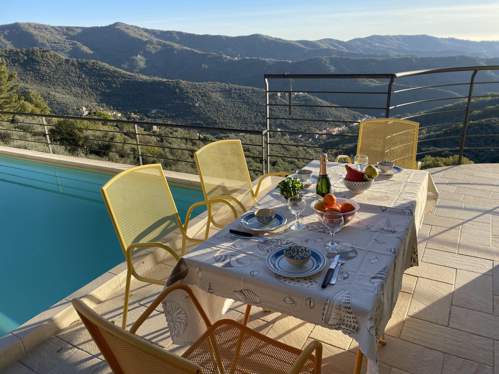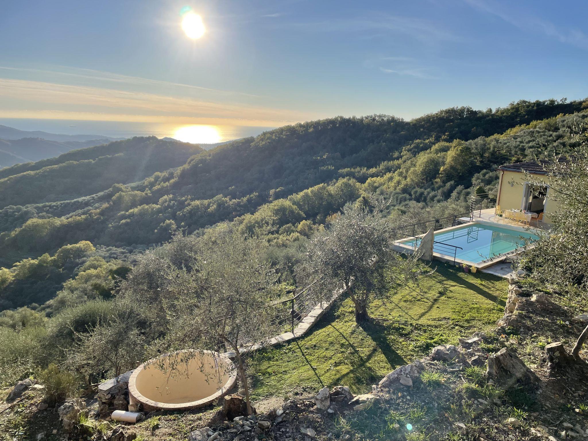 Schönes, freistehendes Einfamilienhaus "Bellaria", Baujahr 2020, umgeben von Bäumen. 300 m vom Zentrum von Valloria, am Ortsrand, 14 km vom Zentrum von Imperia, 33 km vom Zentrum von San Remo, alleinstehende, sonnige, erhöhte Lage am Hang, 14 km vom Meer, 4 km vom See, im Grünen. Zur Mitbenutzung: Tennis. Zur Alleinbenutzung: naturbelassenes Grundstück 3'000 m2 mit Bäumen, Liegewiese, Schwimmbad (8 x 4 m, 140 cm tief, saisonale Verfügbarkeit: 01.Jan. - 31.Dez.) mit Innentreppe. Aussendusche, Poolpflege durch den Besitzer/Gärtner. Im Hause: Einstellraum für Fahrräder, Fahrradverleih. 1.5 km lange holprige, schmale Zufahrt bis zum Grundstück (Naturweg). Treppenweg (10 Stufen) bis zum Haus. Parkplatz (für 2 Autos) auf dem Grundstück. Einkaufsgeschäft 4 km, Supermarkt 14 km, Restaurant, Bar 300 m, Bäckerei 4 km, Bushaltestelle 400 m, Bahnstation "Imperia Oneglia" 19 km, Sandstrand "Imperia" 14 km. Nahe gelegene Sehenswürdigkeiten: Valloria,Dorf mit 160 bemalten Türen 300 m, Olivenölmühle in Dolcedo 4 km, Lavendeldestilation in Pantasina 8 km. Wandergebiete: Monte Faudo (1149 m) Mountainbike Trails.