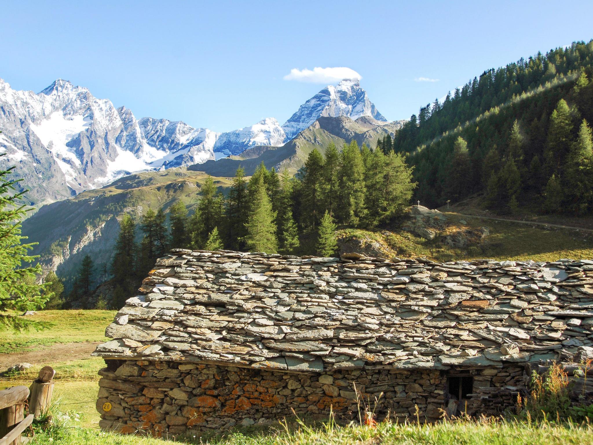 Gemütliches Chalet "Coup d'Coeur", 1'600 m.ü.M.. 3 Wohnungen im Ferienhaus. Oberhalb von Valtournenche, 400 m vom Zentrum von Valtournenche, 8.5 km vom Zentrum von Breuil Cervinia, 18 km vom Zentrum von Chatillon/Saint Vincent, sonnige Lage am Hang, 800 m vom Skigebiet. Im Hause: Empfang, Skiraum, Waschmaschine (zur Mitbenutzung, extra), Skischuhtrockner. Supermarkt, Restaurant 300 m, Bushaltestelle "Valtournenche" 400 m, Bahnstation "Chatillon" 18 km, Hallenbad 800 m. Golfplatz (18 Loch) 8.5 km, Skilift, Gondelbahn, Skipisten 800 m, Skibushaltestelle 400 m, Skischule 800 m.