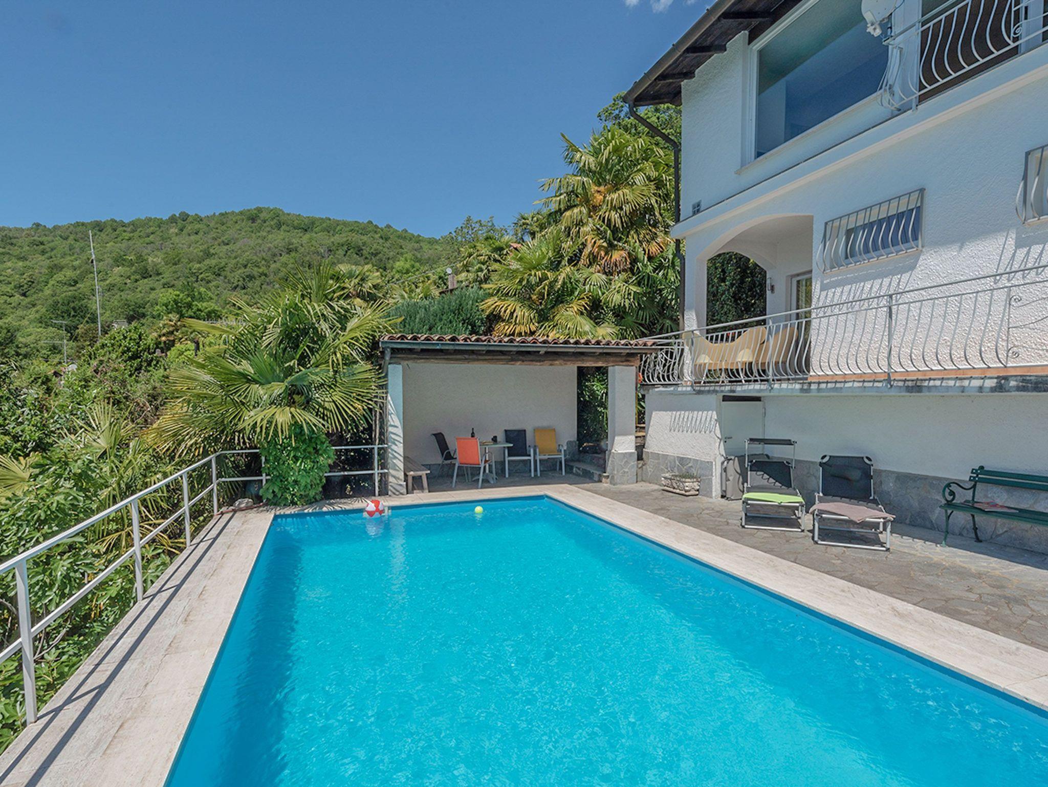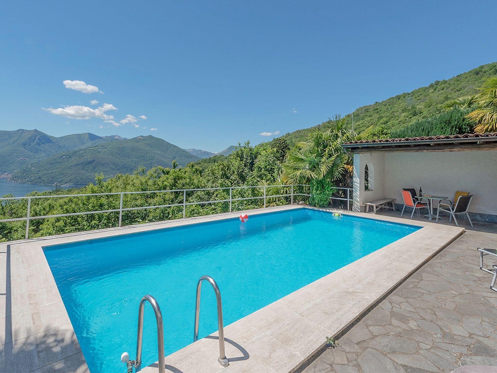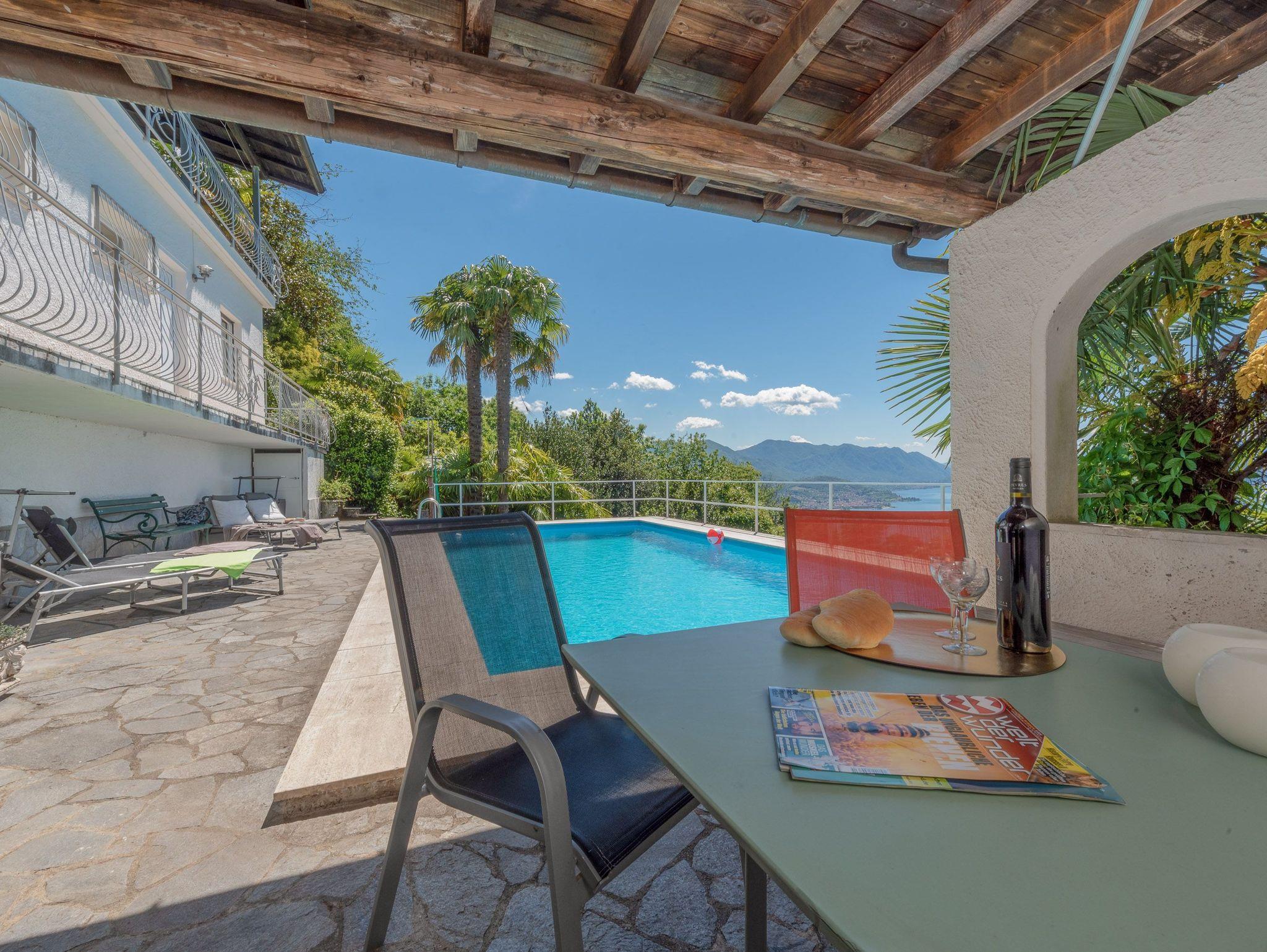 Thronen Sie über dem Lago Maggiore mit einer Aussicht, die Sie sprachlos machen wird. Das ruhig gelegene Zweifamilienhaus ist nach Süden und Westen ausgerichtet und liegt auf einem 1450 Quadratmeter sonnigen, terrassierten Grundstück mit vielen Palmen. Der Pool, der von Juni bis Ende September betrieben wird, ist 4x8 Meter groß und wird exklusiv von den beiden Wohnungen dieses Hauses genutzt. Die schattige Weinlaube direkt oberhalb des Pools lädt zum Verweilen ein. Nur 200 Meter vom Haus entfernt befindet sich ein reizender Bach in idyllischer Lage mit zahlreichen kleinen Wasserfällen.