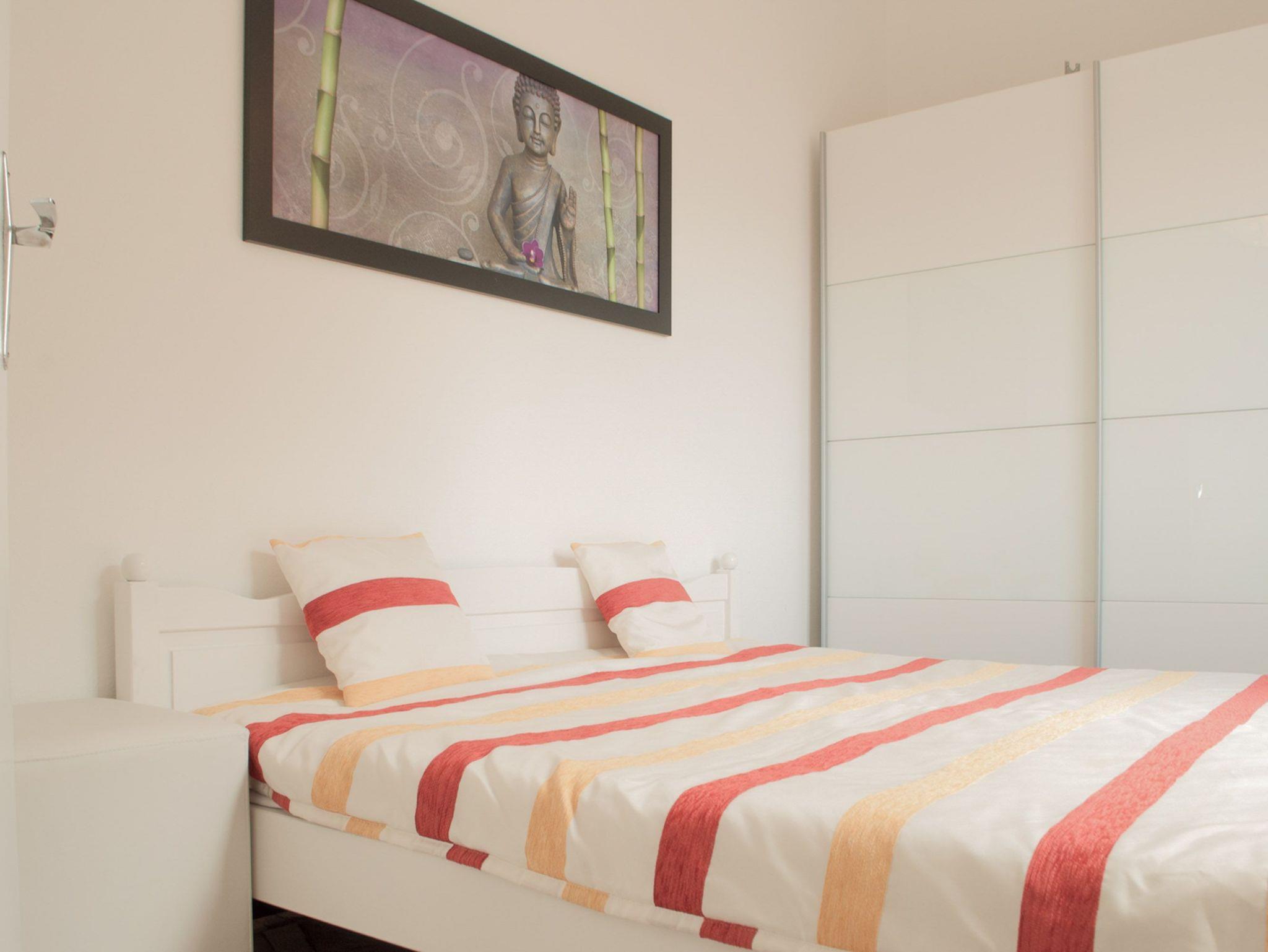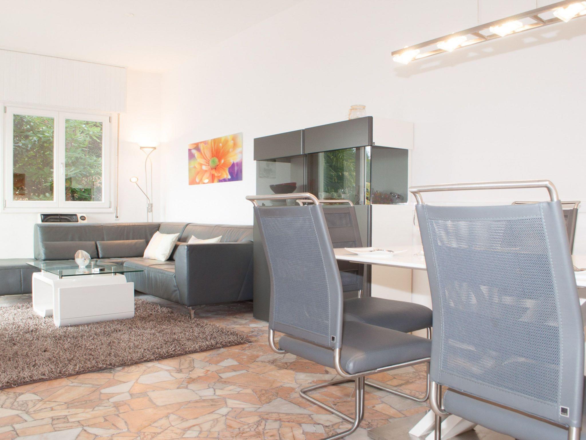 Im Souterrain gelegen, wurde diese Wohnung für bis zu fünf Personen liebevoll mit vielen raffinierten Details geschmackvoll möbliert und strahlt eine helle Atmosphäre aus. Die Wohnung bietet ein Schlafzimmer mit Doppelbett (140x200) und ein weiteres Schlafzimmer mit Doppelbett (180x200). Die Küche, angrenzend zum Wohnbereich, ist mit allem ausgestattet, was benötigt wird. Ein Mix aus antikem Zeitalter und hochwertigem Mobiliar verleiht diesem Domizil einen besonderen Komfort und lädt zu einem Wohlfühlurlaub ein. Vom Balkon aus genießen Sie eine traumhafte Aussicht auf den großen Pool und den majestätisch vor Ihnen liegenden See. Der Ausblick auf den See und die Ruhe ermöglichen eine wunderschöne Zeit am Lago Maggiore.