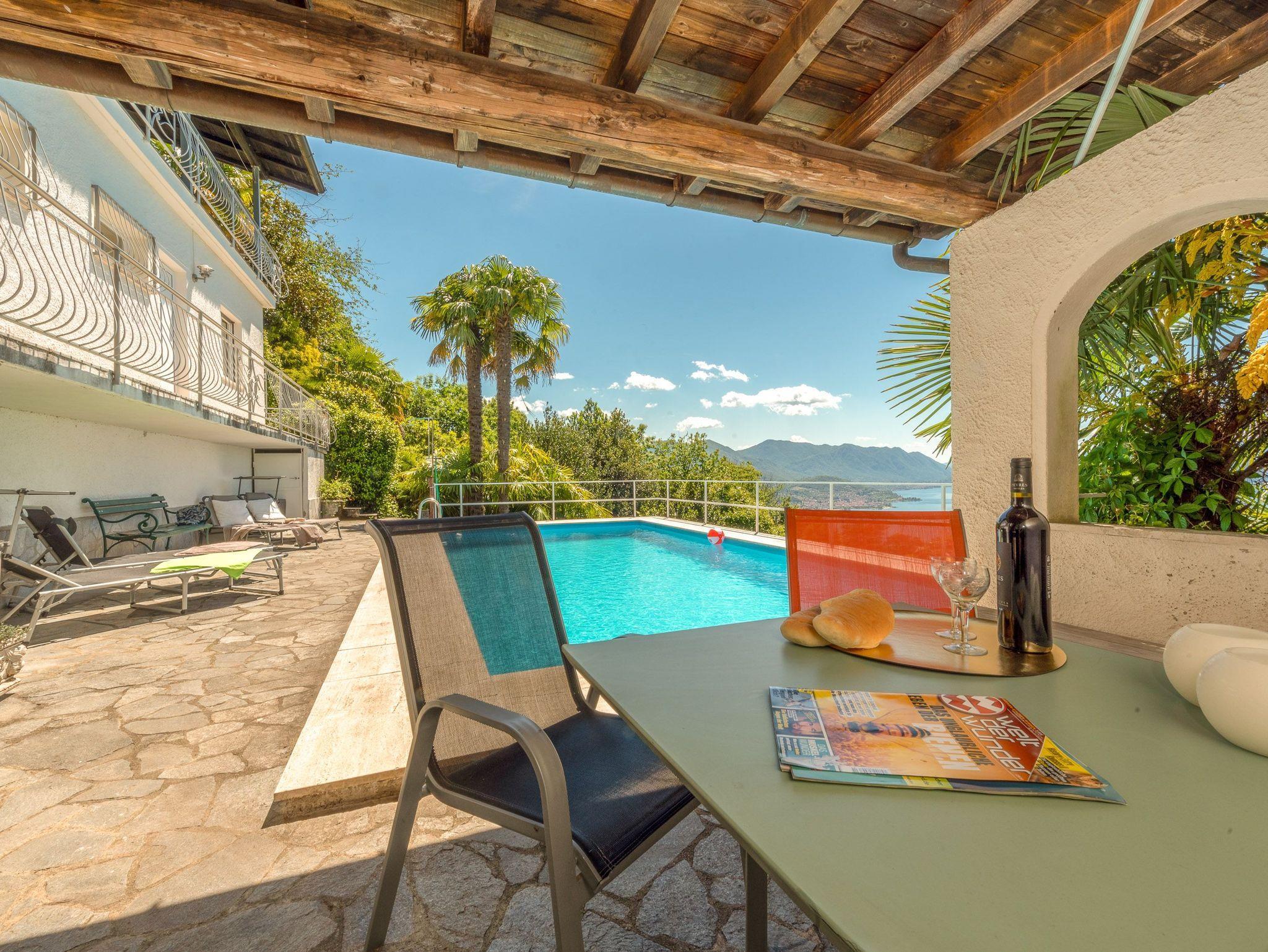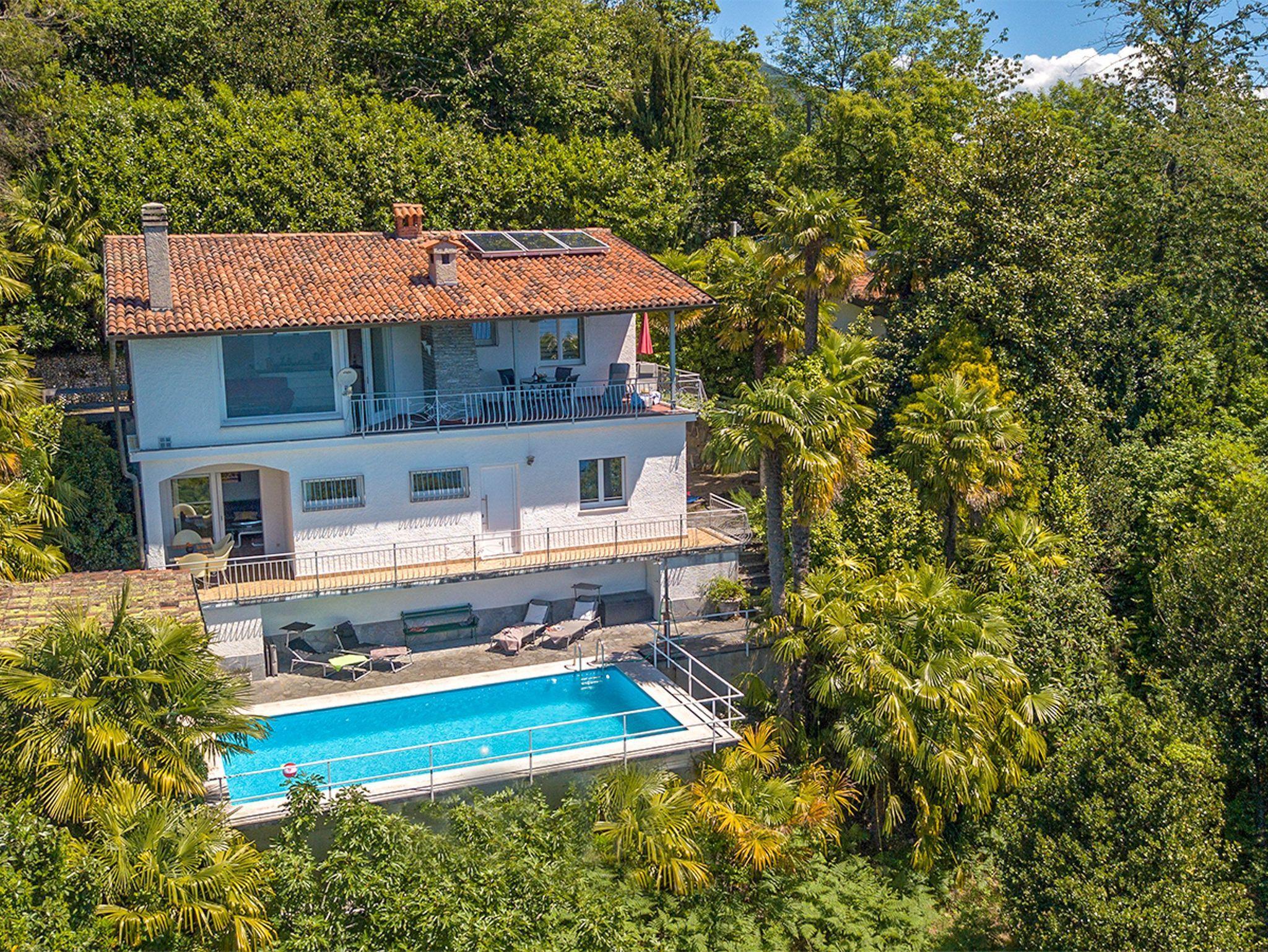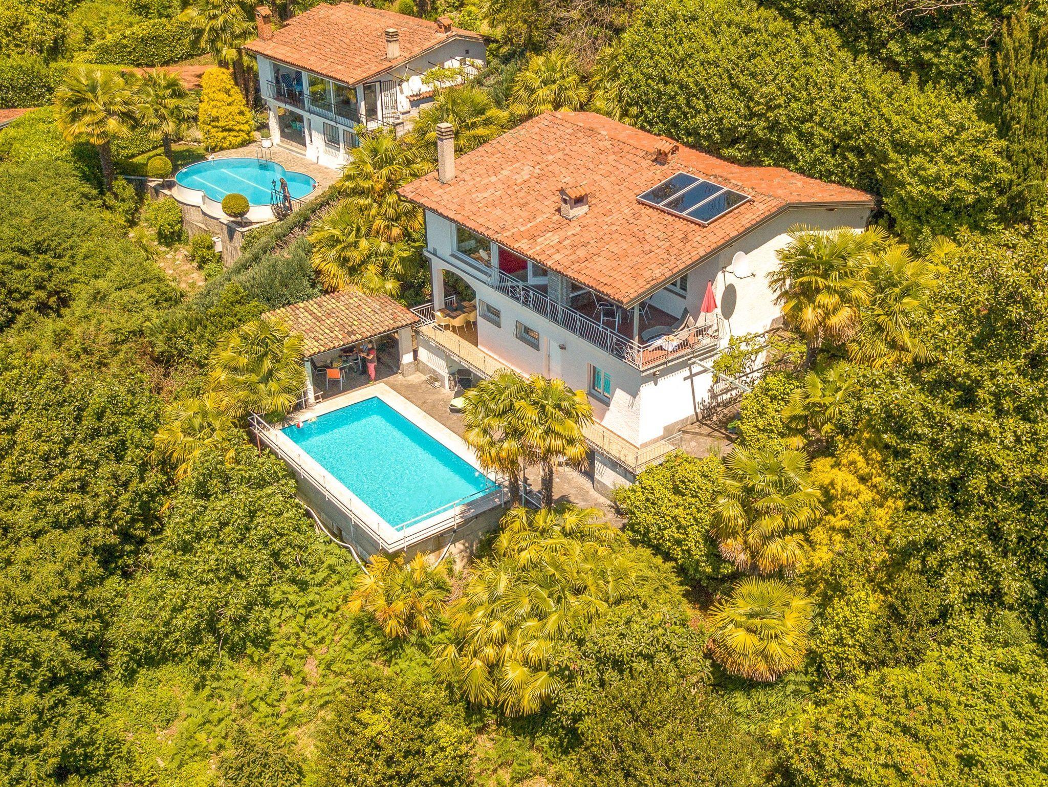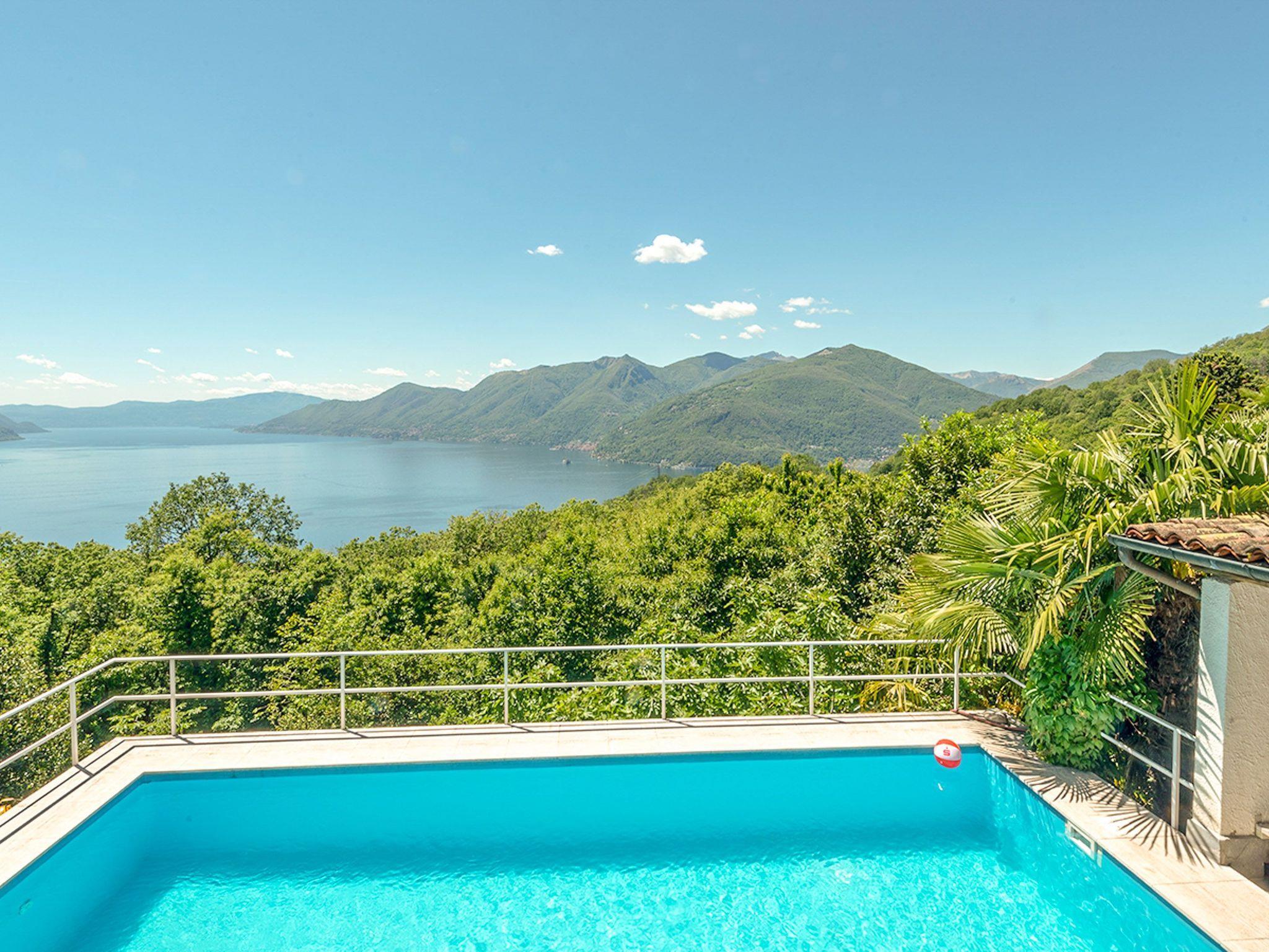 Thronen Sie über dem Lago Maggiore mit einer Aussicht, die sprachlos macht. Das ruhig gelegene Zweifamilienhaus liegt nach Süden und Westen ausgerichtet auf einem 1450 Quadratmeter sonnigen, terrassierten Grundstück mit vielen Palmen. Der Pool, der von Juni bis Ende September betrieben wird, ist 4x8 Meter groß und wird exklusiv von den beiden Wohnungen dieses Hauses genutzt. Die schattige Weinlaube direkt oberhalb des Pools lädt zum Verweilen ein. Nur 200 Meter vom Haus entfernt befindet sich ein reizender Bach in idyllischer Lage mit zahlreichen kleinen Wasserfällen.