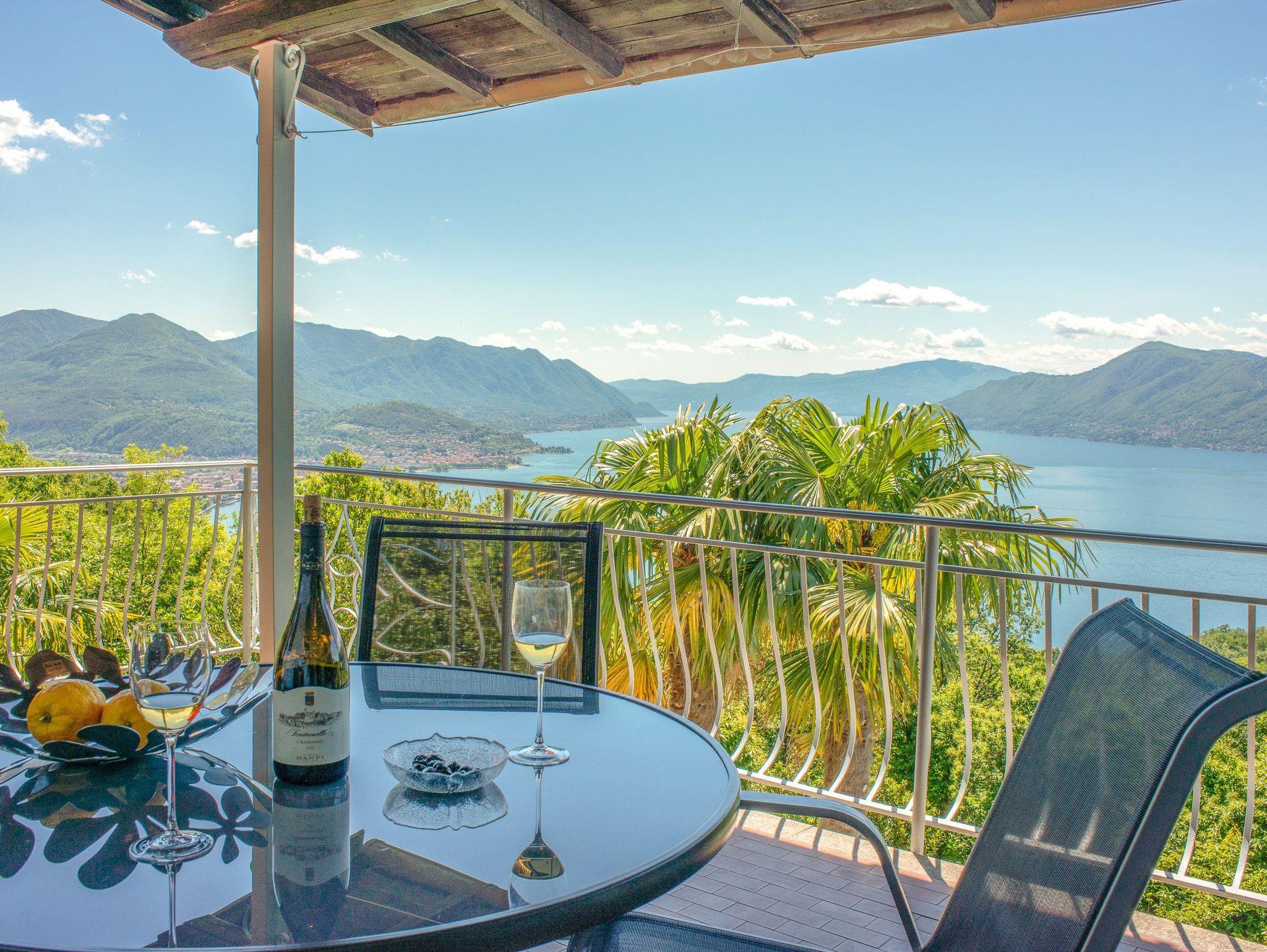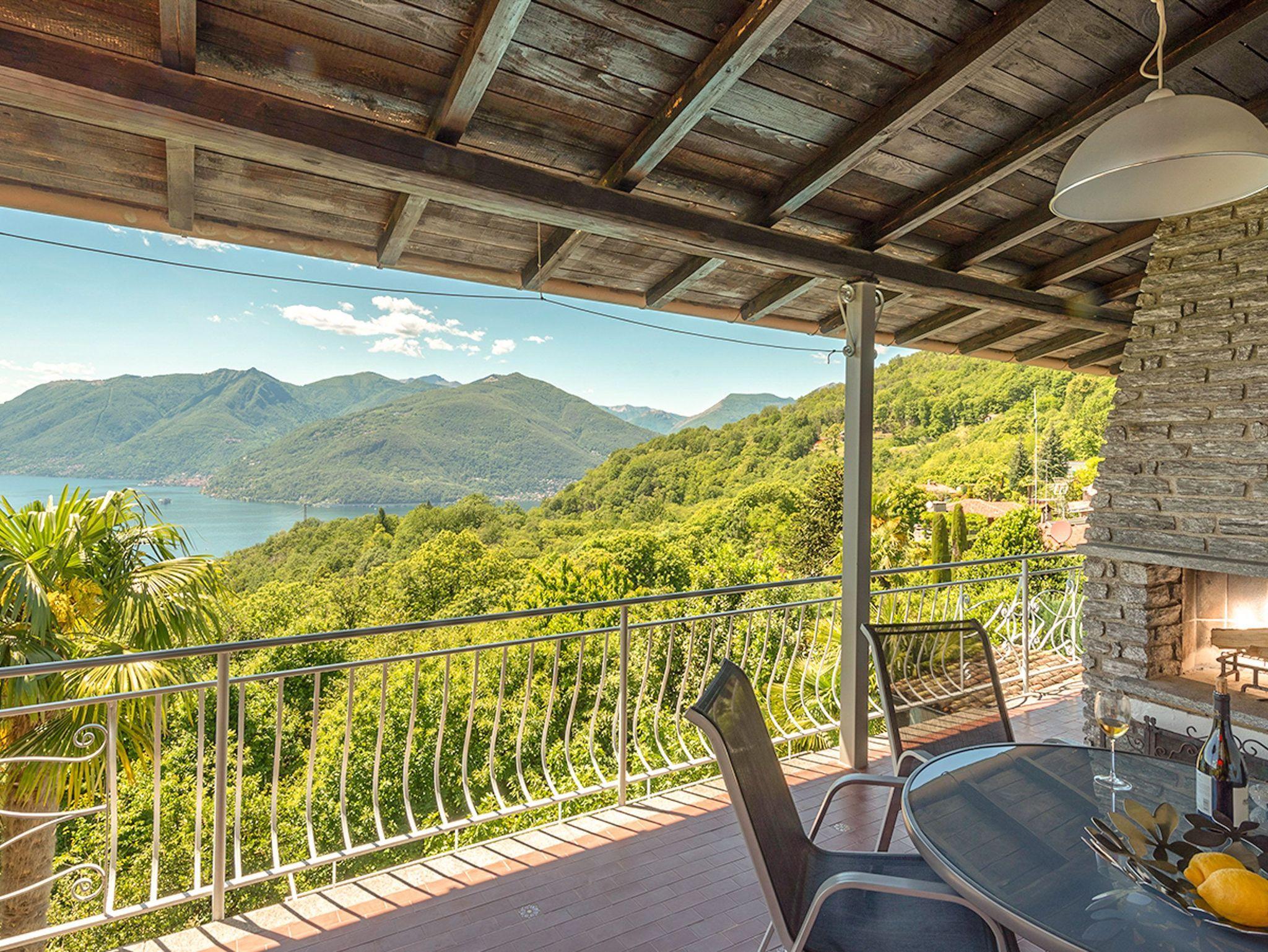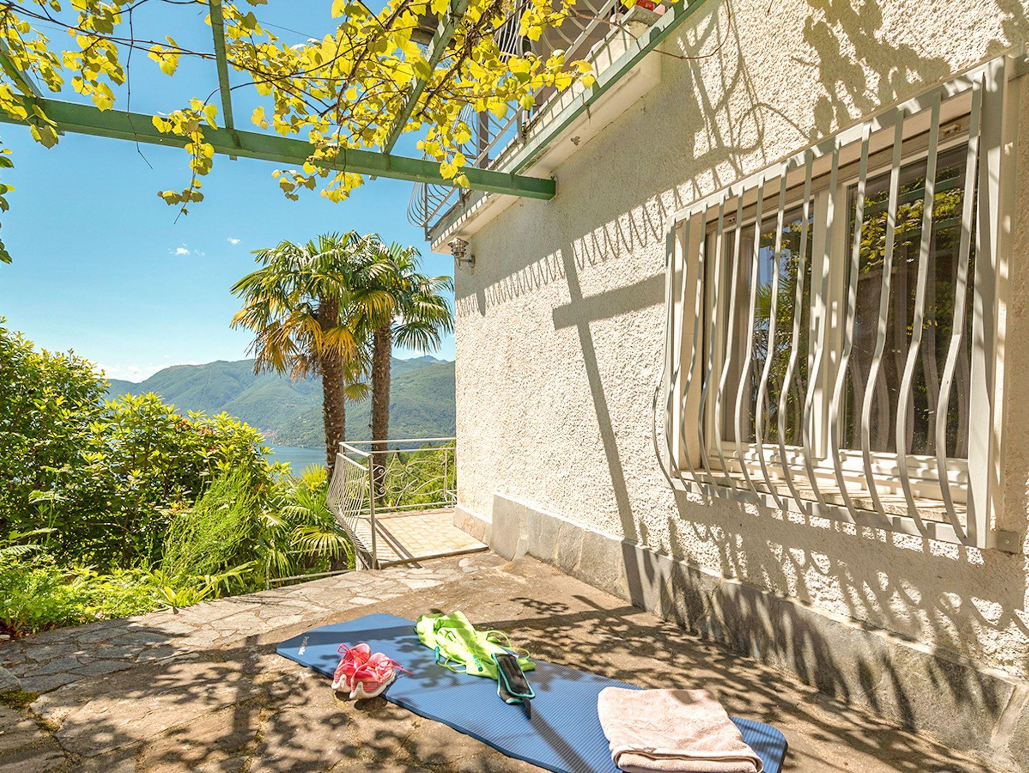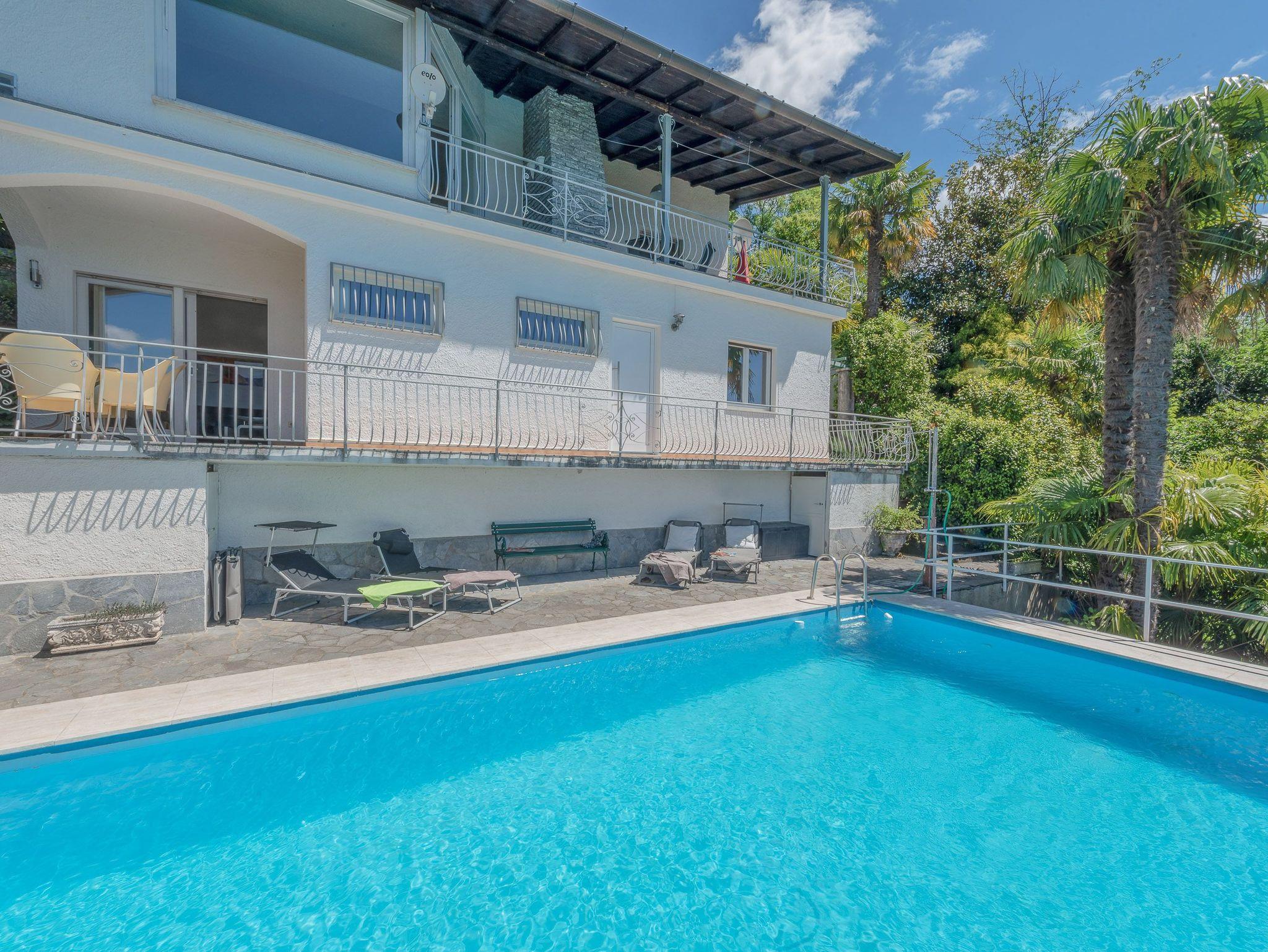 Thronen Sie über dem Lago Maggiore mit einer Aussicht, die sprachlos macht. Das ruhig gelegene Zweifamilienhaus liegt nach Süden und Westen ausgerichtet auf einem 1450 Quadratmeter sonnigen, terrassierten Grundstück mit vielen Palmen. Der Pool, der von Juni bis Ende September betrieben wird, ist 4x8 Meter groß und wird exklusiv von den beiden Wohnungen dieses Hauses genutzt. Die schattige Weinlaube direkt oberhalb des Pools lädt zum Verweilen ein. Nur 200 Meter vom Haus entfernt befindet sich ein reizender Bach in idyllischer Lage mit zahlreichen kleinen Wasserfällen.