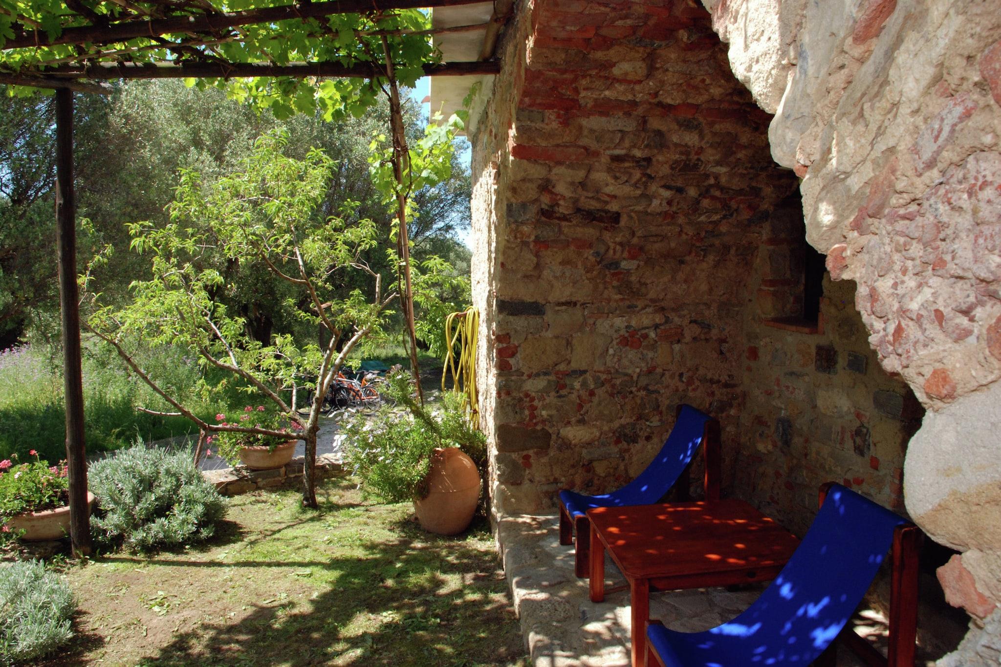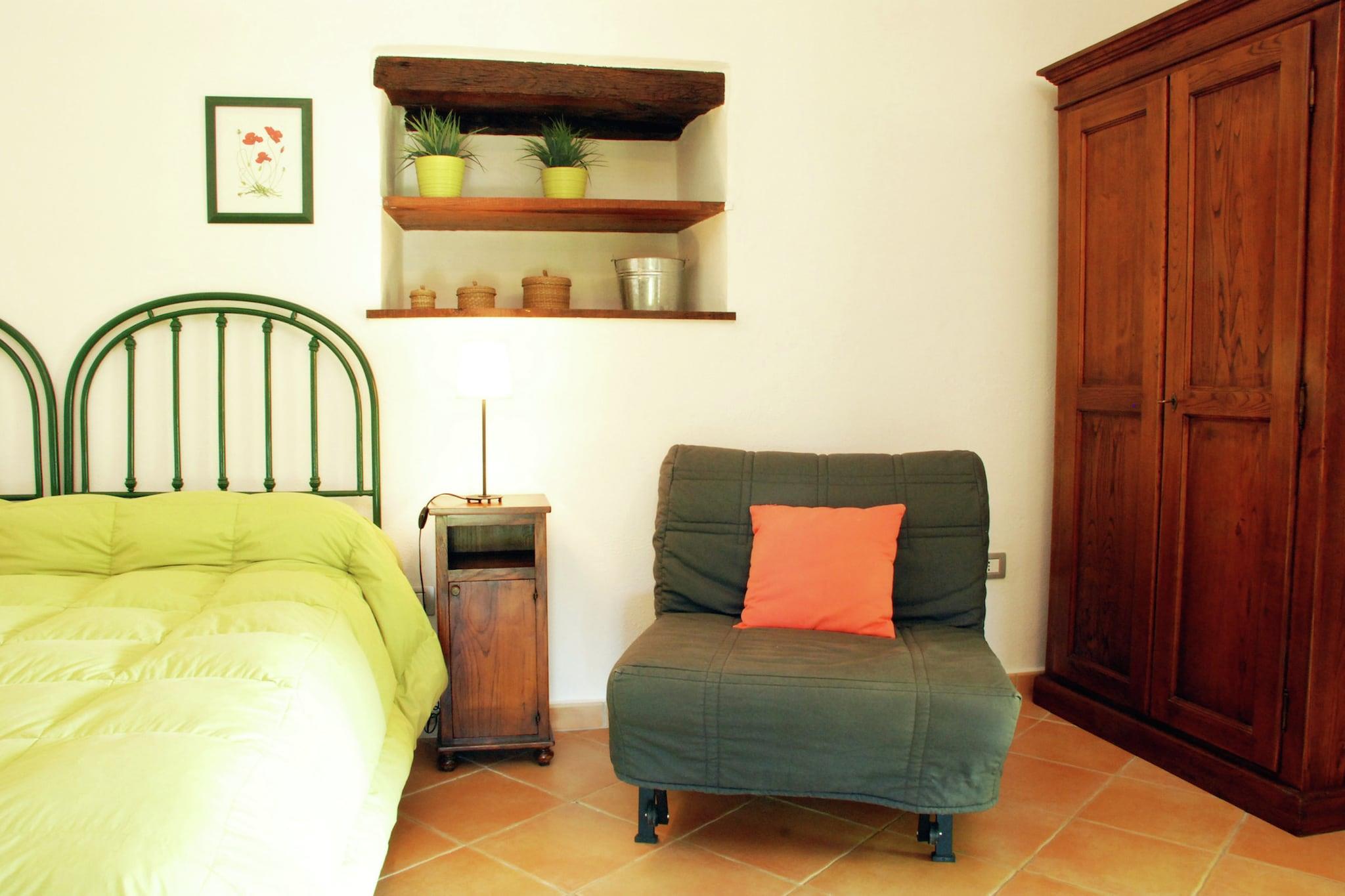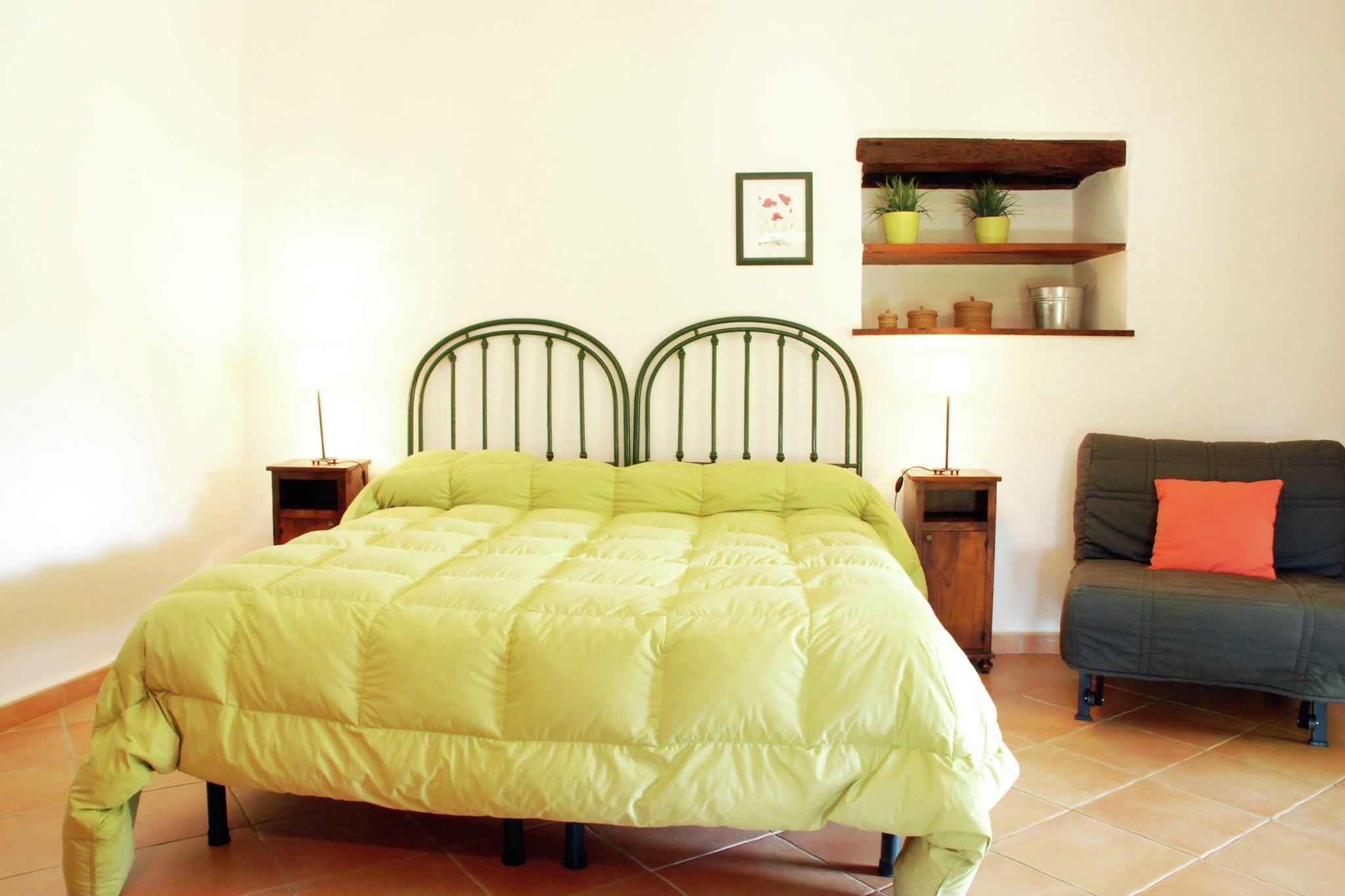 Parterre: (offene Küche(Esstisch, Kochplatte, Kühlschrank, Waschbecken), Schlafzimmer(Schlafcouch 1 Pers., Doppelbett, Klimaanlage), Badezimmer(Dusche, Waschbecken, Toilette, Bidet), Terrasse(12 m2), Garten(6 m2), Gartenmöbel, Liegen) Esstisch, Waschmaschine(Gemeinschaftliche Nutzung mit anderen Gästen), Patio, Garten(Gemeinschaftliche Nutzung mit anderen Gästen, 500 m2), Gartenmöbel, Liegen, Grill, Parkplatz, Sonnenschirm, Fahrräder verfügbar