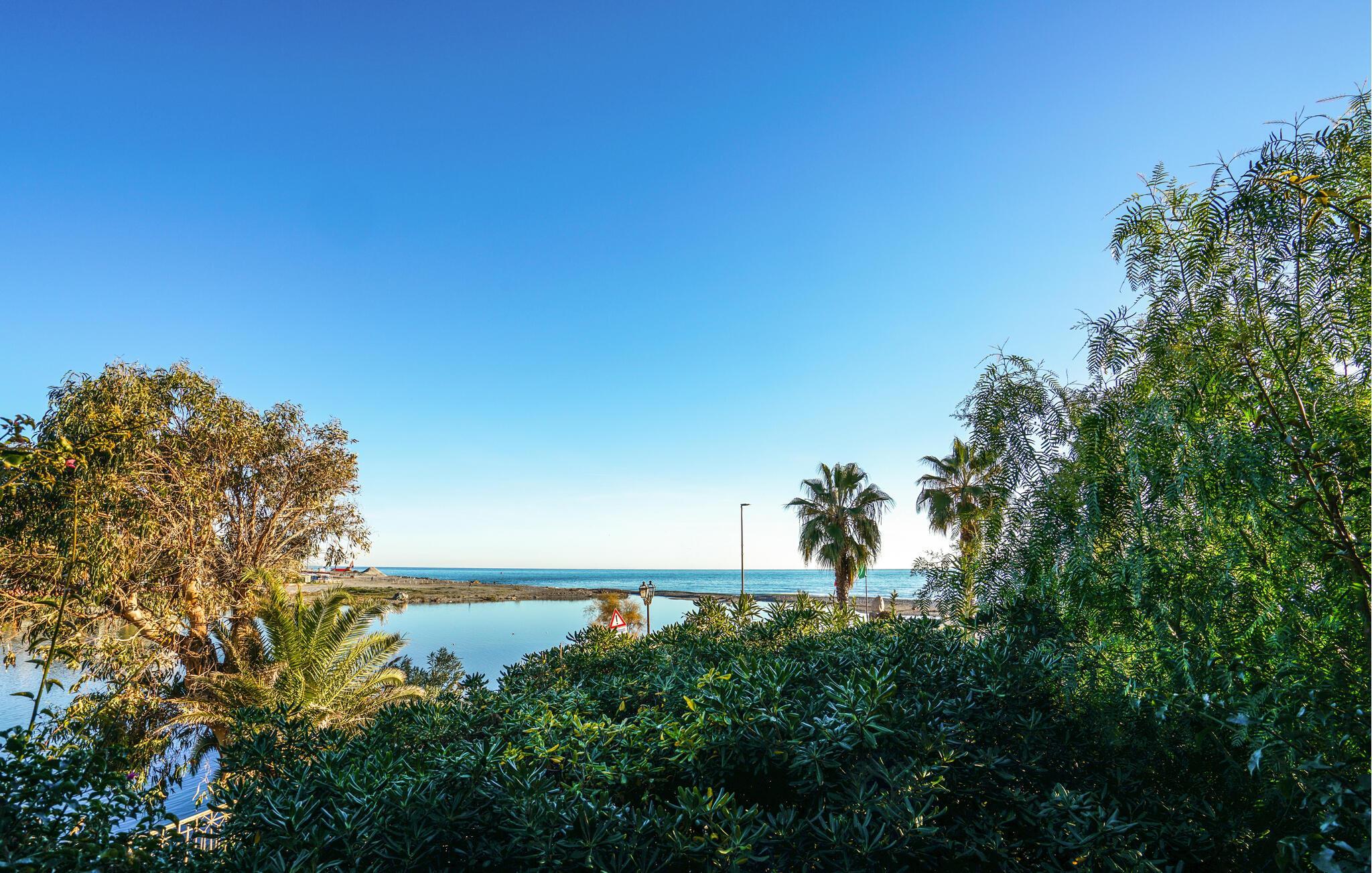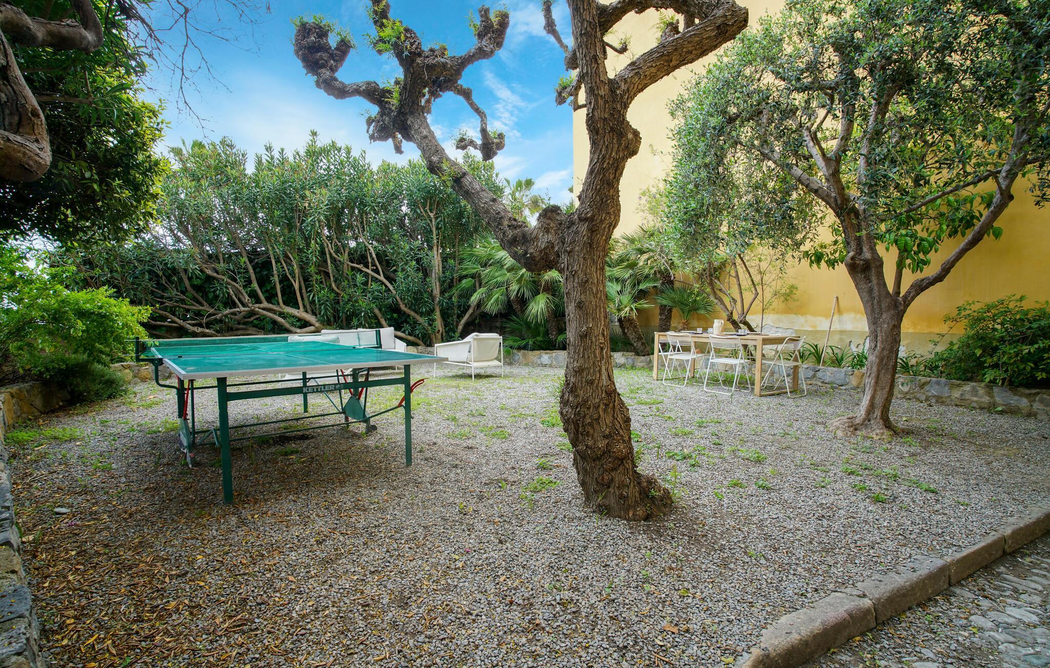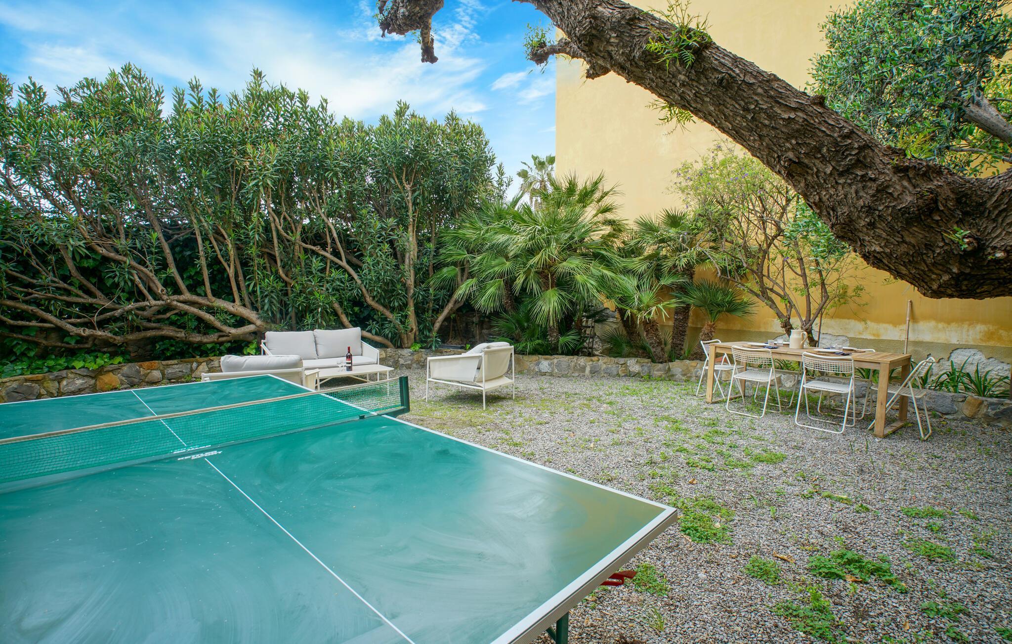 Genießen Sie im Außenbereich die Ruhe und das mediterrane Ambiente im gepflegten Garten mit Palmen und blühenden Pflanzen. Spielen Sie eine Runde Tischtennis oder entspannen Sie bei einem Glas Wein an der frischen Luft. Der Essbereich im Freien lädt dazu ein, Ihre Mahlzeiten unter freiem Himmel zu genießen, während Sie die Meeresbrise spüren.