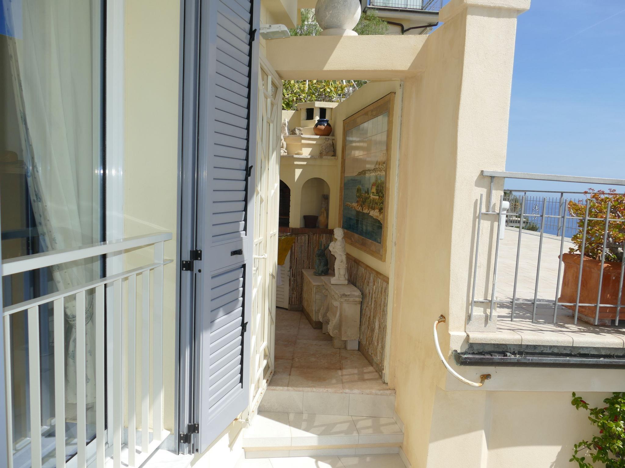 "Grimaldi", 3-Zimmer-Wohnung 120 m2 auf 2 Stockwerken. Geschmackvoll eingerichtet: Wohn-/Esszimmer. Ausgang zur Terrasse. Offene Küche (Backofen, Geschirrspüler, 4 Flammen, Toaster, Wasserkocher, elektrische Kaffeemaschine). Dusche/Bidet/WC, sep. WC. Unteres Geschoss: 1 Doppelzimmer. Ausgang zur Terrasse. 1 Zimmer mit 1 Diwanbett (160 cm, Länge 200 cm). Ausgang zum Balkon. Dusche/Bidet/WC. G-Heizung. Heizung nur verfügbar von 15.10. bis 30.04. 2 Balkone 12 m2, 2 grosse Terrassen 30 m2. Terrassenmöbel. Sehr schöne Panoramasicht auf das Meer. Zur Verfügung: Waschmaschine, Babybett bis 2 Jahre. Bitte beachten: eigener Eingang. IT008065B44U5PBWA2
