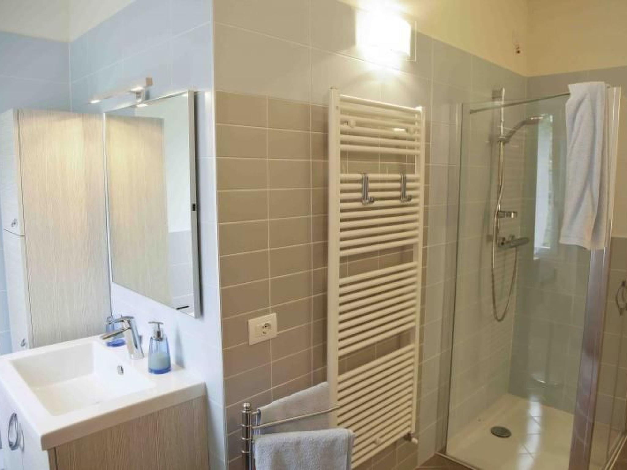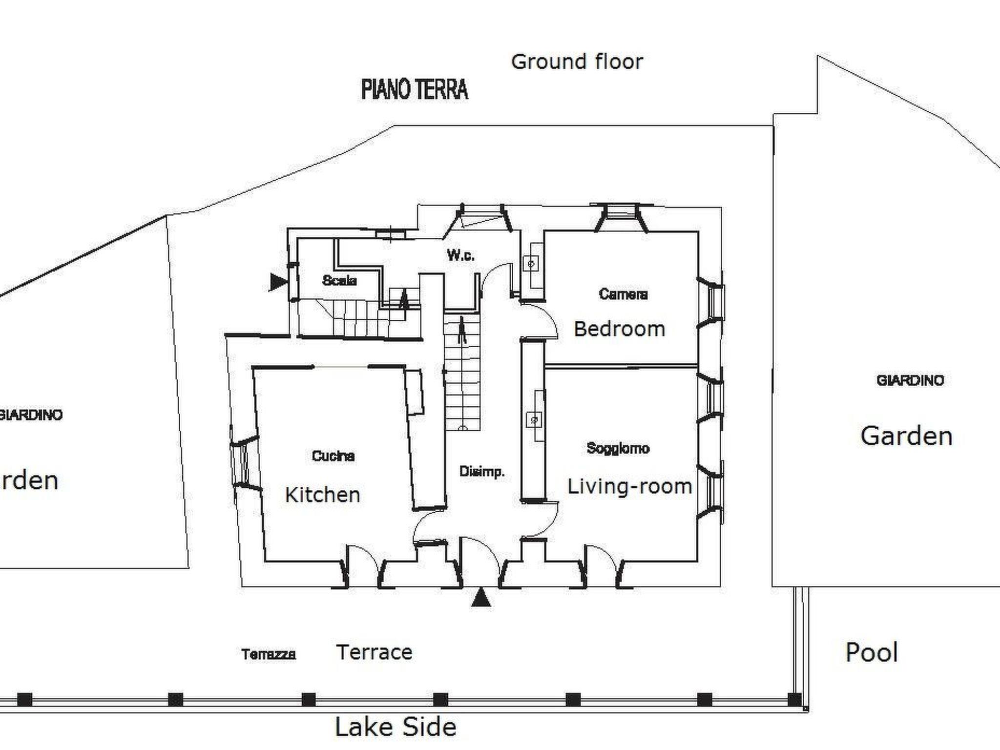 Die Villa hat zwei Etagen: Im Erdgeschoss befinden sich eine geräumige, modern ausgestattete Küche, ein großes Wohnzimmer (mit Schlafsofa), ein Schlafzimmer mit Doppelbett und ein Badezimmer. Die Steintreppe führt in die obere Etage, wo sich zwei Doppelschlafzimmer, beide mit eigenem Bad, und ein schöner Balkon mit Blick auf den See befinden.