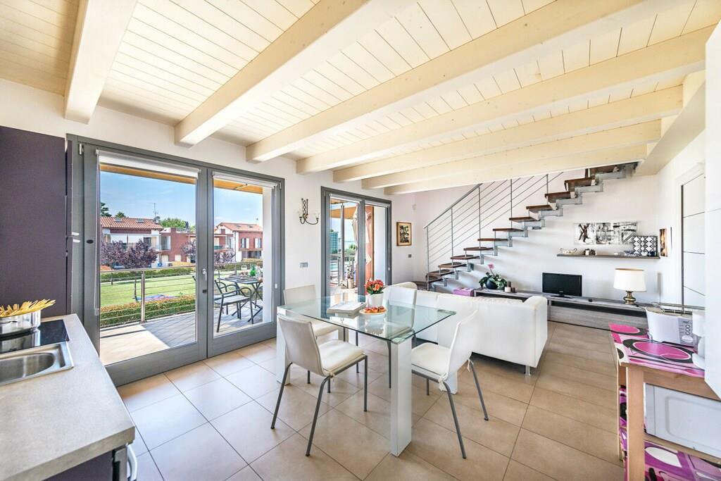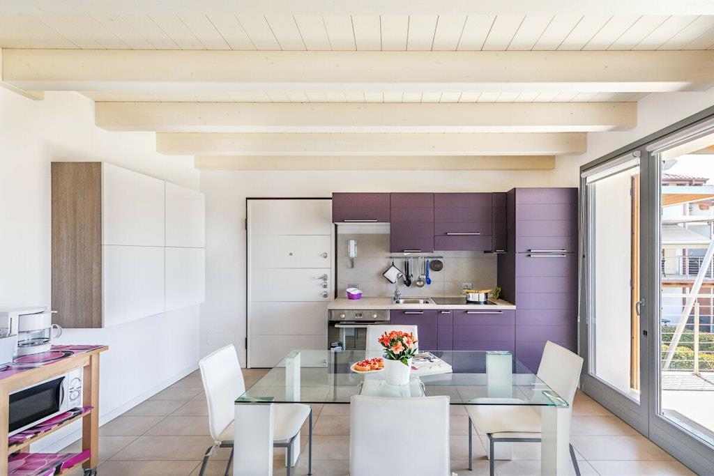 In einer Residenz mit Pool, nur wenige Schritte von der Stadt Lazise entfernt, Wohnung mit 2 Schlafzimmern im ersten Stock für einen Familien- oder Gruppenurlaub bis zu 5 Personen! Die Wohnung, die mit Wi-Fi-Internetverbindung ausgestattet ist, empfängt die Gäste mit dem Wohnzimmer mit Esstisch und Stühlen, Sofa, Flachbildfernseher, Küche mit Induktionsherd, Kühlschrank, Gefrierfach, Geschirrspüler, Mikrowelle, Backofen, Wasserkocher, Zitruspresse, Kaffeemaschine und Toaster. Vom Wohnzimmer aus geht man auf die private überdachte Terrasse mit Esstisch und Stühlen und einen schönen Blick auf den Pool und den See. Die Wohnung, die in allen Zimmern mit Klimaanlage ausgestattet ist, setzt sich fort mit dem Schlafzimmer mit komfortablem Doppelbett, TV, Kleiderschrank und Zugang zum privaten Balkon auf der Rückseite. Auf dem Stock befindet sich ein Badezimmer mit Dusche, Waschbecken, Bidet und WC. Die Wohnung setzt sich im Dachgeschoss fort, das mit zwei Einzelbetten, einer Schlafcouch, einem Tisch mit Stühlen und einem zweiten Badezimmer mit Dusche, Waschbecken, Bidet und WC ausgestattet ist; vom Dachgeschoss aus geht man auf die schöne Sonnenterrasse mit herrlichem Panoramablick auf den See. Den Gästen stehen Waschmaschine, Bügeleisen und Bügelbrett zur Verfügung. Die Gäste können ihr Auto in der Privatgarage der Wohnanlage parken. Die Wohnung genießt das schöne Schwimmbad der Residenz von 10x15 Metern mit Sonnenliegen ausgestattet und ist von 01. Mai bis 30. September geöffnet. Badekappe ist erforderlich. Gegen einen kleinen Aufpreis besteht die Möglichkeit, ein Kinderbett und ein Hochstuhl zur Verfügung zu stellen. Haustiere sind nicht erlaubt. Die Wohnung ist vom nahe gelegenen Flughafen Verona Villafranca, der nur 15 Autominuten entfernt ist, leicht zu erreichen.