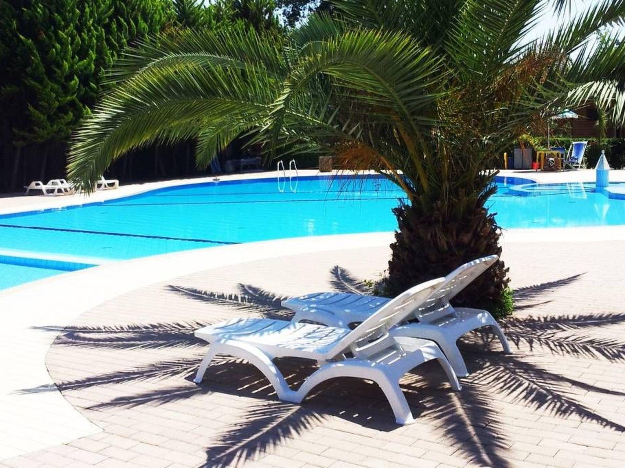 Draußen gibt es eine große, überdachte und möblierte Veranda von 7 x 2 m. Neben dem Mobilheim gibt es einen Parkplatz. Vom Campingplatz aus gibt es einen Shuttlebus zum Meer. Außerdem gibt es einen großen Kinderspielplatz mit sechs großen Trampolinen, einen Fußballplatz, Klettergerüste und ein gemeinsames Schwimmbad. Außerdem gibt es ein Restaurant, einen Supermarkt, ein Geschäft mit Campingausrüstung und einen Fahrrad- und Mountainbike-Verleih. Der Campingplatz hat eine Kapazität von ca. 400 Plätzen und es gibt eine Rezeption, an der Italienisch, Deutsch und Englisch gesprochen wird.