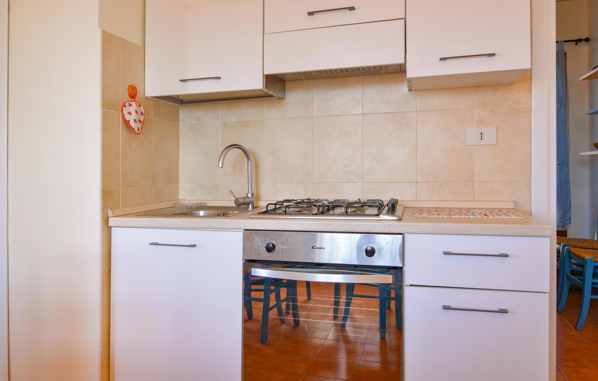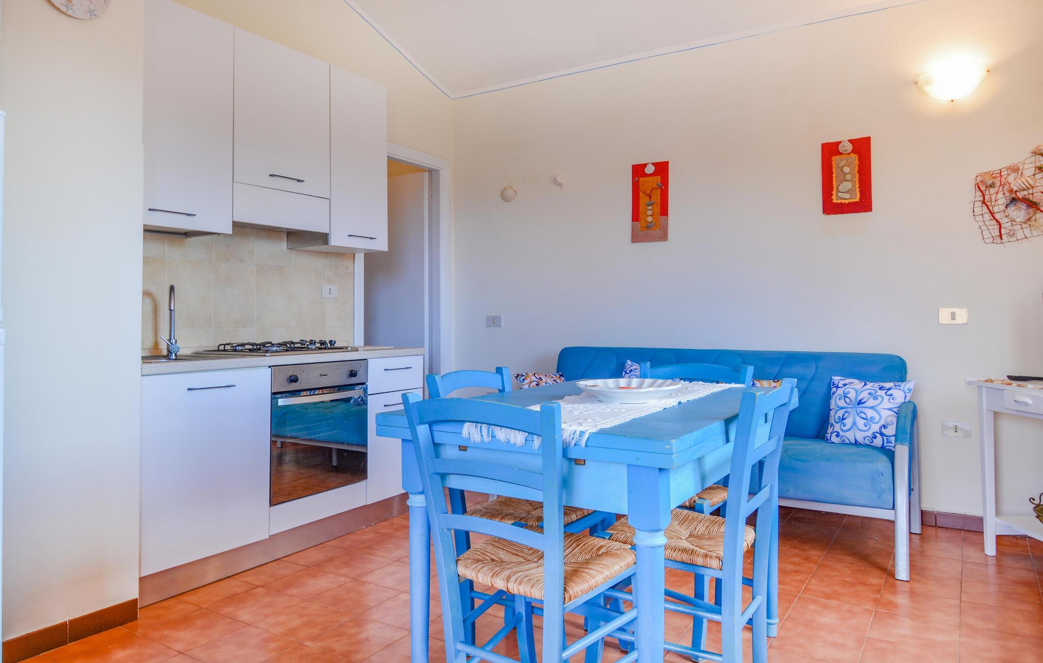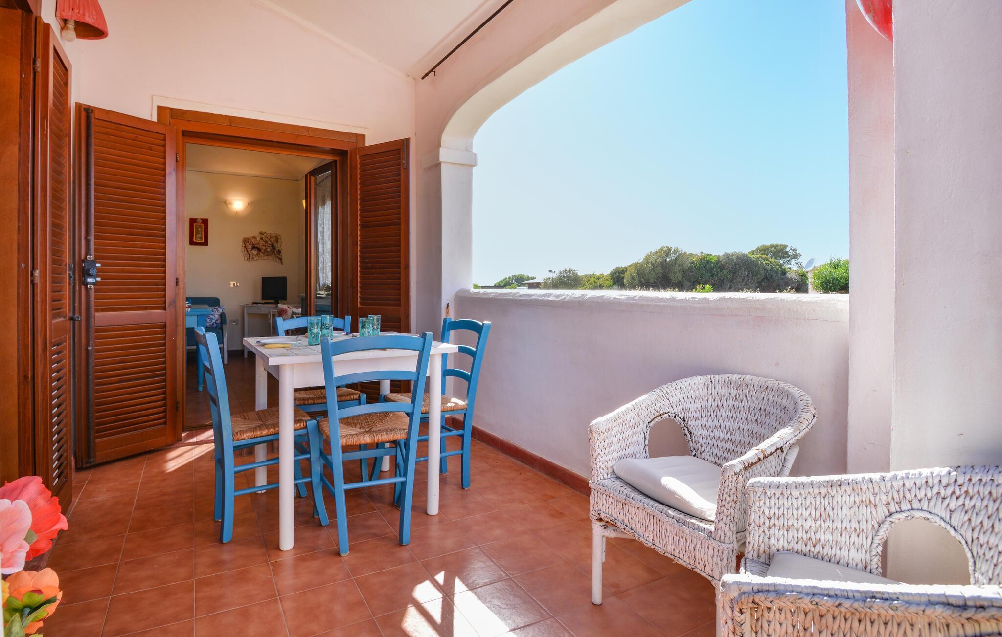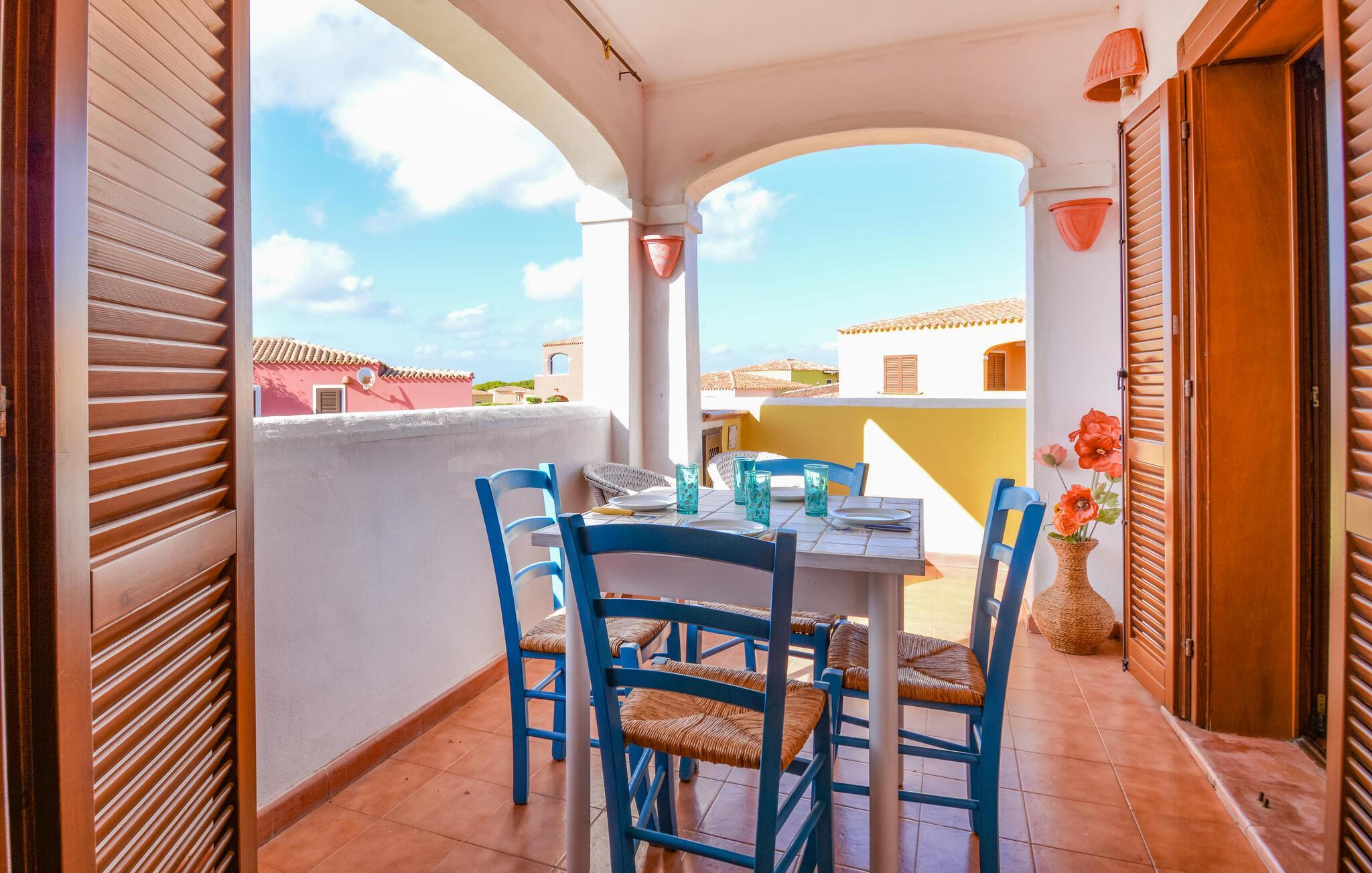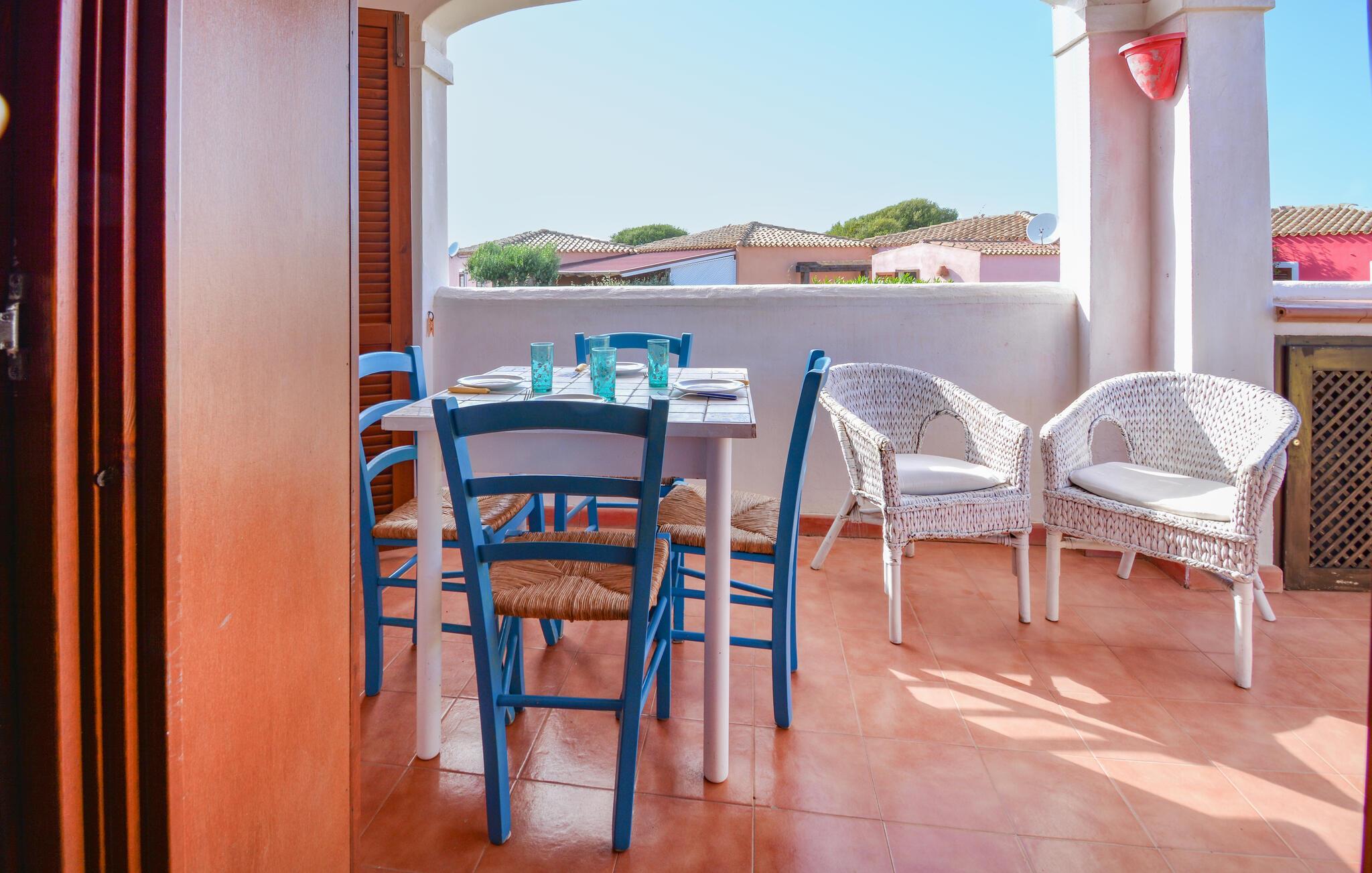 Freuen Sie sich auf diese Ferienwohnung, die den idealen Ausgangspunkt für Ihre Entdeckungsreisen darstellt. Ihre gemütliche Ferienwohnung in Vignola Mare im Norden Sardiniens lädt mit ihrer freundlichen Atmosphäre und farbenfrohen Gestaltung sofort zum Wohlfühlen ein. Starten Sie Ihren Tag auf dem Balkon, wo Sie bei einem Frühstück den Blick über die umliegenden mediterranen Häuser und den klaren Himmel genießen können. Entspannen Sie sich im hellen und offenen Wohnbereich, der mit bequemen Möbeln und einem Essbereich ausgestattet ist.