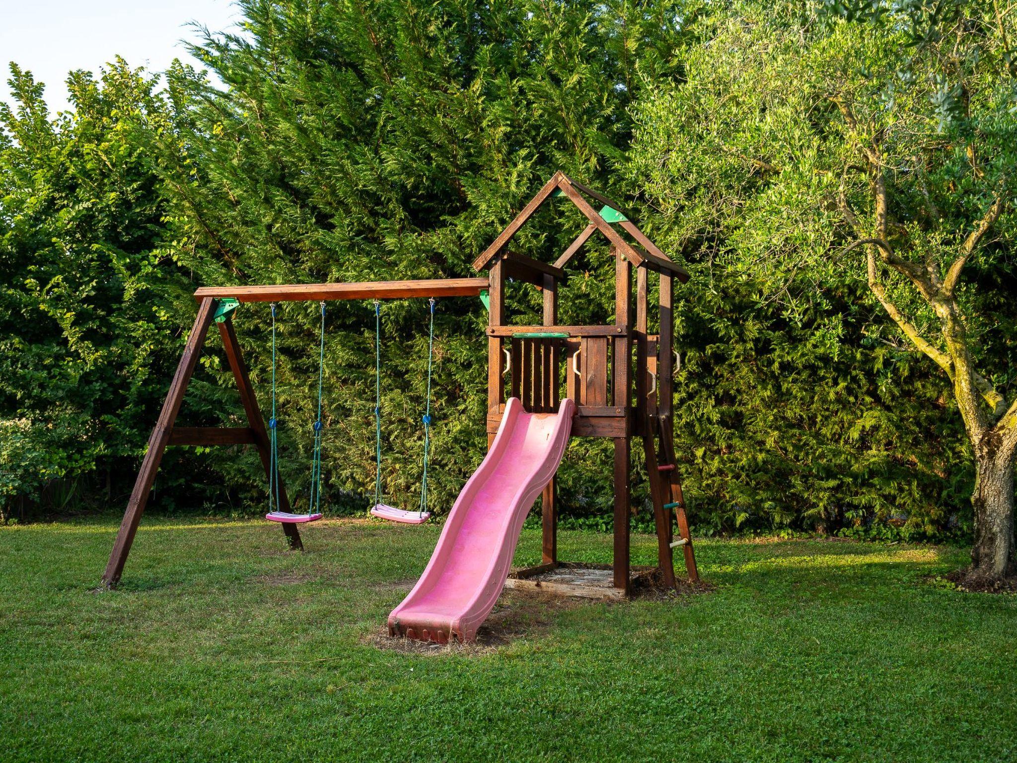 Im Außenbereich lädt der Gemeinschaftsgarten zu angenehmen Momenten an der frischen Luft ein, sei es zum Entspannen im Whirlpool oder im Gegenstromschwimmbad, die beide beheizt sind, oder zum Vergnügen mit den Kleinen auf dem vorhandenen Spielplatz. Das gepflegte Grün schafft hier eine Oase des Friedens und der Ruhe, ideal, um vom Alltag abzuschalten und sich mit der Natur zu verbinden.