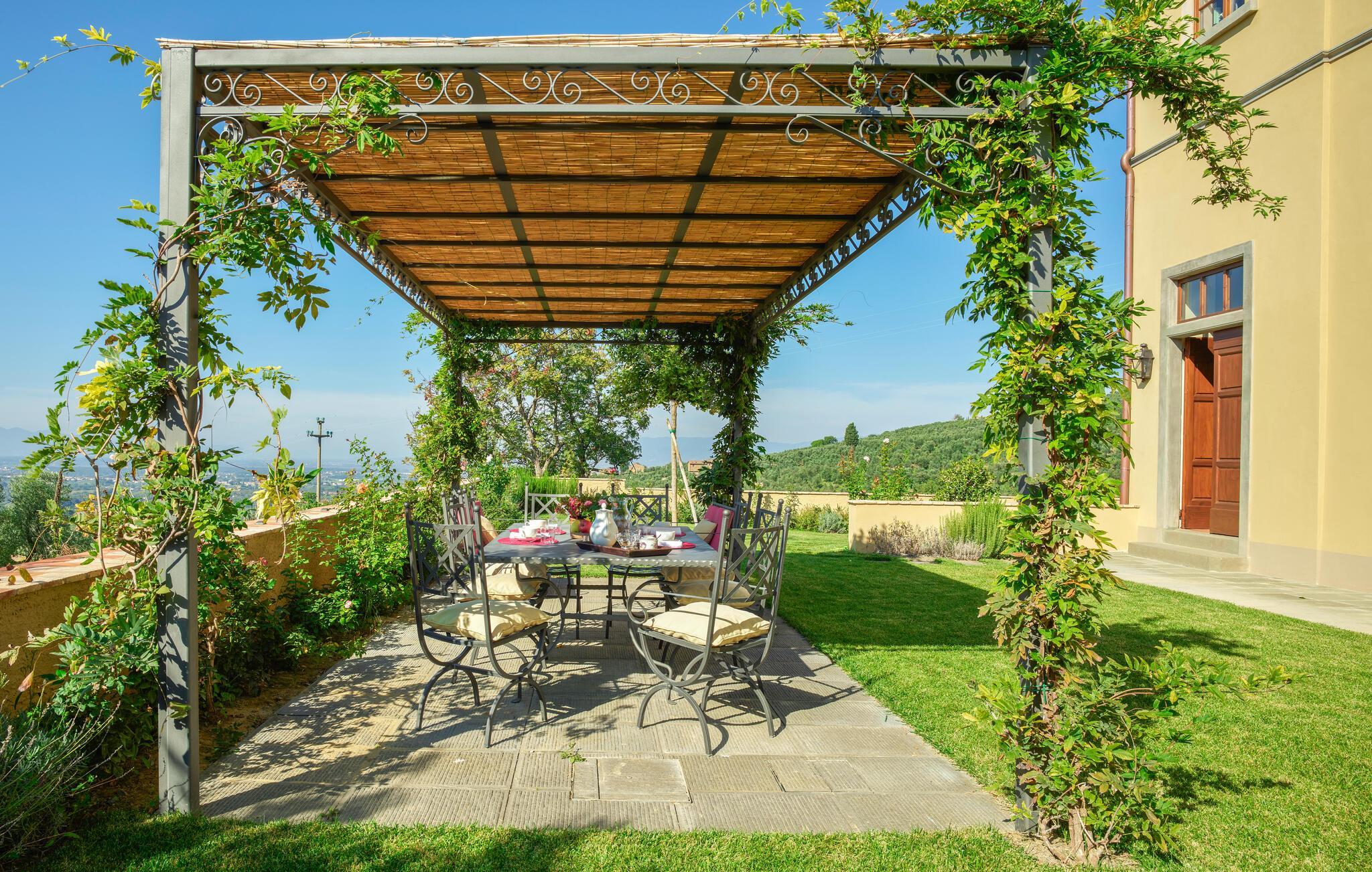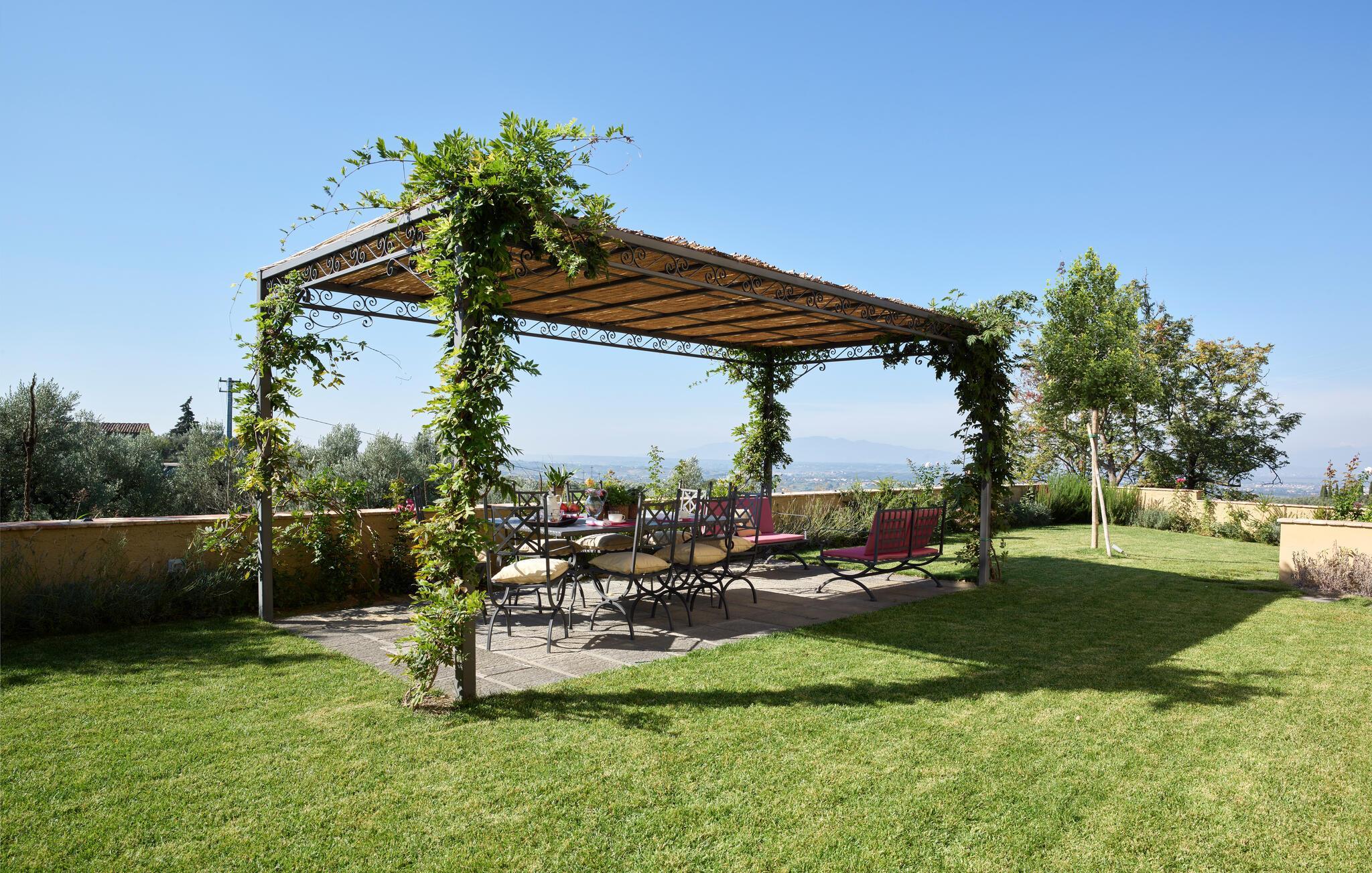 Dank seiner erhöhten Lage genießen Sie auch vom weitläufigen Außenbereich einen wunderschönen Blick über die Landschaft. Servieren Sie Ihr Frühstück unter der romantischen Pergola und freuen Sie sich auf laue Sommerabende, die Sie bei Wein und Kerzenschein ausklingen lassen.
