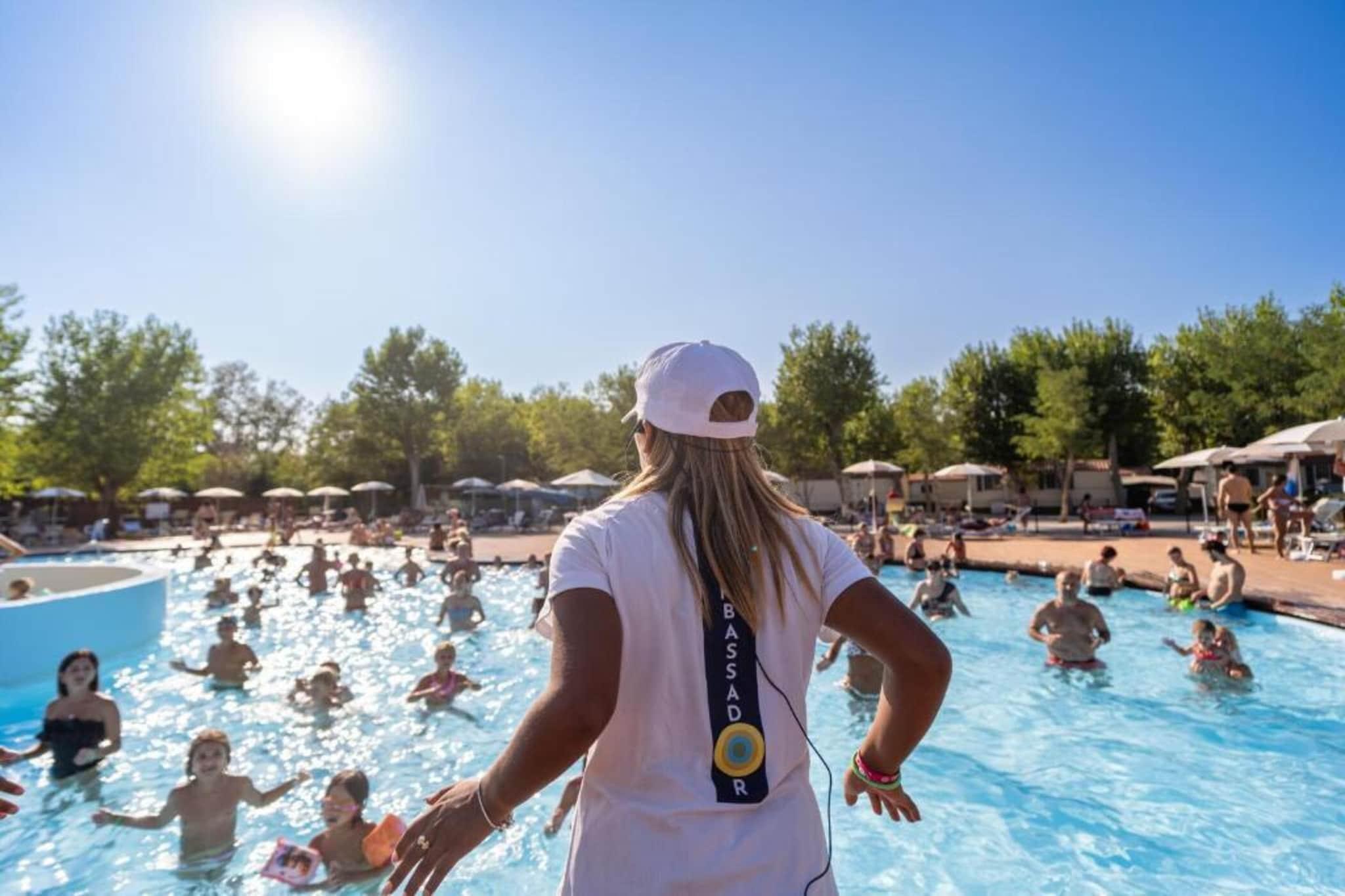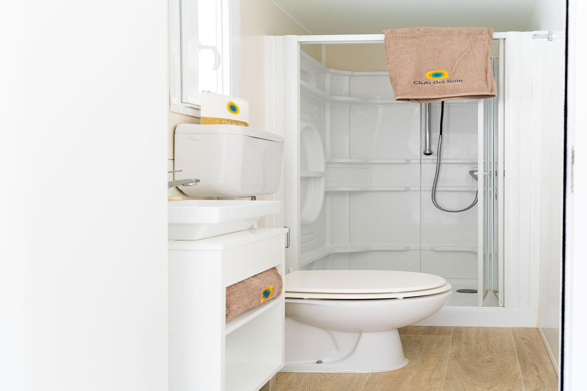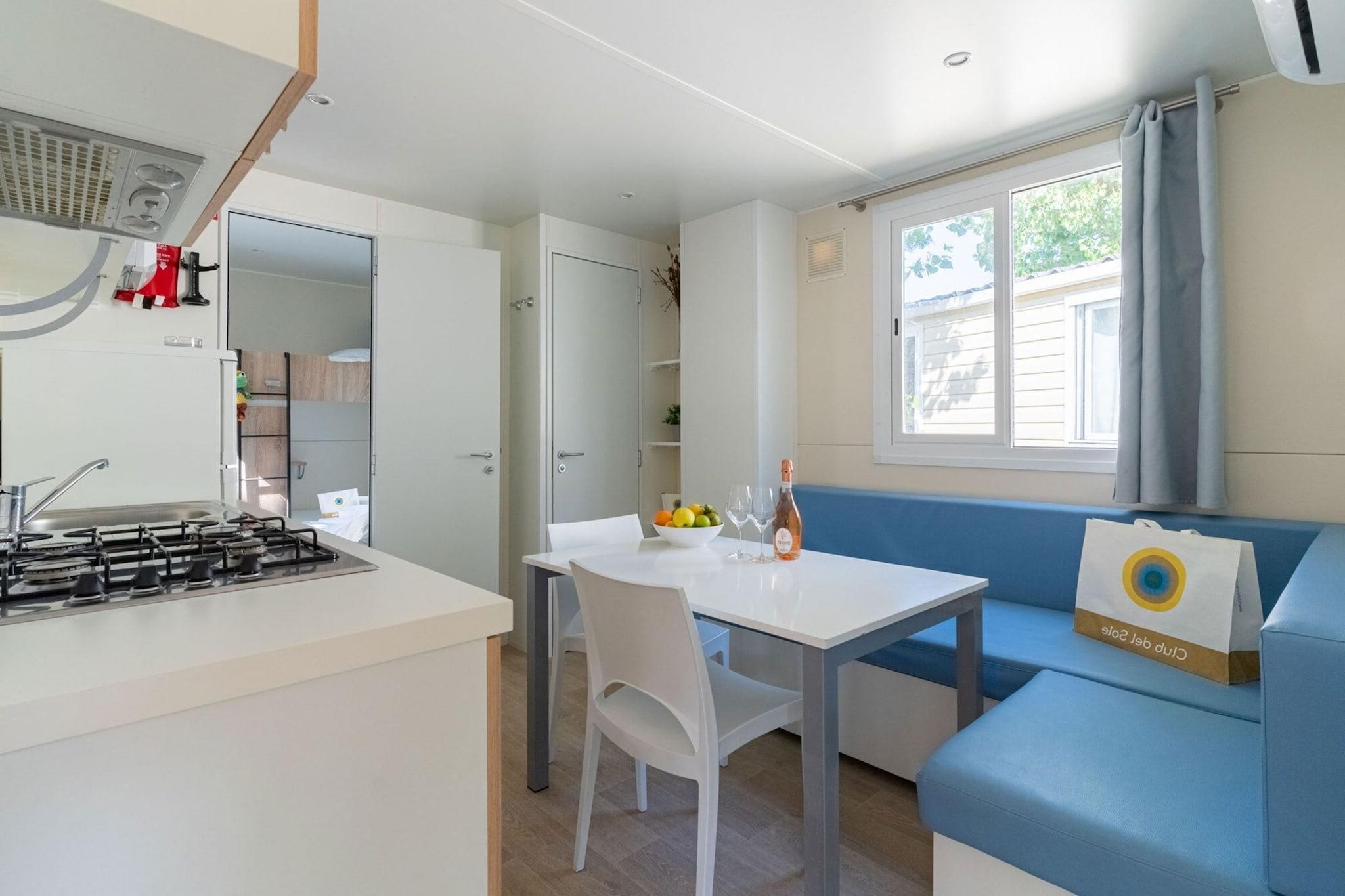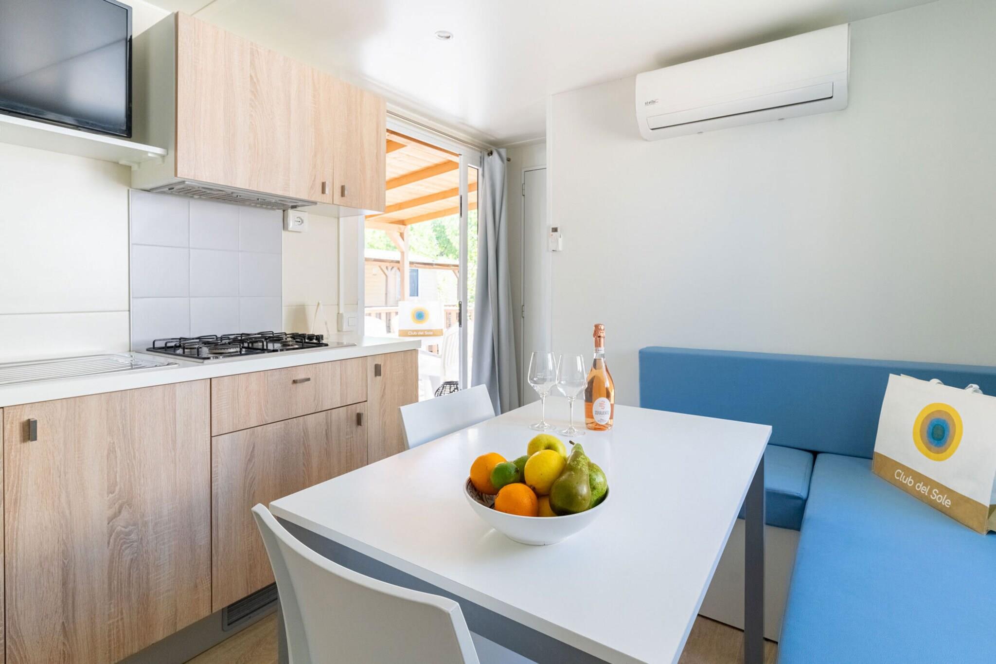 Parterre: (Wohnzimmer(Schlafcouch 1 Pers., TV), Kochnische(Kochplatte(Gas), Mikrowelle, Kühl-/Gefrierkombination), Schlafzimmer(Doppelbett), Schlafzimmer(Einzelbett, Einzelbett, Hochbett 1 Person ), Badezimmer(Dusche, Toilette), Veranda(Gartenmöbel), Klimaanlage) Rezeption, Waschgelegenheit, Parkplatz, Animationsteam, Supermarkt, Fahrradverleih, Sportplatz, Tischtennisplatte, Restaurant, Bar, Kinderklub, Spielplatz, Whirlwanne, Liegen, Sonnenschirm, Pool(Gemeinschaftliche Nutzung mit anderen Gästen, im Garten, Einschließlich Kinderschwimmbad (Tiefe 50cm), geöffnet von 1/2 Mai bis einschließlich 1/2 Sep), Padeltennisplatz