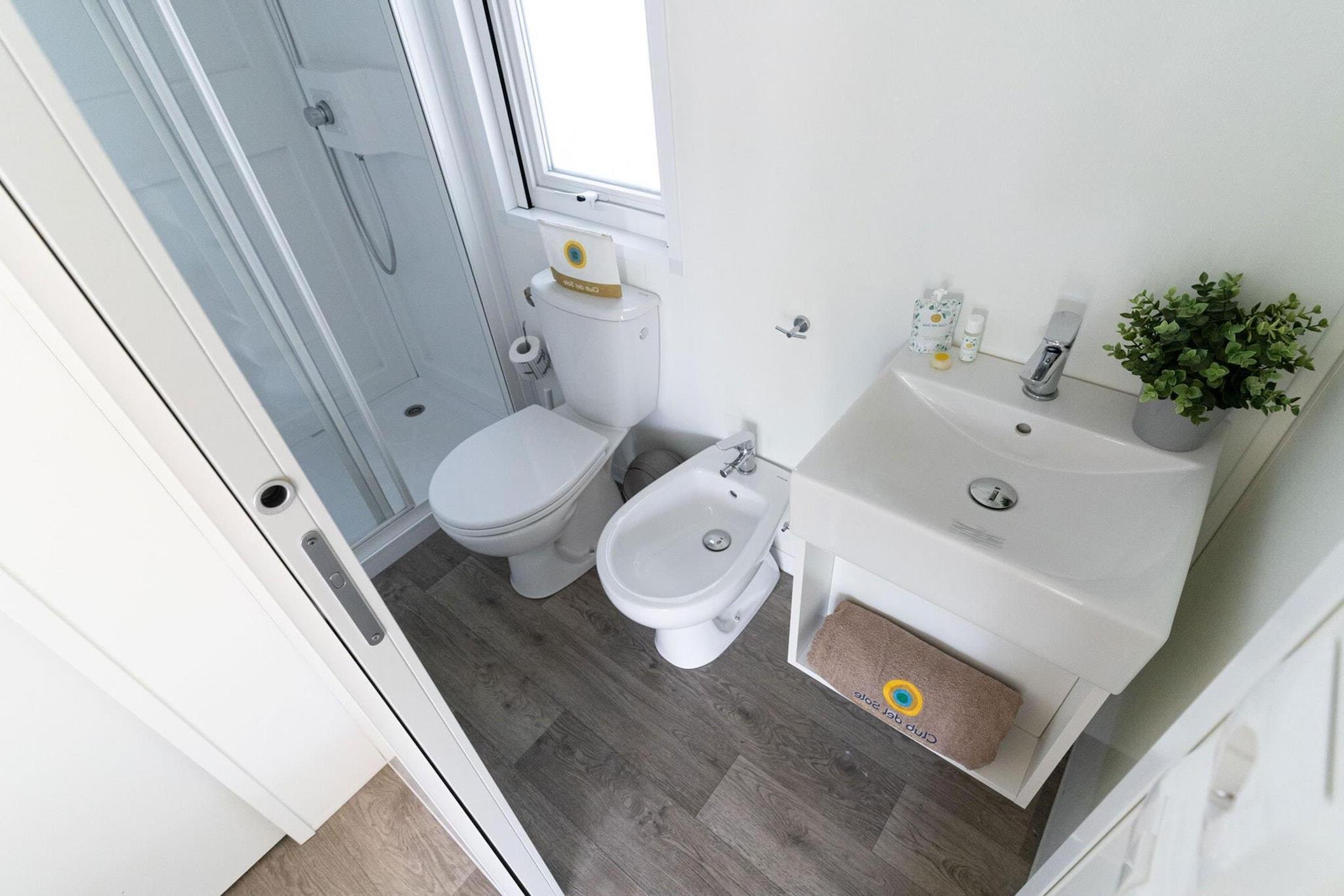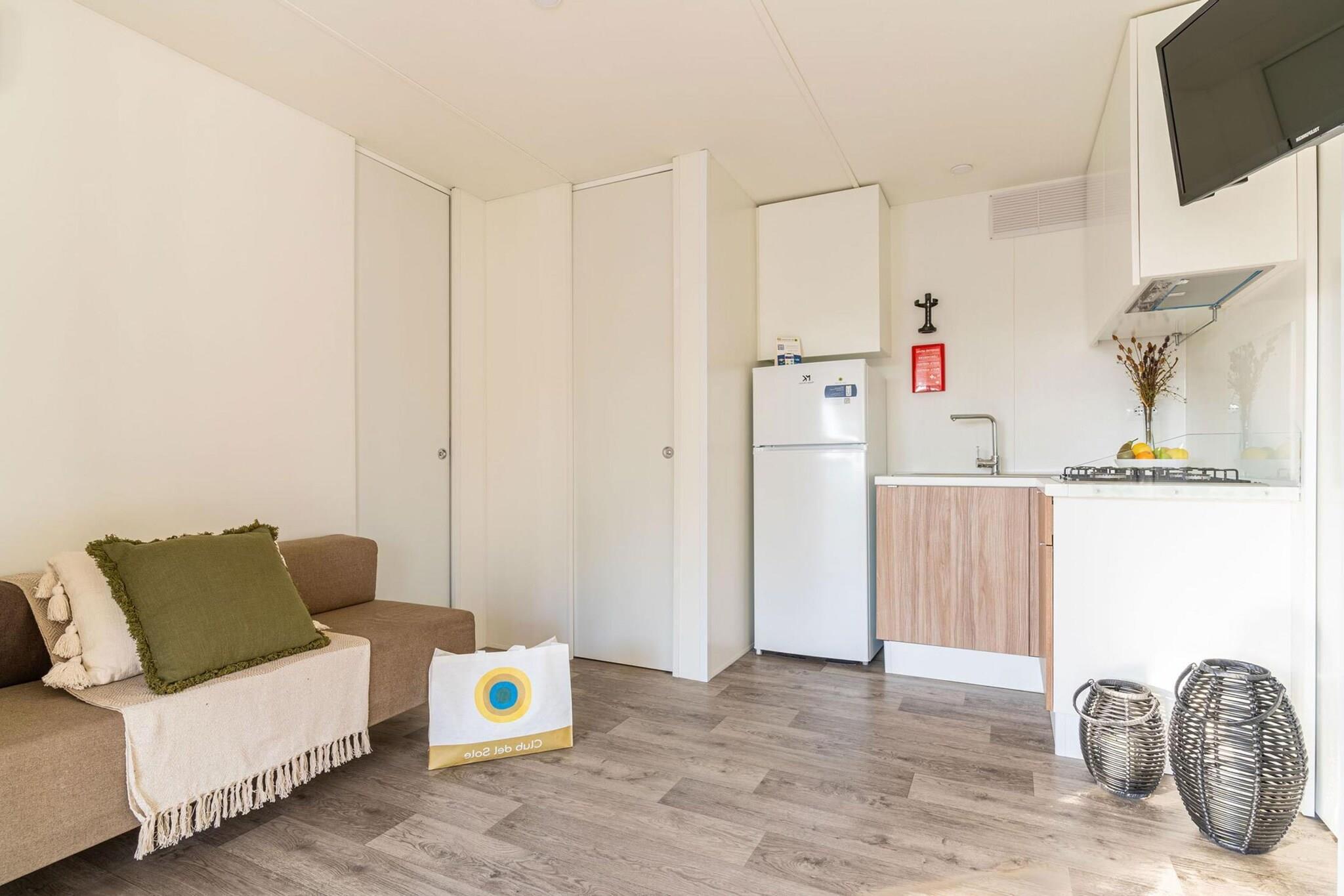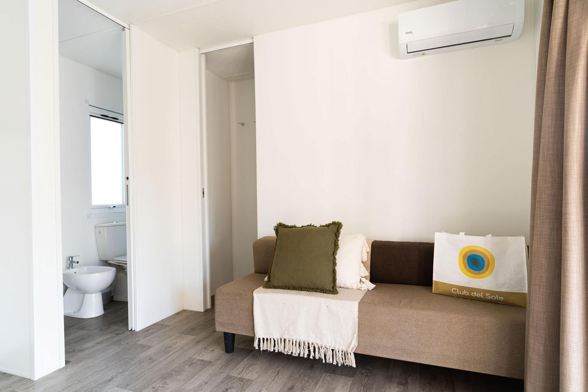 Parterre: (Wohnzimmer(Schlafcouch 1 Pers., TV), Kochnische(Kochplatte(Gas), Mikrowelle, Kühl-/Gefrierkombination), Schlafzimmer(Doppelbett), Schlafzimmer(Einzelbett, Einzelbett), Schlafzimmer(Einzelbett, Einzelbett), Badezimmer(Dusche, Toilette, Bidet), Veranda(Gartenmöbel), Klimaanlage) Rezeption, Waschgelegenheit, Parkplatz, Animationsteam, Supermarkt, Fahrradverleih, Sportplatz, Tischtennisplatte, Restaurant, Bar, Kinderklub, Spielplatz, Whirlwanne, Liegen, Sonnenschirm, Pool(Gemeinschaftliche Nutzung mit anderen Gästen, im Garten, Einschließlich Kinderschwimmbad (Tiefe 50cm), geöffnet von 1/2 Mai bis einschließlich 1/2 Sep), Padeltennisplatz