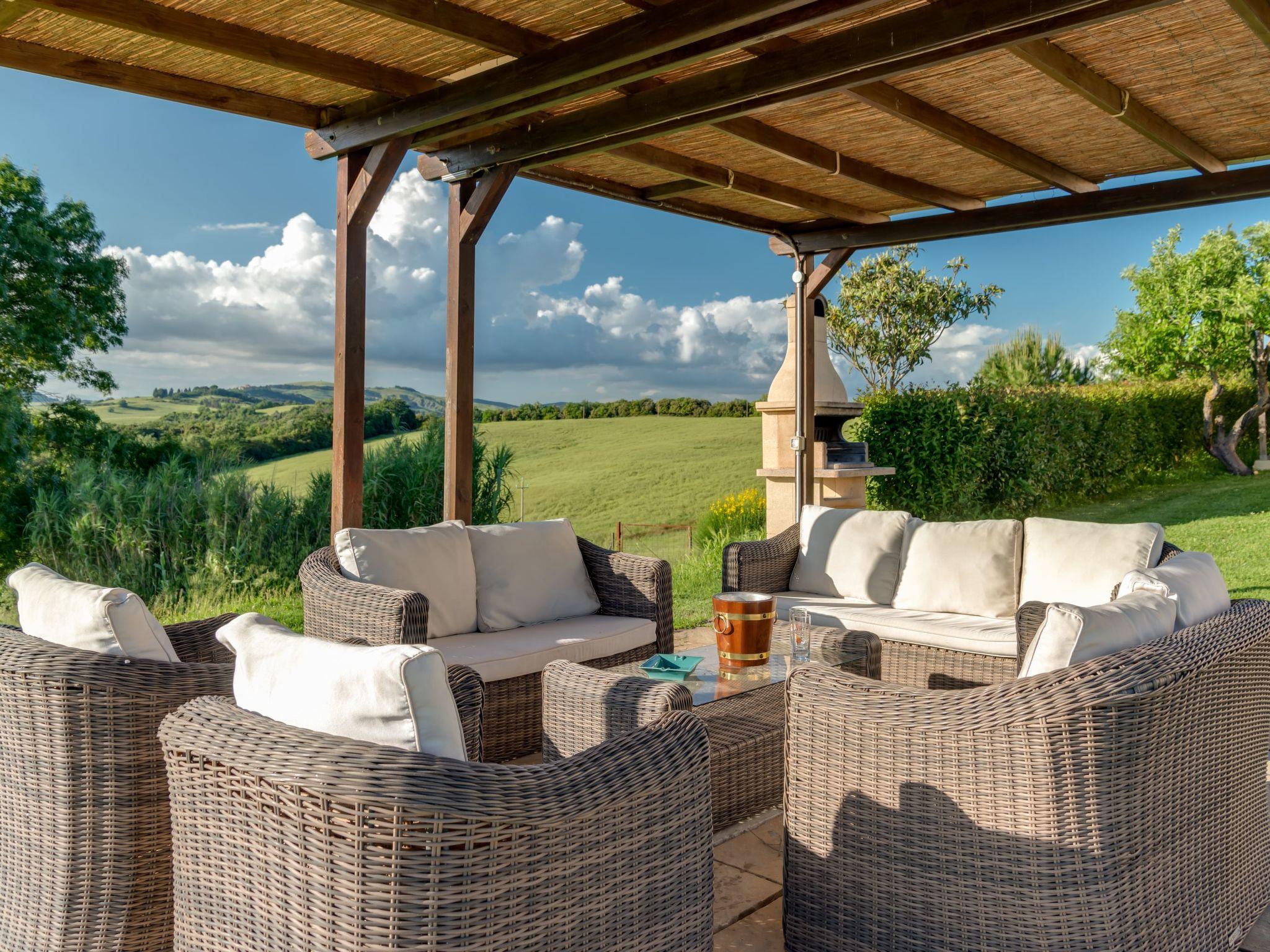 Villanovia ist ein konservativ restauriertes Beispiel für ein historisches toskanisches Bauernhaus: es ist rustikal und original erhalten, aber modern ausgestattet. Sein unverwechselbarer besonderer Charakter sorgt für eine gemütliche und warme Atmosphäre. Das Haus verfügt über 700 qm Wohnfläche und 37 Hektar Privatgrundstück. Einzigartig gelegen auf einer Hügelkuppe im Naturpark von Berignone, mit Blick auf das Cecina-Tal, die Städte Volterra und Pomarance, die Metallischen Hügel und Larderello, mit den sichtbaren geothermischen Dämpfen. Es liegt abseits der ausgetretenen Pfade und ist die Fahrt über die unbefestigte Straße bis zum ersten Dorf Mazzolla wert! Der Aufenthalt in unserem Anwesen bietet Ihnen einen 360°-Blick auf die unberührte Toskana, ihre Geschichte und ihre Hügel. Und Sie und Ihre Familie werden es lieben! Das Haus bietet Platz für 20 Personen + 10 Einzelbetten (2/3 Babybetten auf Anfrage) in komfortablen Zimmern oder gemütlichen Appartements mit eigener Kochnische. Jede Unterkunft hat ein eigenes Bad. Der Eingang im Erdgeschoss aus dem 16. Jahrhundert (ganz aus Stein) ist der älteste Teil des Hauses. Hier gibt es eine Sofaecke mit Satellitenfernsehen und eine Innentreppe zum Obergeschoss, wo sich 6 Unterkünfte befinden, sowie eine Terrasse mit Blick auf Volterra. Perfekt gelegen für einen entspannten Urlaub, bietet es gleichzeitig kurze Fahrten zu den Städten Volterra (9 km), Pisa, Siena (jeweils ca. 60 km), San Gimignano und Florenz sowie zu den Stränden der Etruskerküste (45 km). Eine große Küche und ein beeindruckendes 170 m² großes Wohnzimmer mit Steinmauern und originalen Ziegelbögen vervollständigen das Anwesen. Der Panoramaschwimmbad ist 5x12, eingezäunt für die Sicherheit der Kinder. Unser Premium-Service ist der stilvolle Innenraum mit Sprudelbecken, erfrischend und entspannend. Es ist der Umgebung der etruskischen Thermalquellen nachempfunden, in rustikalem Mauerwerk und Stein. Wi-Fi (150 Mb) steht kostenlos zur Verfügung und eignet sich für die Fernarbeit.