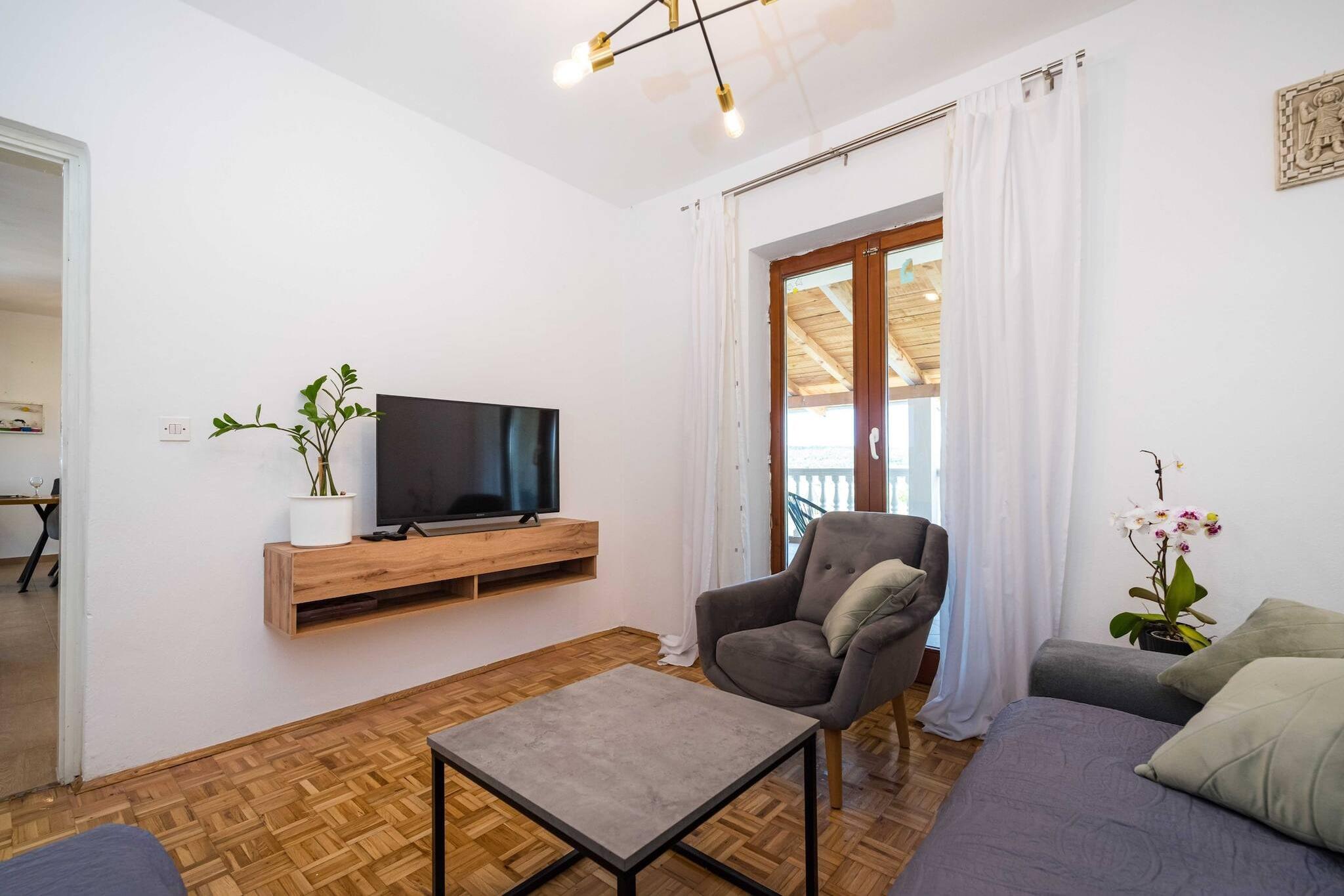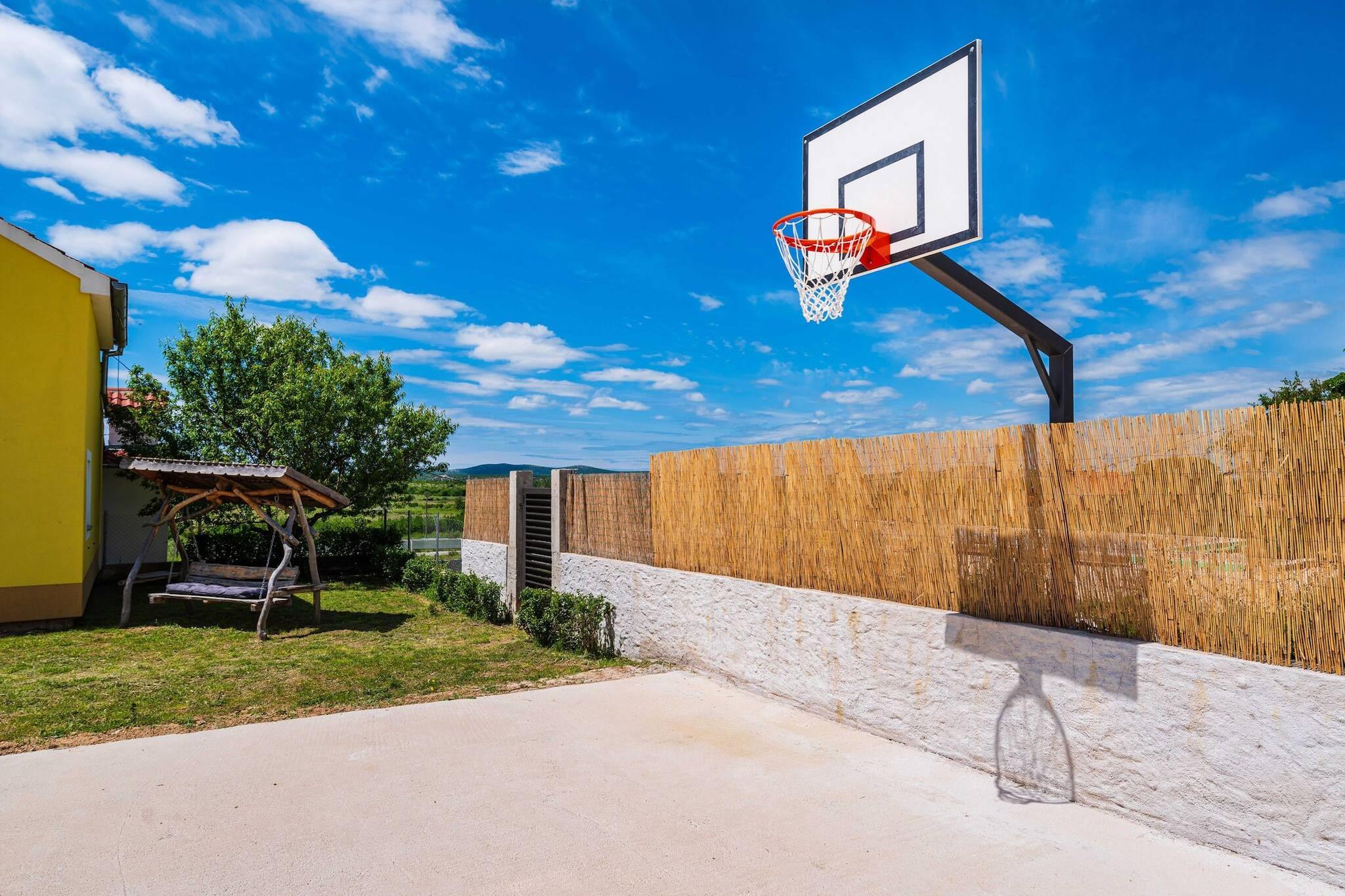 Dieser wunderschöne Rückzugsort auf dem Land befindet sich im ruhigen Hinterland von Šibenik, nur 20 km vom nächsten Strand entfernt und in der Nähe des Nationalparks Krka. Umgeben von unberührter Natur bietet er absolute Privatsphäre und einen erholsamen Rückzugsort für Familien oder Gruppen von bis zu 8 Gästen. Das Anwesen verfügt über einen privaten Swimmingpool mit Hydromassagebereich, einen Basketballplatz und einen Kinderspielplatz und bietet somit den perfekten Rahmen für einen ruhigen Urlaub in der Natur. Das neu renovierte zweistöckige Haus verfügt über drei Schlafzimmer, zwei Badezimmer, einen hellen Wohn- und Essbereich und eine voll ausgestattete offene Küche. Im Obergeschoss bietet ein geräumiger Balkon einen Blick auf die grüne Umgebung und die nahe gelegenen Hügel. Die große überdachte Terrasse verfügt über einen Steingrill, einen Essbereich im Freien und eine Sitzecke mit Fernseher – ideal für entspannte Nachmittage und Familienessen. Die Gäste können frische, umweltfreundliche Produkte aus dem Garten genießen, die von den freundlichen Gastgebern, die eine nahe gelegene Farm besitzen, bereitgestellt werden. Die Lage ist perfekt, um Dalmatien zu erkunden. Der Nationalpark Krka, der Vrana-See und die Küstenstädte Vodice und Pirovac sind nur eine kurze Autofahrt entfernt. Die Städte Zadar und Split sind weniger als eine Stunde entfernt, während Šibenik in nur 30 Minuten erreicht werden kann. Dieses Ferienhaus vereint Komfort, Natur und Bequemlichkeit und ist eine ausgezeichnete Wahl für einen entspannten und authentischen Urlaub am Mittelmeer.