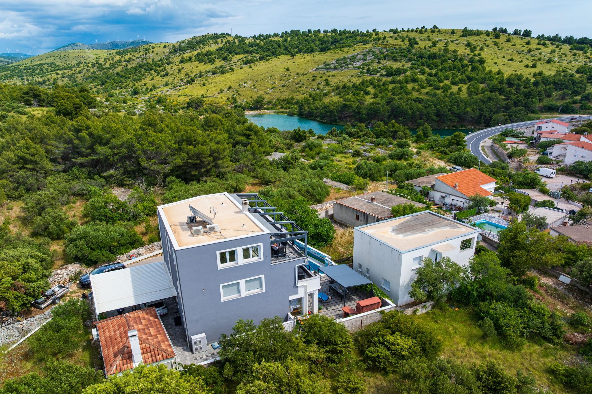 Dieses moderne Apartment mit privatem Pool befindet sich im ruhigen Küstendorf Zaboric in der Nähe von Sibenik, nur 350 Meter vom nächsten Kieselstrand entfernt. Umgeben von einer friedlichen Atmosphäre ist es ideal für Paare oder kleine Familien, die Entspannung abseits der großen Sommermassen suchen. Das Apartment im Erdgeschoss bietet ein komfortables Schlafzimmer, ein modernes Badezimmer, eine voll ausgestattete offene Küche und einen hellen Wohn- und Essbereich mit direktem Zugang zu einer privaten Terrasse. Im Außenbereich können die Gäste einen großzügigen, umzäunten Garten mit privatem Swimmingpool, Sonnenliegen und einer großen überdachten Terrasse genießen, die für Mahlzeiten im Freien ausgestattet ist. Ein Grillplatz und ein privater Parkplatz für zwei Fahrzeuge sind ebenfalls vorhanden, ebenso wie schnelles WLAN für einen komfortablen Aufenthalt. Nur wenige Gehminuten entfernt finden Sie einen Lebensmittelladen, ein Café und ein lokales Restaurant, das traditionelle dalmatinische Küche serviert. Die historische Stadt Sibenik ist nur 11 Kilometer entfernt. Dort können Sie charmante Kopfsteinpflasterstraßen, Strandpromenaden und kulturelle Sehenswürdigkeiten erkunden. Naturliebhaber werden einen Besuch im Nationalpark Krka genießen, der nur 20 Kilometer von der Unterkunft entfernt liegt und für seine Wasserfälle und malerischen Wanderwege bekannt ist. Sowohl Split als auch Zadar sind innerhalb einer Autostunde zu erreichen, sodass die Wohnung ein idealer Ausgangspunkt für Ausflüge an die dalmatinische Küste ist. Dieses gut ausgestattete Ferienhaus verbindet Komfort, Privatsphäre und eine großartige Lage in Meeresnähe – perfekt für einen erholsamen Urlaub am Mittelmeer.