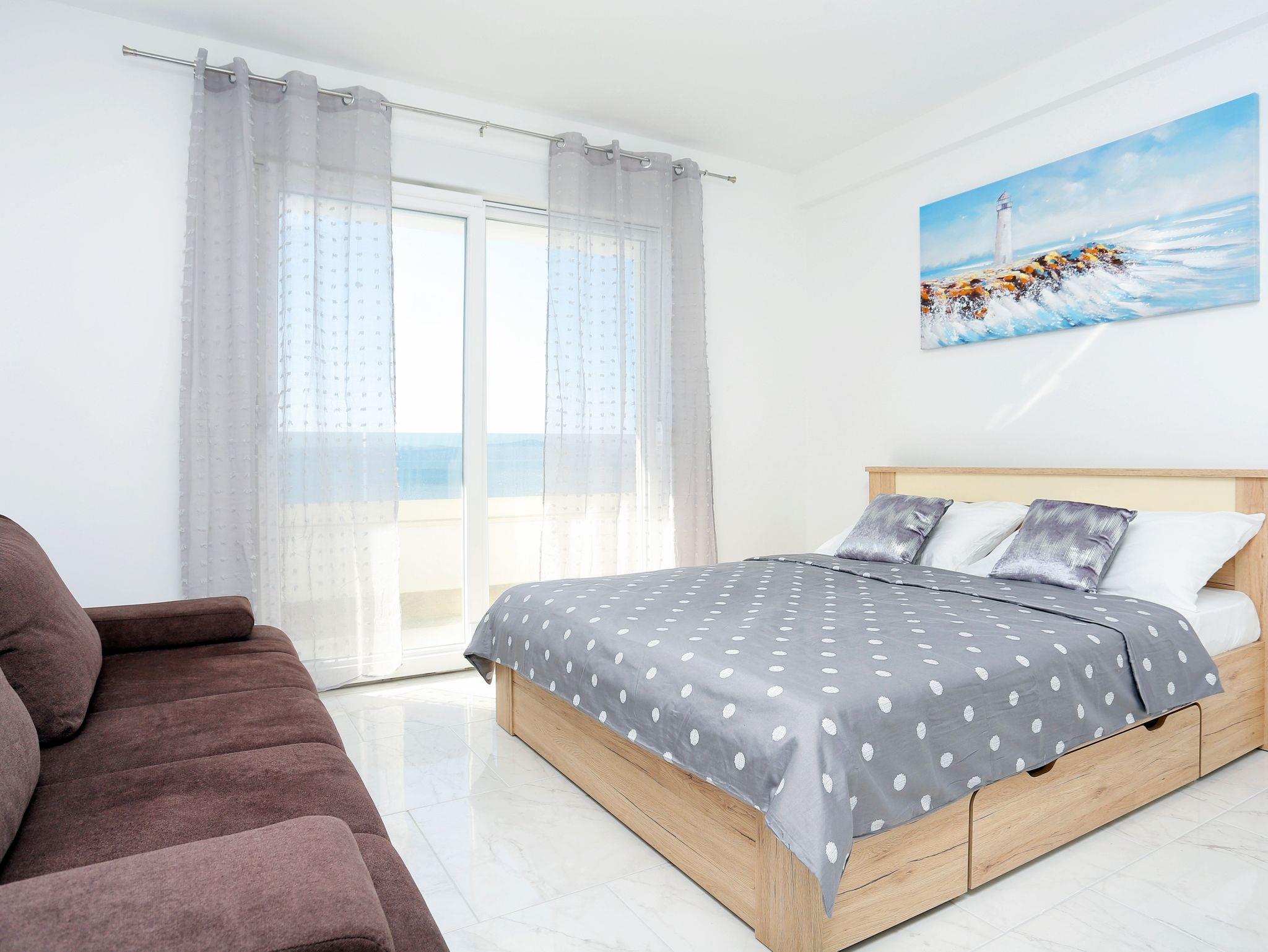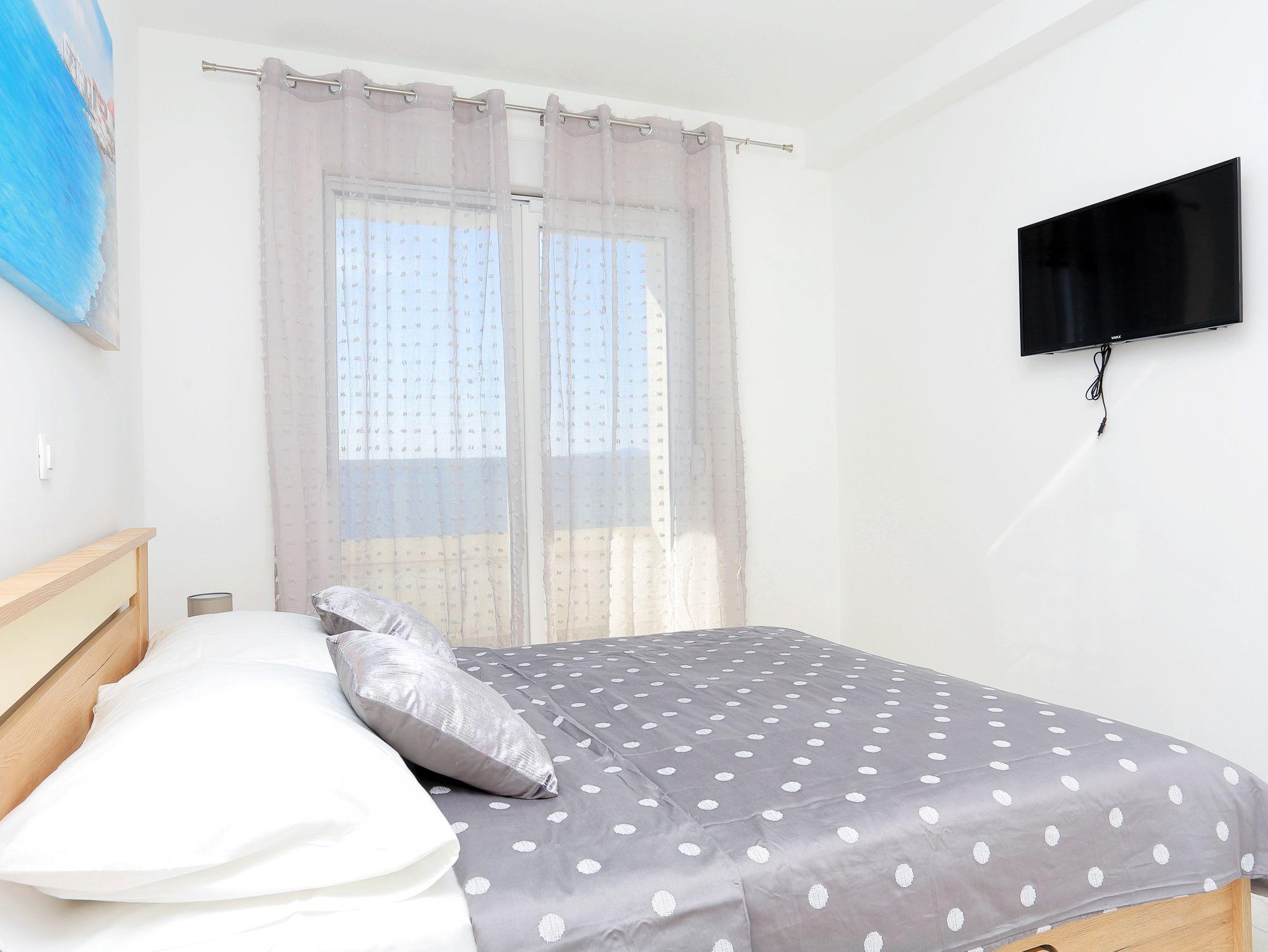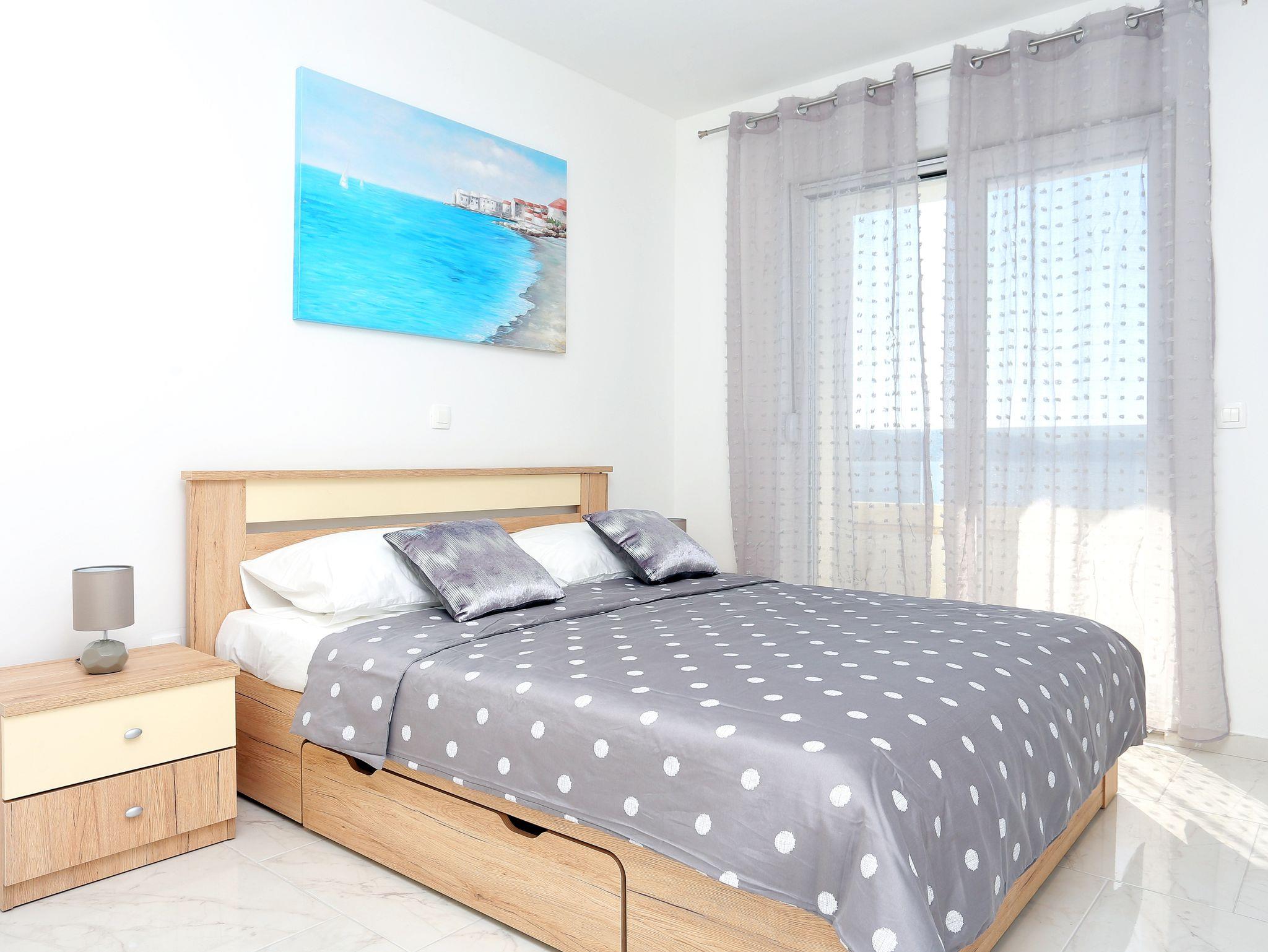 Ferienwohnung bietet Platz für 5 Gäste. Die Betten sind in Schlafzimmern, die es 1 gibt, und in Wohnzimmer, innerhalb einer Gesamtfläche von 41m2, angeordnet. Die Gäste haben eine eigene Terrasse zur Verfügung, auf der sie in warmen Sommernächten genießen können. Das Apartment bietet Meerblick. Während ihres Aufenthalts können Gäste das gemeinsam zur Nutzung stehende Schwimmbad benutzen. IM PREIS INBEGRIFFEN: Kurtaxe, Endreinigung, Klimatisierung, Pool, Parkplatz, Internet, Bügeleisen, Bügelbrett, Föhn. VERBINDLICHE ZUSÄTZLICHE KOSTEN: Aufzahlung für Kurzaufenthalte (prozentualer Zuschlag pro Nächtigungsanzahl: 30% - 1, 20% - 2, 10% - 3). Die Verfügbarkeit zusätzlicher Dienstleistungen in Ihrem reservierten Termin und die Preise derselben (falls nicht aufgeführt) müssen im Voraus überprüft werden. Zusätzliche Dienstleistungen die in der Zahlungsaufforderung nicht aufgeführt sind werden direkt beim Vermieter bezahlt, angenommen der Gast nutzt auch diese. Ermäßigung auf den Grundpreis: Gratistag 21=19 (bei einem Aufenthalt von 21 Tagen oder mehr erhalten Sie 2 Gratistage für den Aufenthalt bis 31.12.26).