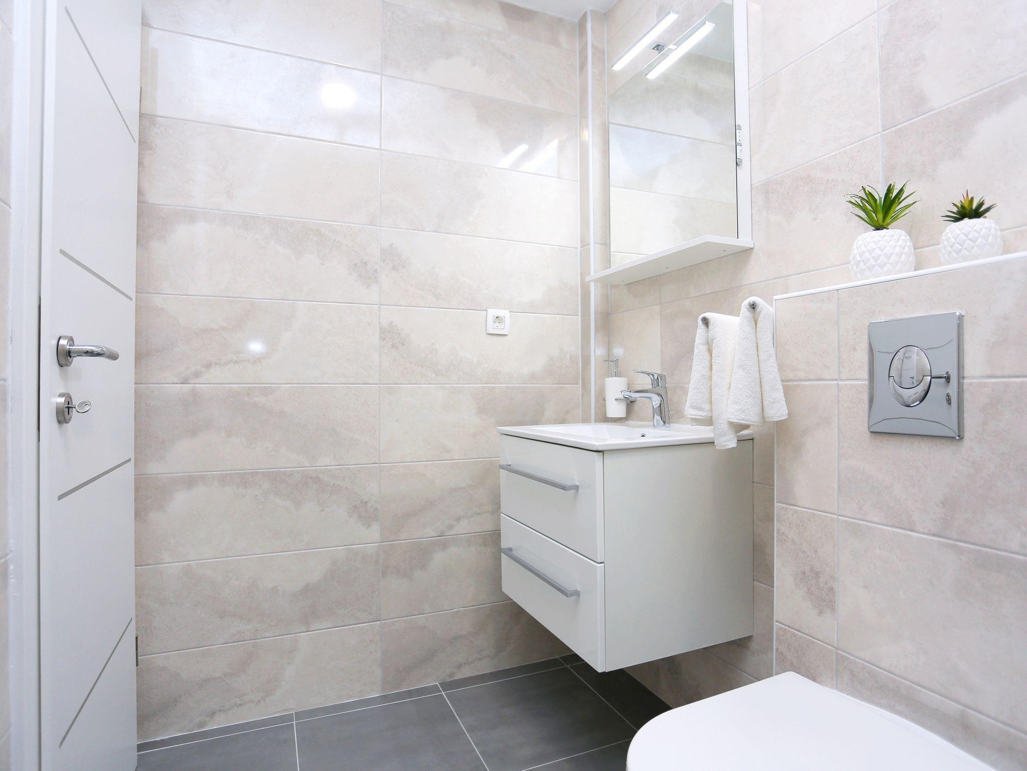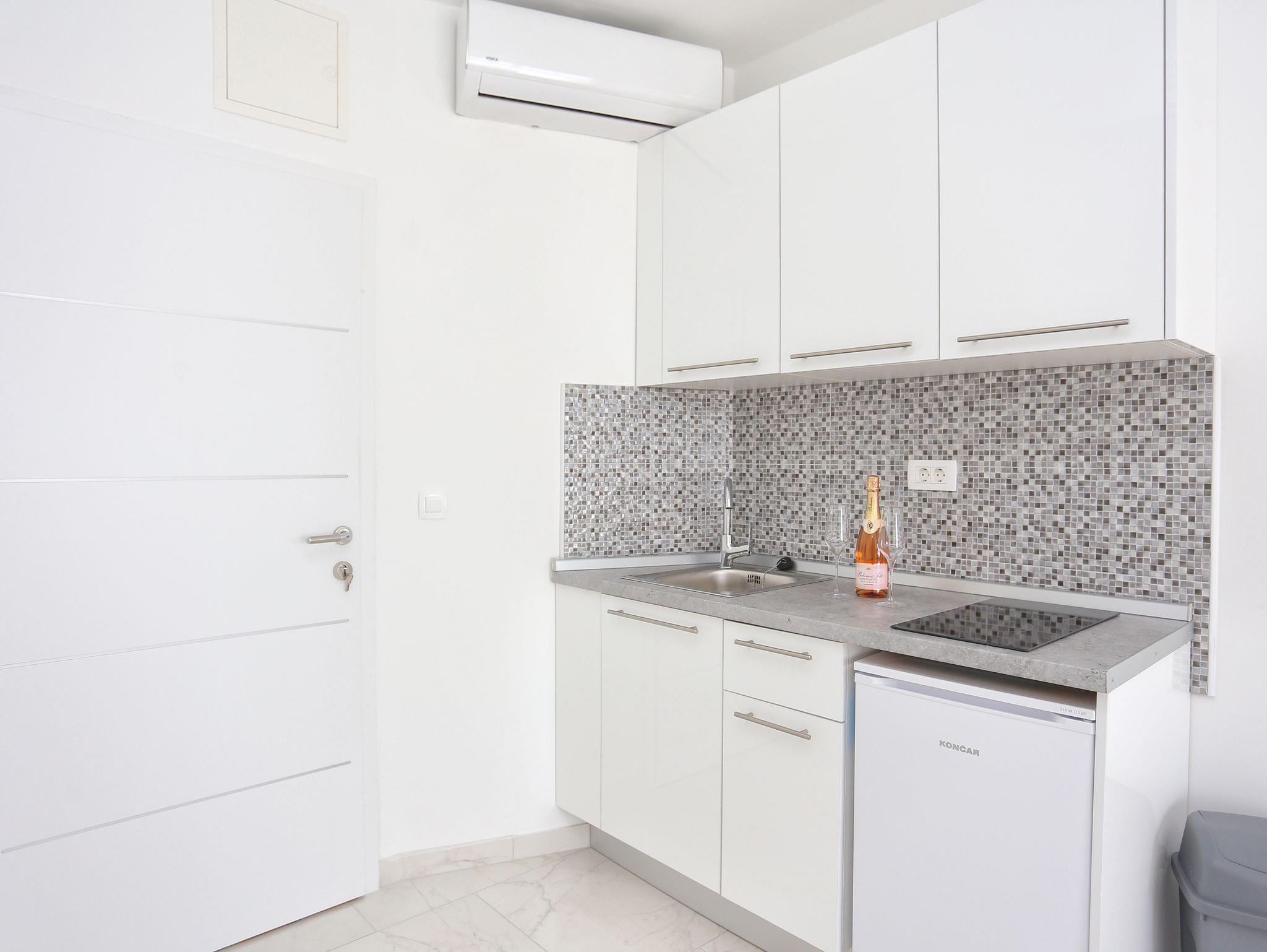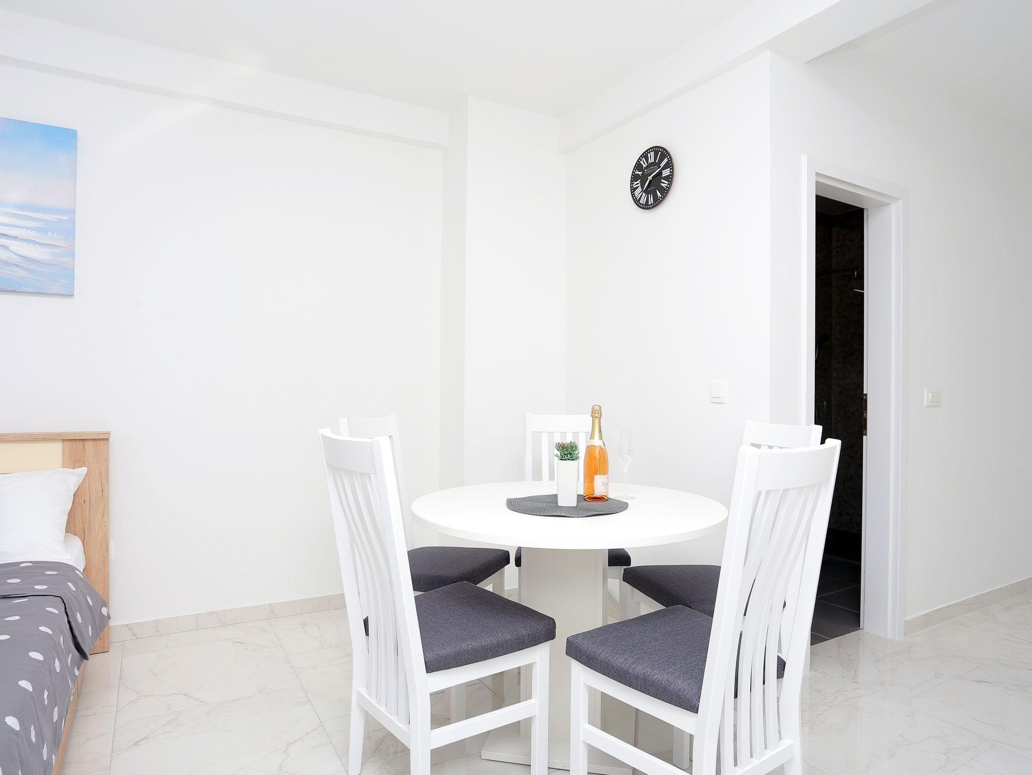 Ferienwohnung bietet Platz für 5 Gäste. Die Betten sind in Schlafzimmern, die es 1 gibt, und in Wohnzimmer, innerhalb einer Gesamtfläche von 41m2, angeordnet. Die Gäste haben eine eigene Terrasse zur Verfügung, auf der sie in warmen Sommernächten genießen können. Das Apartment bietet Meerblick. Während ihres Aufenthalts können Gäste das gemeinsam zur Nutzung stehende Schwimmbad benutzen. IM PREIS INBEGRIFFEN: Kurtaxe, Endreinigung, Klimatisierung, Pool, Parkplatz, Internet, Bügeleisen, Bügelbrett, Föhn. VERBINDLICHE ZUSÄTZLICHE KOSTEN: Aufzahlung für Kurzaufenthalte (prozentualer Zuschlag pro Nächtigungsanzahl: 30% - 1, 20% - 2, 10% - 3). Die Verfügbarkeit zusätzlicher Dienstleistungen in Ihrem reservierten Termin und die Preise derselben (falls nicht aufgeführt) müssen im Voraus überprüft werden. Zusätzliche Dienstleistungen die in der Zahlungsaufforderung nicht aufgeführt sind werden direkt beim Vermieter bezahlt, angenommen der Gast nutzt auch diese. Ermäßigung auf den Grundpreis: Gratistag 21=19 (bei einem Aufenthalt von 21 Tagen oder mehr erhalten Sie 2 Gratistage für den Aufenthalt bis 31.12.26).