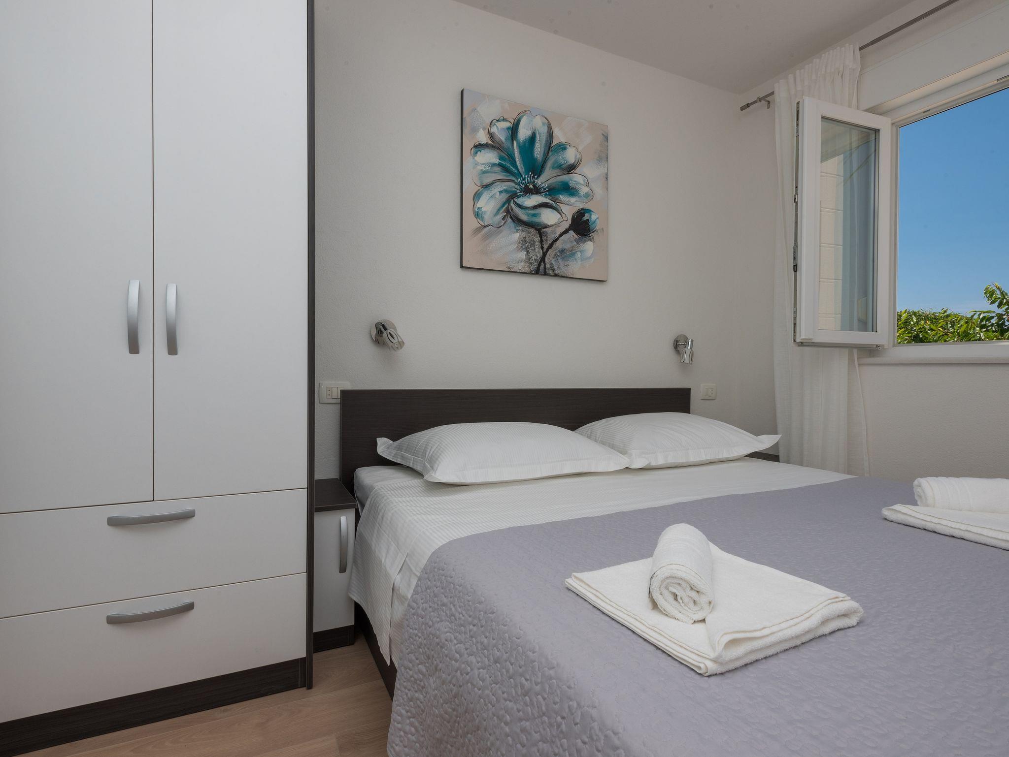 Ferienwohnung bietet Platz für 5 Gäste. Die Betten sind in Schlafzimmern, die es 3 gibt, innerhalb einer Gesamtfläche von 96m2, angeordnet. Die Gäste haben eine eigene Terrasse zur Verfügung, auf der sie in warmen Sommernächten genießen können. Das Apartment bietet Meerblick. Es ist erlaubt, Speisen auf dem Gemeinschafts-Grill vorzubereiten. IM PREIS INBEGRIFFEN: Kurtaxe, Endreinigung, Klimatisierung, Parkplatz, Internet, Bügeleisen, Bügelbrett, Föhn. Die Verfügbarkeit zusätzlicher Dienstleistungen in Ihrem reservierten Termin und die Preise derselben (falls nicht aufgeführt) müssen im Voraus überprüft werden. Zusätzliche Dienstleistungen die in der Zahlungsaufforderung nicht aufgeführt sind werden direkt beim Vermieter bezahlt, angenommen der Gast nutzt auch diese.