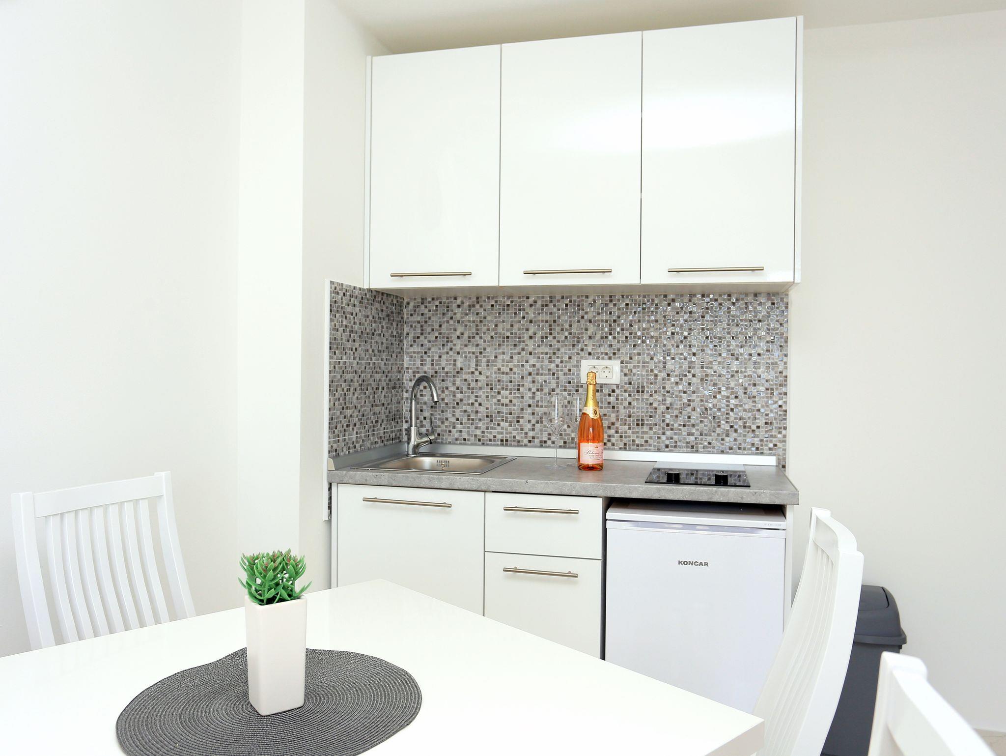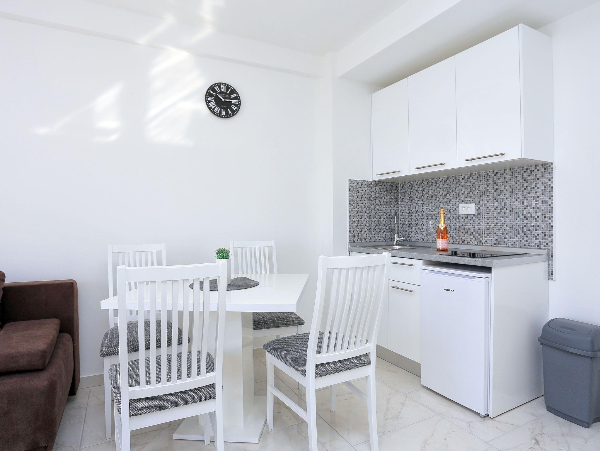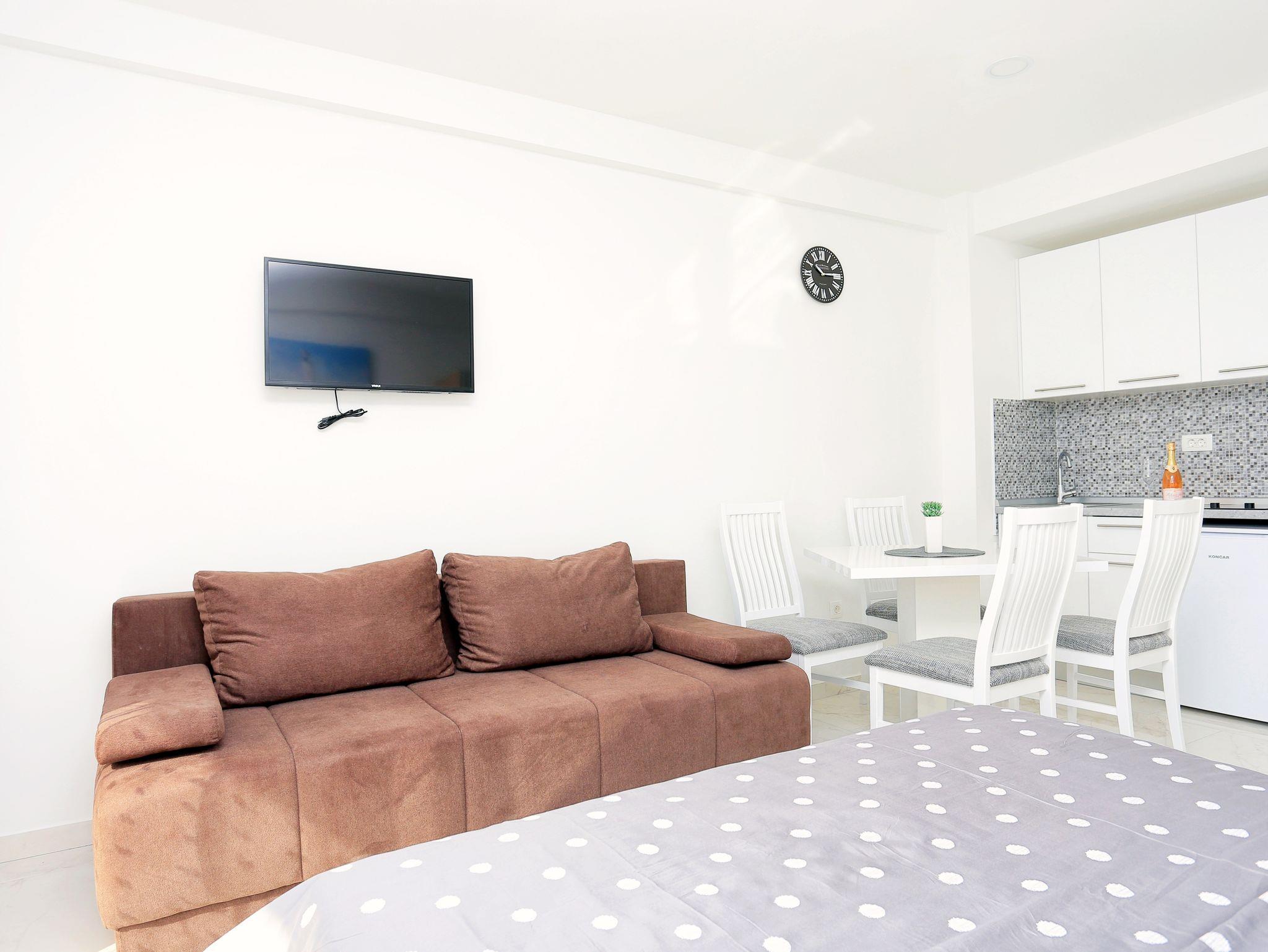 Studio bietet Platz für 3 Gäste. Die Betten sind in Schlafzimmern, die es 1 gibt, innerhalb einer Gesamtfläche von 26m2, angeordnet. Die Gäste haben eine eigene Terrasse zur Verfügung, auf der sie in warmen Sommernächten genießen können. Das Studio-Apartment bietet Meerblick. Während ihres Aufenthalts können Gäste das gemeinsam zur Nutzung stehende Schwimmbad benutzen. IM PREIS INBEGRIFFEN: Kurtaxe, Endreinigung, Klimatisierung, Pool, Parkplatz, Internet, Bügeleisen, Bügelbrett, Föhn. VERBINDLICHE ZUSÄTZLICHE KOSTEN: Aufzahlung für Kurzaufenthalte (prozentualer Zuschlag pro Nächtigungsanzahl: 30% - 1, 20% - 2, 10% - 3). Die Verfügbarkeit zusätzlicher Dienstleistungen in Ihrem reservierten Termin und die Preise derselben (falls nicht aufgeführt) müssen im Voraus überprüft werden. Zusätzliche Dienstleistungen die in der Zahlungsaufforderung nicht aufgeführt sind werden direkt beim Vermieter bezahlt, angenommen der Gast nutzt auch diese. Ermäßigung auf den Grundpreis: Gratistag 21=19 (bei einem Aufenthalt von 21 Tagen oder mehr erhalten Sie 2 Gratistage für den Aufenthalt bis 31.12.26).