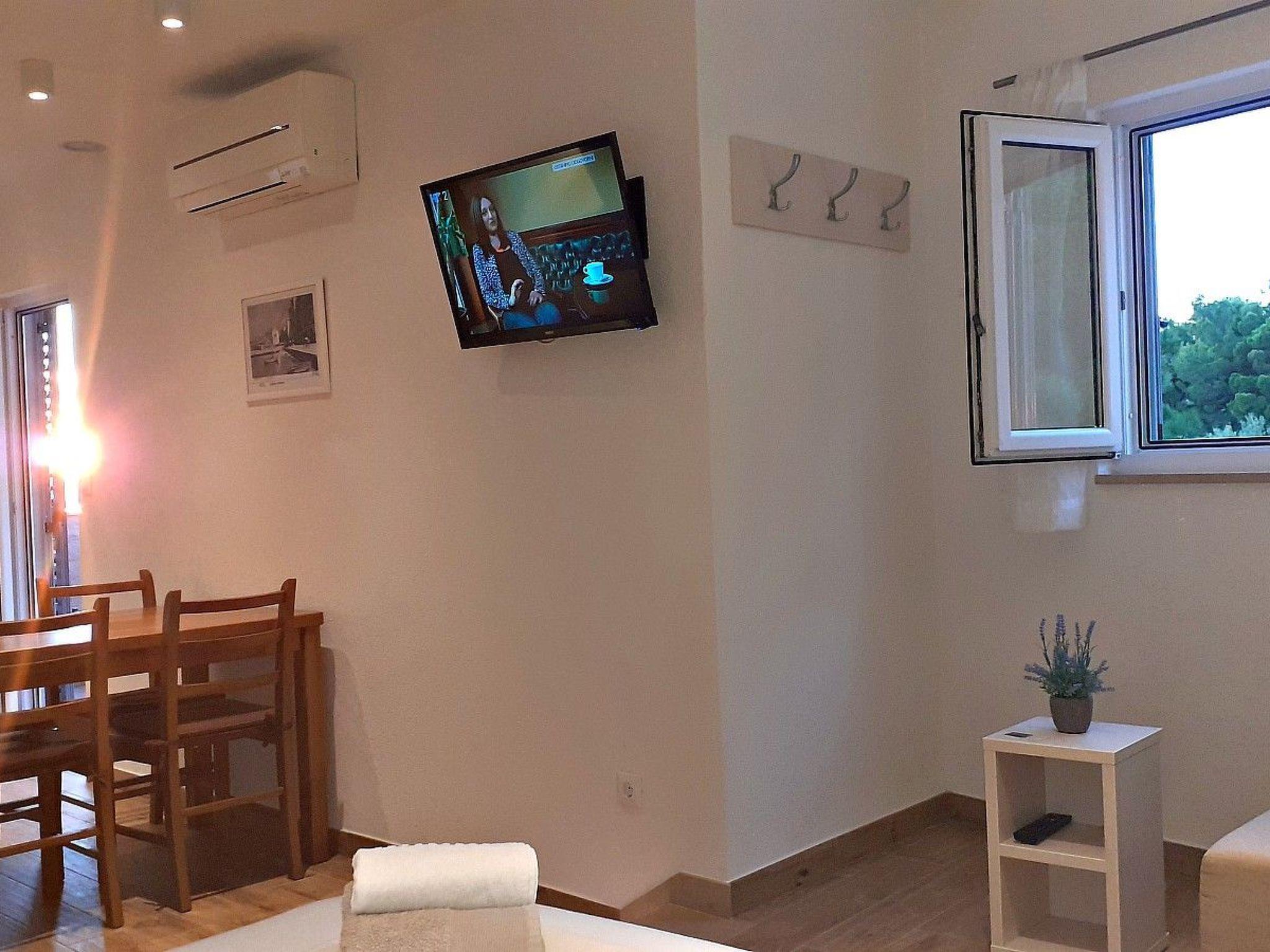 Deluxe Studio Ferienwohnung befindet sich im 1. Stock des Steinhaus Bonaca für 2-3 Personen mit einem Doppelbett und einem Sofa für eine Person. Die Ferienwohnung verfügt über eine Küche, Essbereich, Bad mit Badewanne. W-LAN, Sat-TV und Klimaanlage sind ebenfalls vorhanden. Ferienwohnung verfügt über einen Balkon mit Blick auf das Meer, die Berge und die Natur. Parken ist direkt vor dem Haus.