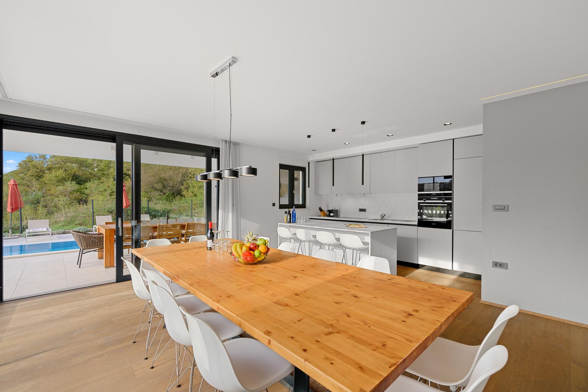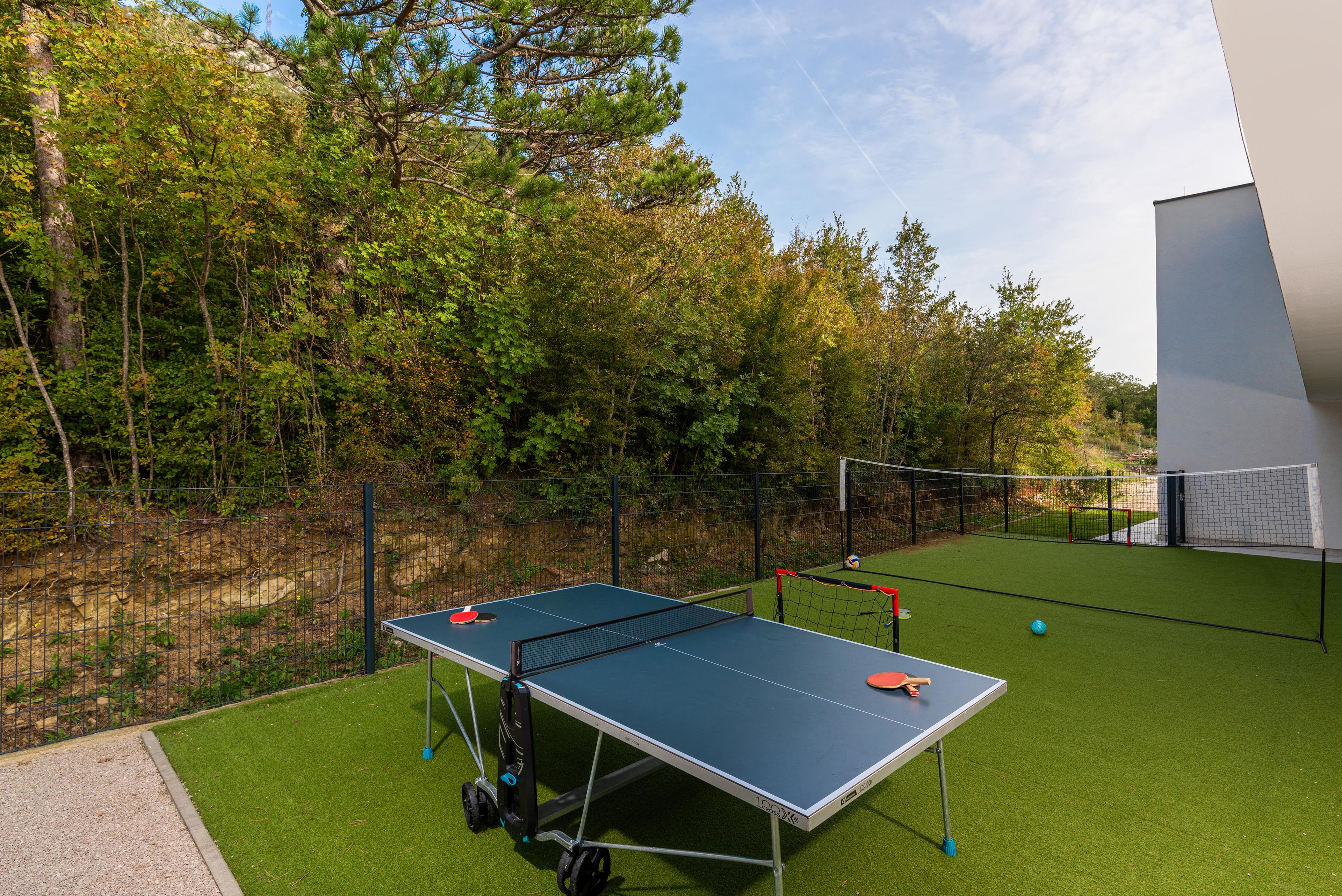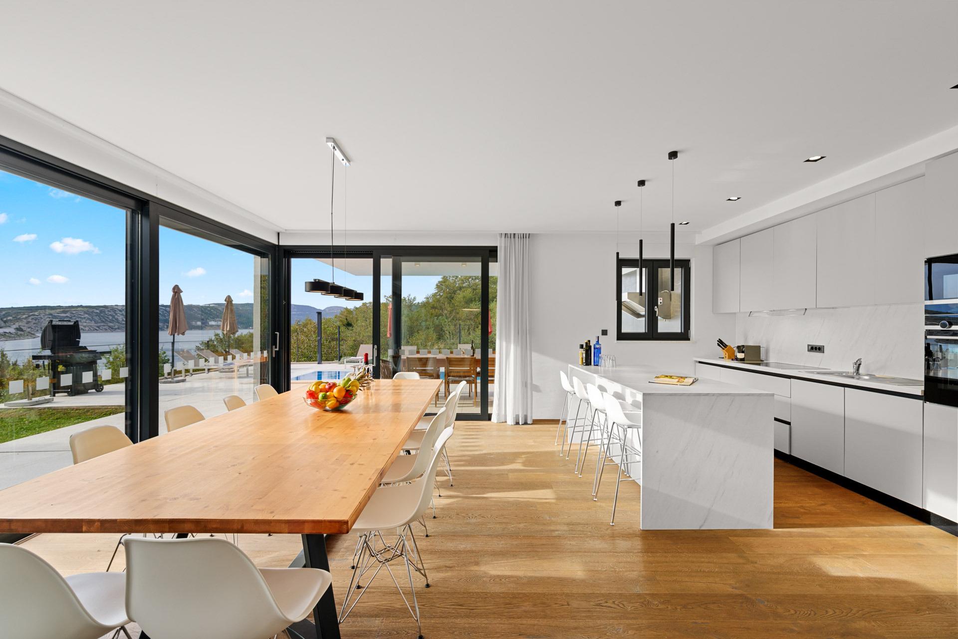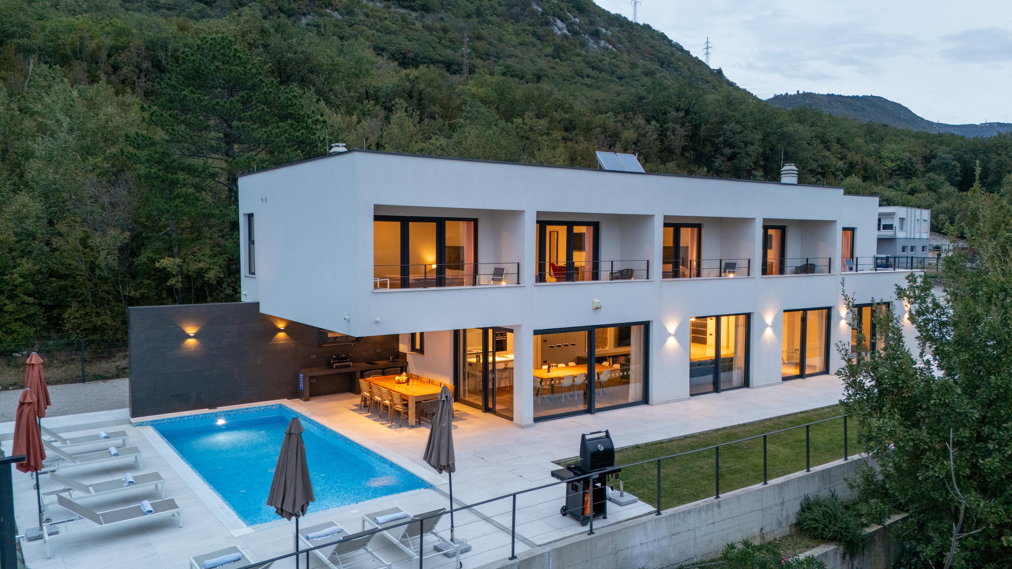 Im Zentrum der Villa liegt ein 34 m² großer Pool. Die Terrasse rundherum lädt zu sonnigen Tagen und geselligen Grillabenden ein. Kinder können auf dem Rasen Volleyball oder Badminton spielen, während Erwachsene den Blick auf die Bucht von Bakarac genießen.