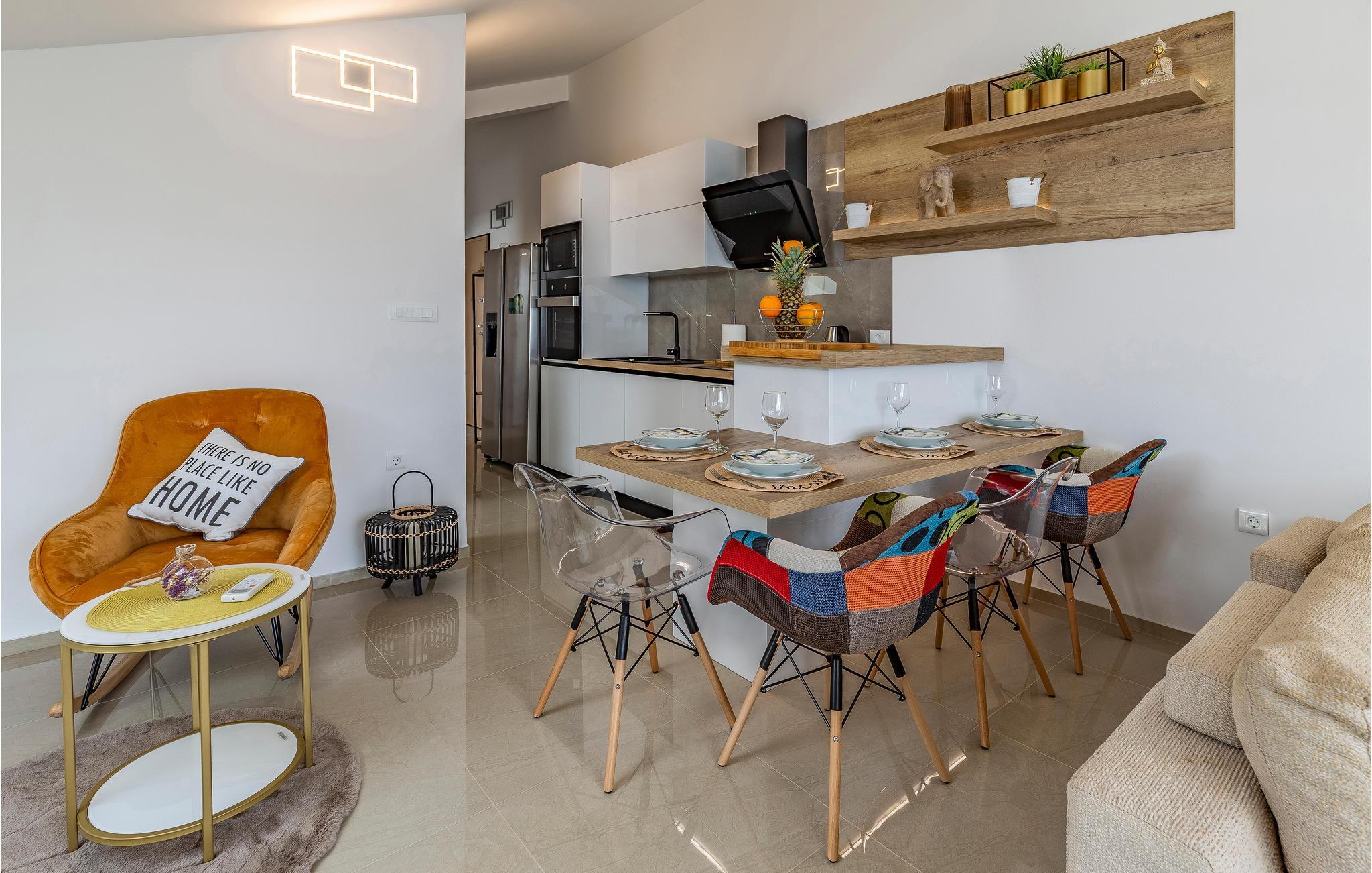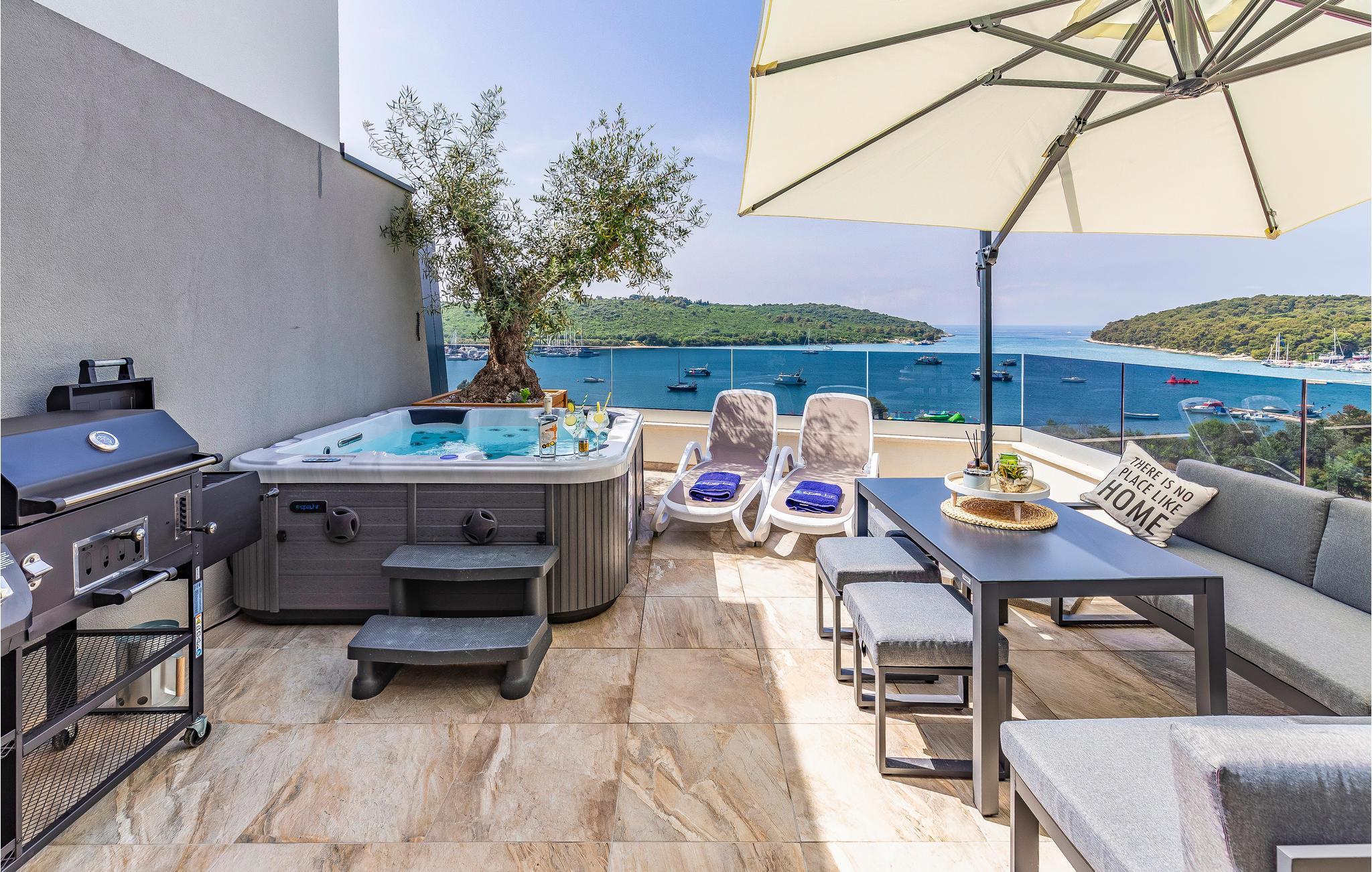 Der Panoramablick auf das Meer, kombiniert mit einem Whirlpool auf der Terrasse - hier finden Sie ideale Bedingungen für lange Sommerabende draußen. Die Wohnung bietet Platz in zwei Schlafzimmern, einem Badezimmer und einem Wohnbereich mit Küche. Im Erdgeschoss steht Ihnen ebenfalls ein großer Gemeinschaftspool zur Verfügung, sodass Sie sich an heißen Sommertagen abkühlen können.