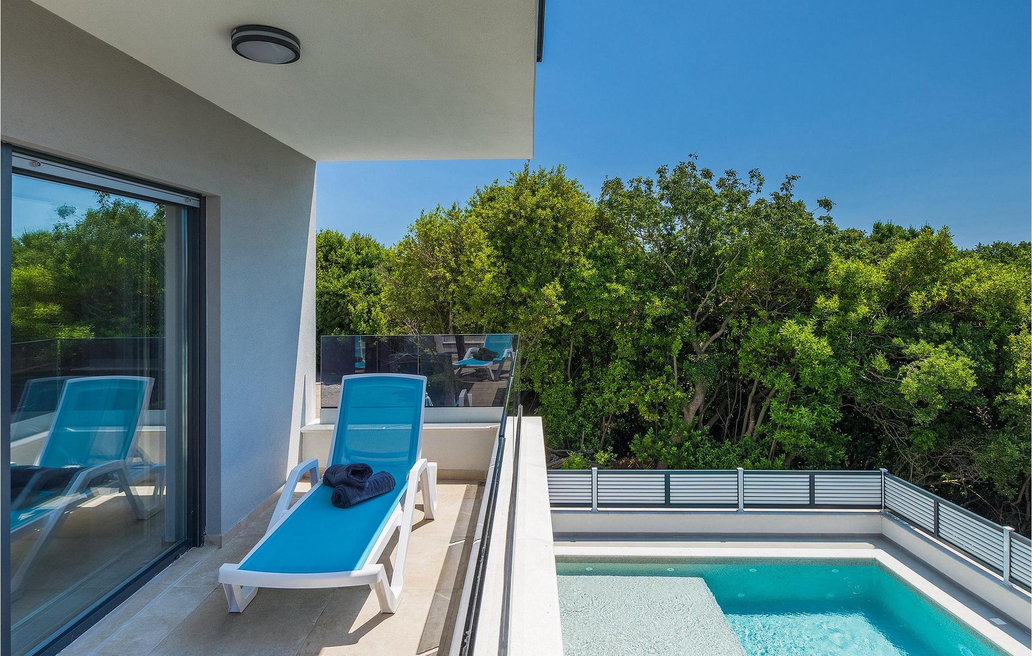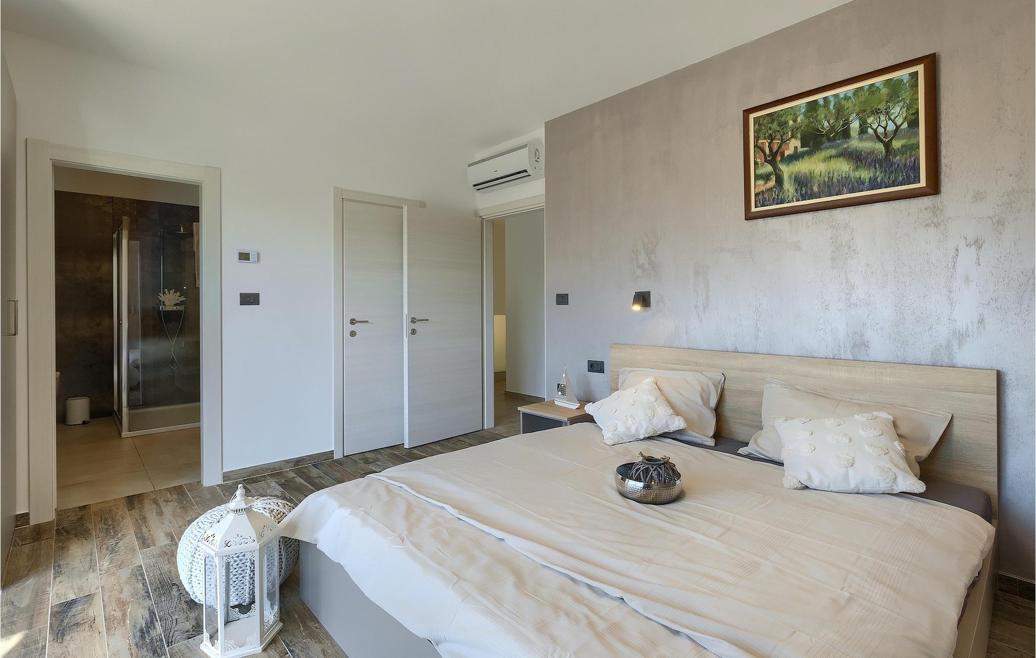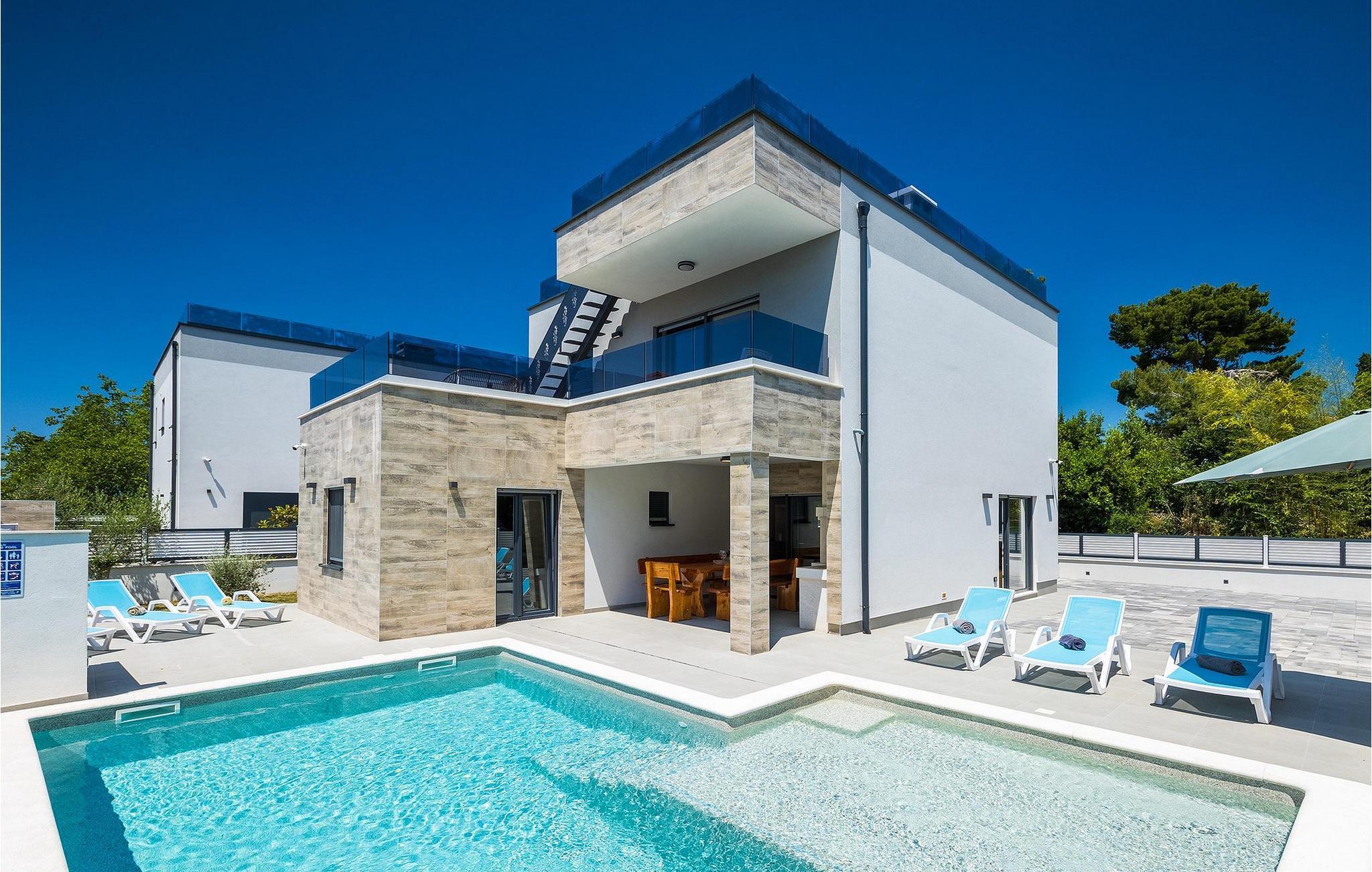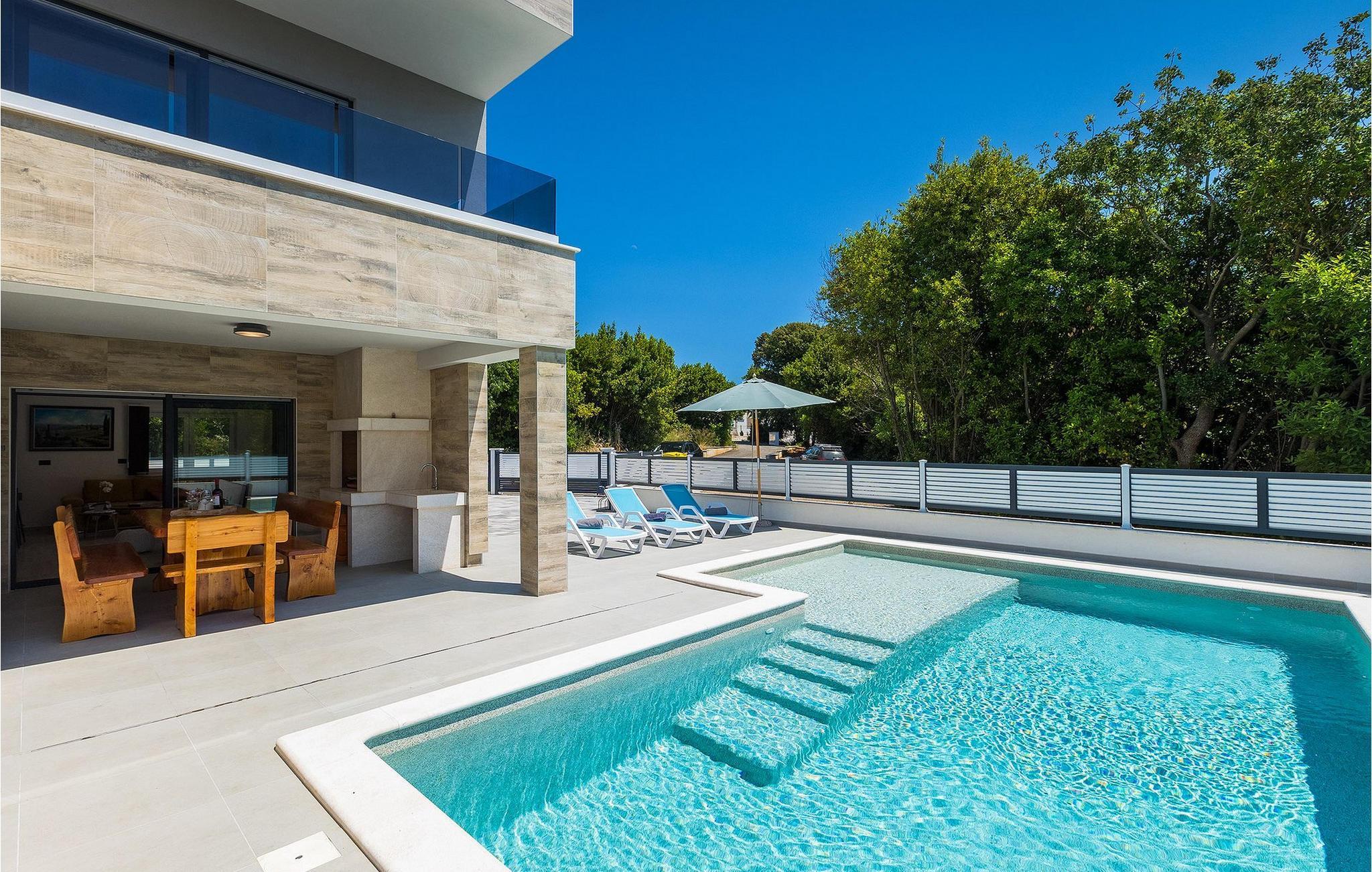 Die Villa Pervan ist in zwei Etagen unterteilt. Das Erdgeschoss verfügt über ein offenes Wohnzimmer, ein Esszimmer, eine ausgestattete Küche und ein Schlafzimmer mit eigenem Bad. Die voll ausgestattete Küche bietet Platz für Vorbereitung köstlicher Spezialitäten. Genießen Sie den Blick auf den privaten Pool vom komfortablen Wohnzimmer aus. Rund um den Pool stehen Liegestühle und Sonnenschirme zur Verfügung. Vom Wohnzimmer aus haben Sie Zugang zur Terrasse mit einem Esstisch und einem Gasgrill für unvergessliche Abende mit Ihrer Familie und Freunden. Im ersten Stock der Villa befinden sich zwei komfortable Schlafzimmer mit eigenem Bad.