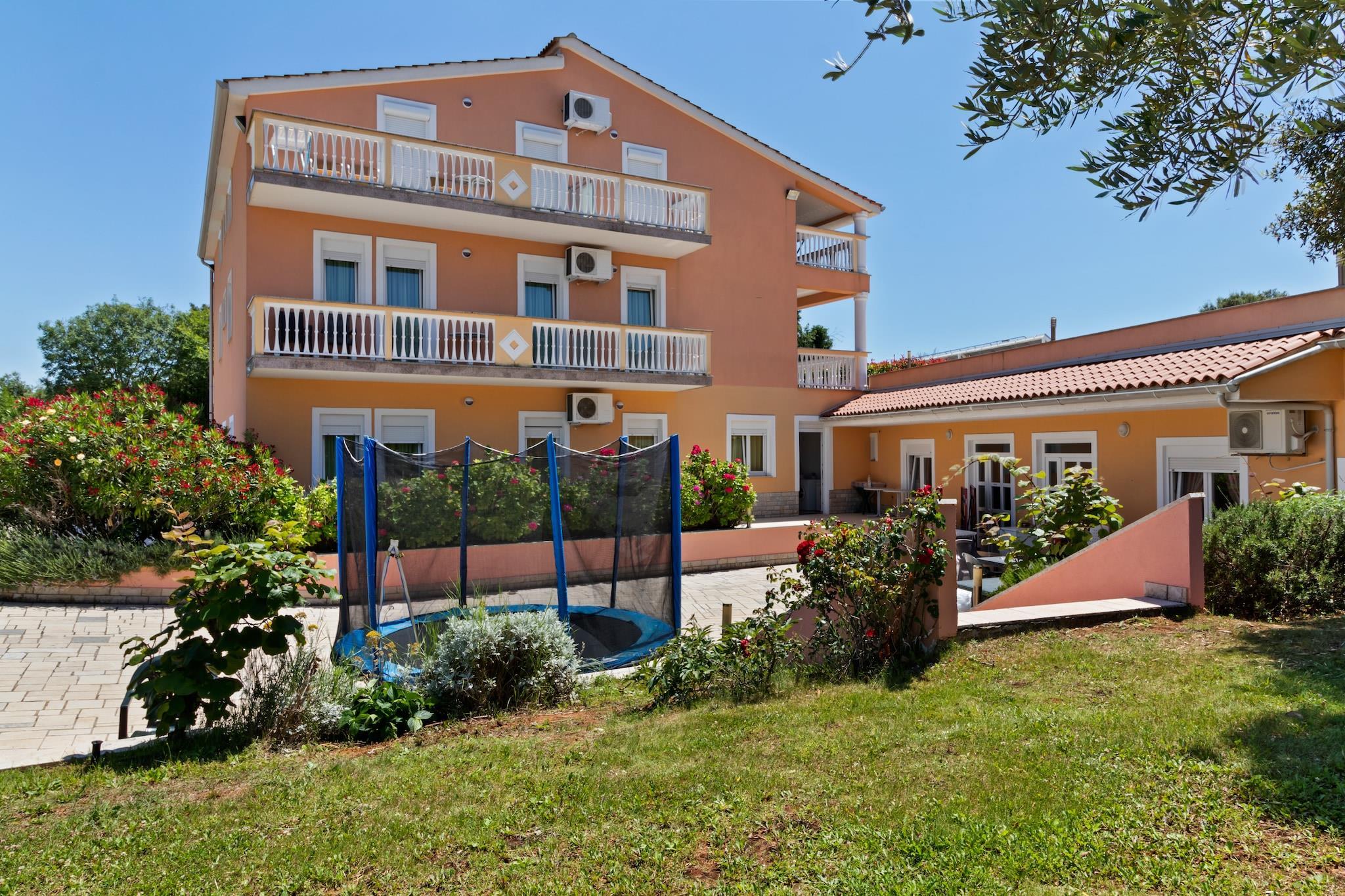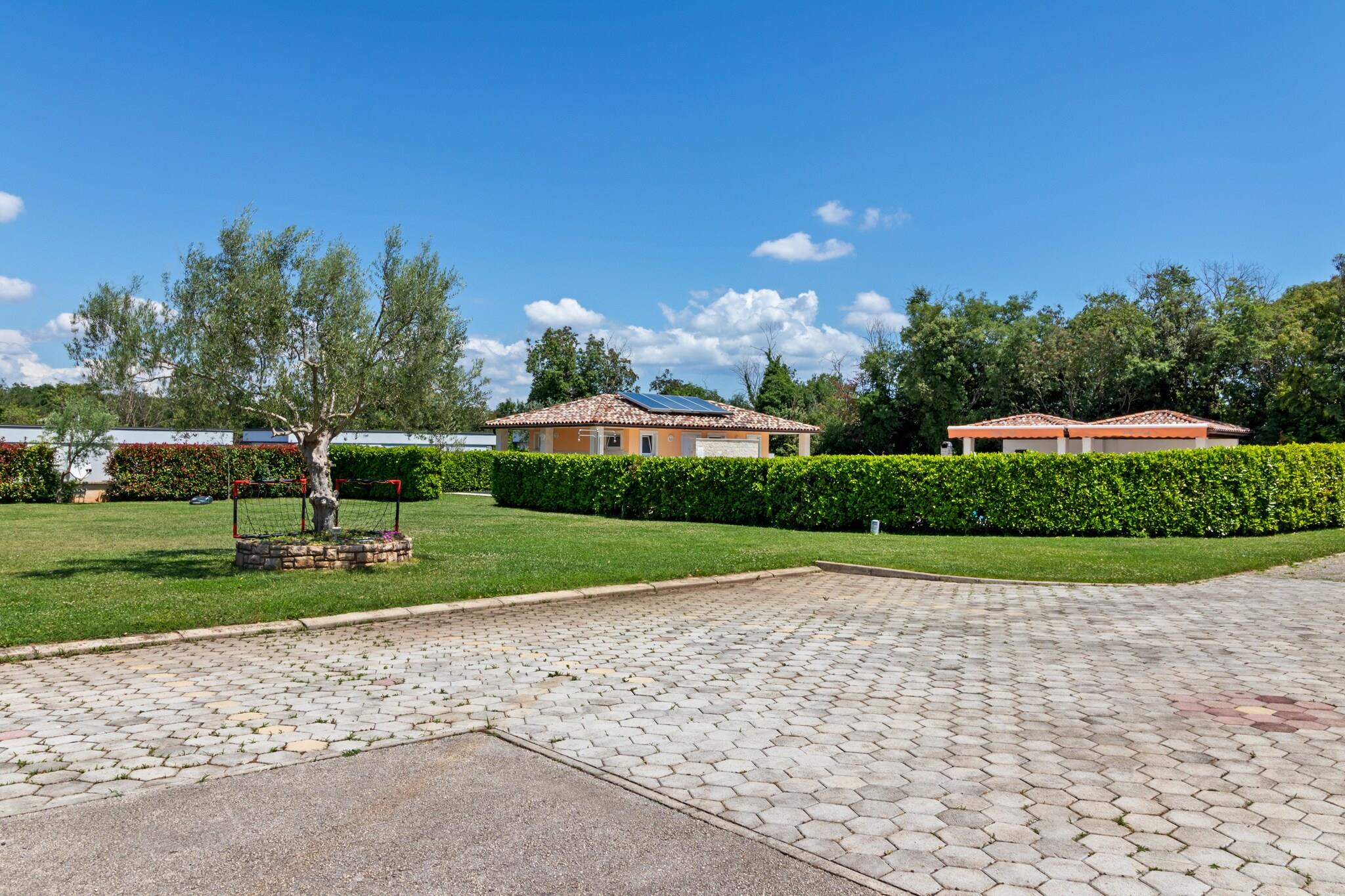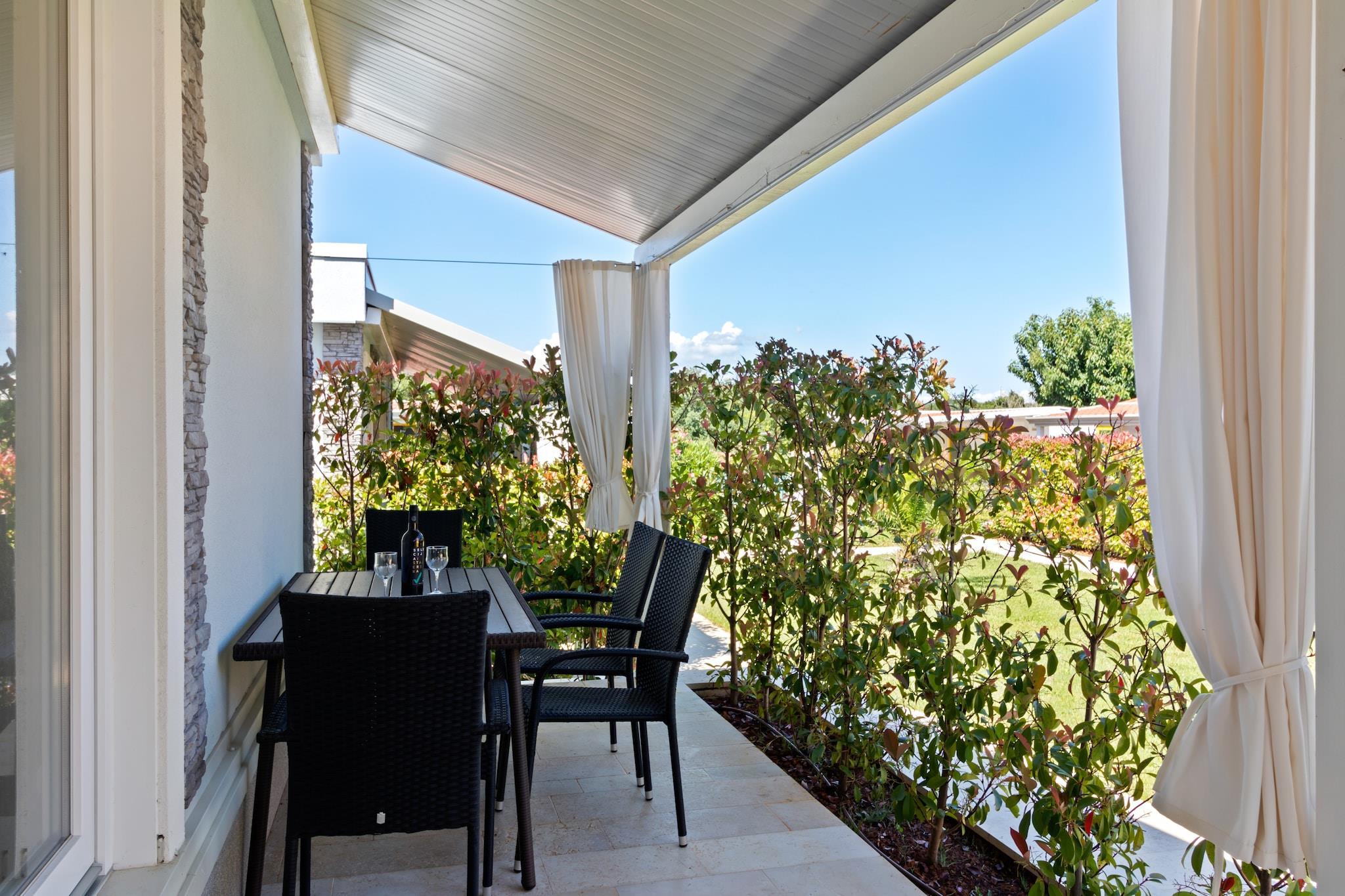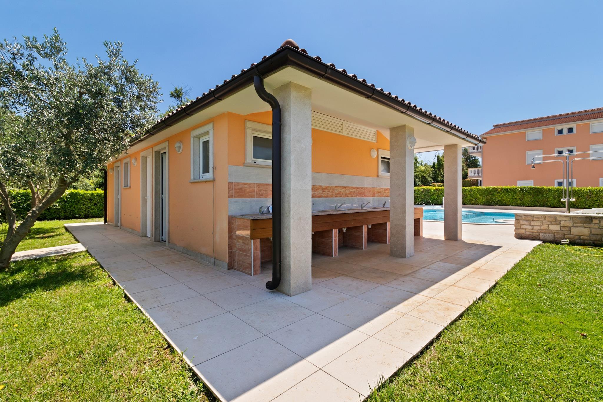 Parterre: (Kochnische(Wasserkocher, Kochendwasserhahn, Kaffeemaschine, Mikrowelle, Spülmaschine, Kühlschrank), Wohn-/Schlafzimmer(Doppelklappbett , TV, Klimaanlage), Schlafzimmer(Etagenbett oder 2 Einzelbetten), Schlafzimmer mit Badezimmer(Doppelbett king size, Badewanne oder Dusche, Toilette), Badezimmer(Badewanne oder Dusche)) Terrasse, Garten, Gartenmöbel, Liegen, Grill, Parkplatz, Trampolin, Pool(Gemeinschaftliche Nutzung mit anderen Gästen), Tennisplatz, Spielgeräte, Fußballtor