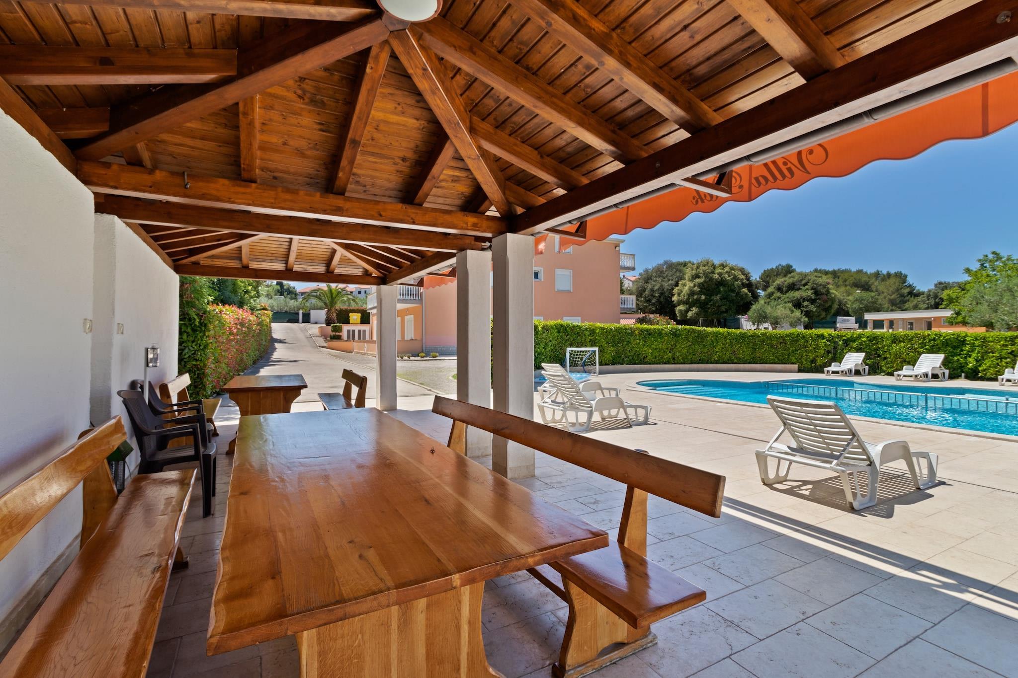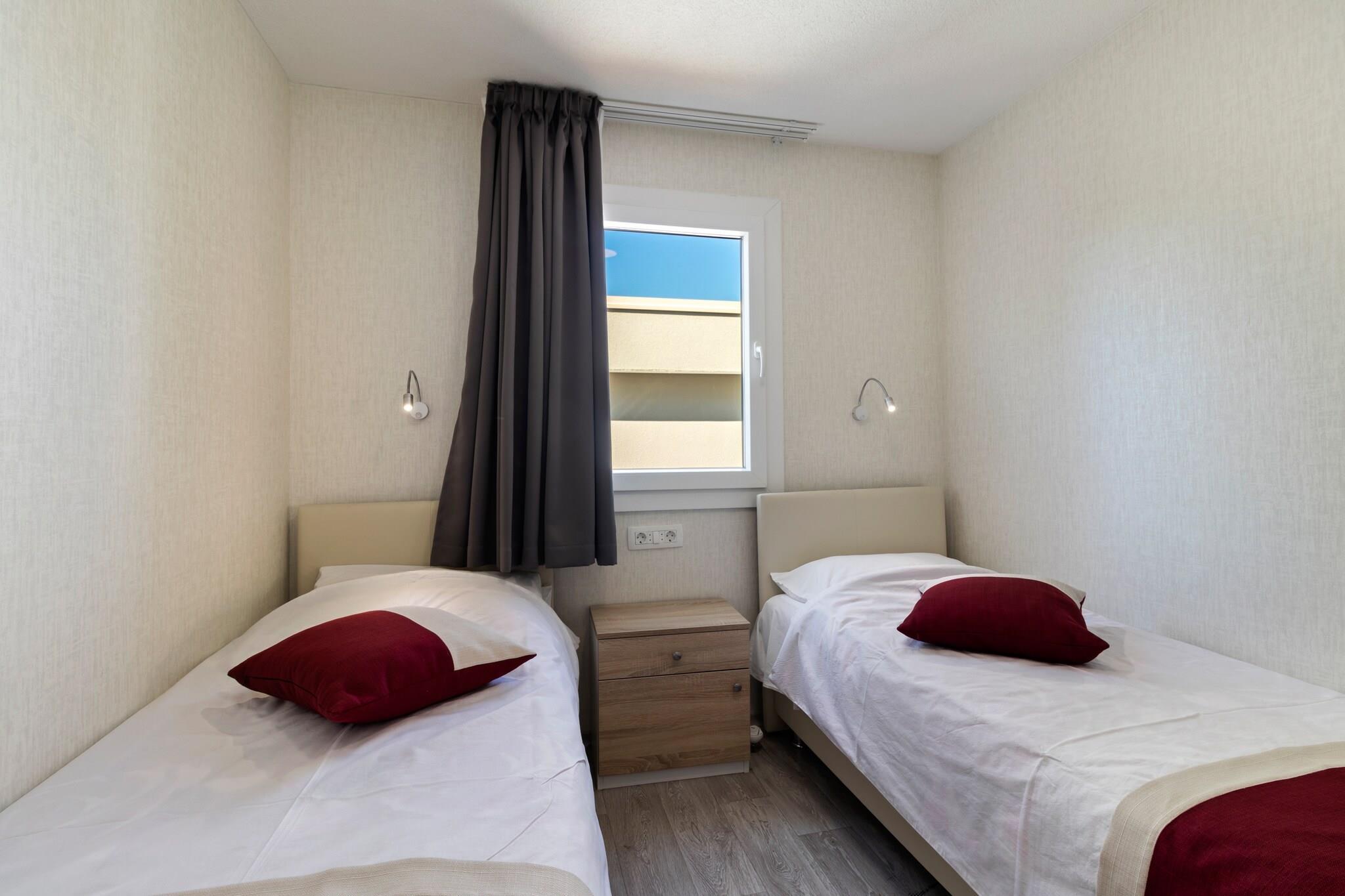 Dieses haustierfreundliche Mobilheim für sechs Personen im ruhigen Banjole lädt zum Entspannen ein, nur 1 km vom Strand und 2 km vom geschäftigen Zentrum Pulas entfernt. Mit kostenlosem WLAN, einem Gemeinschaftspool und zahlreichen Freizeiteinrichtungen ist es die ideale Wahl für Familien oder Gruppen, die Entspannung und Abenteuer zugleich suchen. Im Inneren erwartet Sie ein gemütlicher Wohn-/Schlafraum mit einem Doppelklappbett, Fernseher und Klimaanlage sowie eine praktische Küchenzeile mit Wasserkocher, Wasserkocher, Kaffeemaschine, Mikrowelle, Geschirrspüler und Kühlschrank. Die Unterkunft umfasst ein Schlafzimmer mit Etagenbett oder zwei Einzelbetten sowie ein Hauptschlafzimmer mit einem Kingsize-Bett und eigenem Bad. Ein zweites Badezimmer sorgt für zusätzlichen Komfort. Draußen erwartet Sie eine möblierte Terrasse mit Liegestühlen, einem Grill und Zugang zu familienfreundlichen Einrichtungen wie einem Trampolin, einem Tennisplatz und einem Spielbereich. Entdecken Sie römische Schätze wie den Augustustempel und den Sergierbogen in der Nähe oder unternehmen Sie einen Tagesausflug zu den malerischen Brijuni-Inseln. Genießen Sie Pizza in der Nina Pizzeria oder frische Meeresfrüchte in der Konoba Sidro. Dieses Küstenparadies vereint Geschichte, Natur und Freizeit für einen unvergesslichen Urlaub.