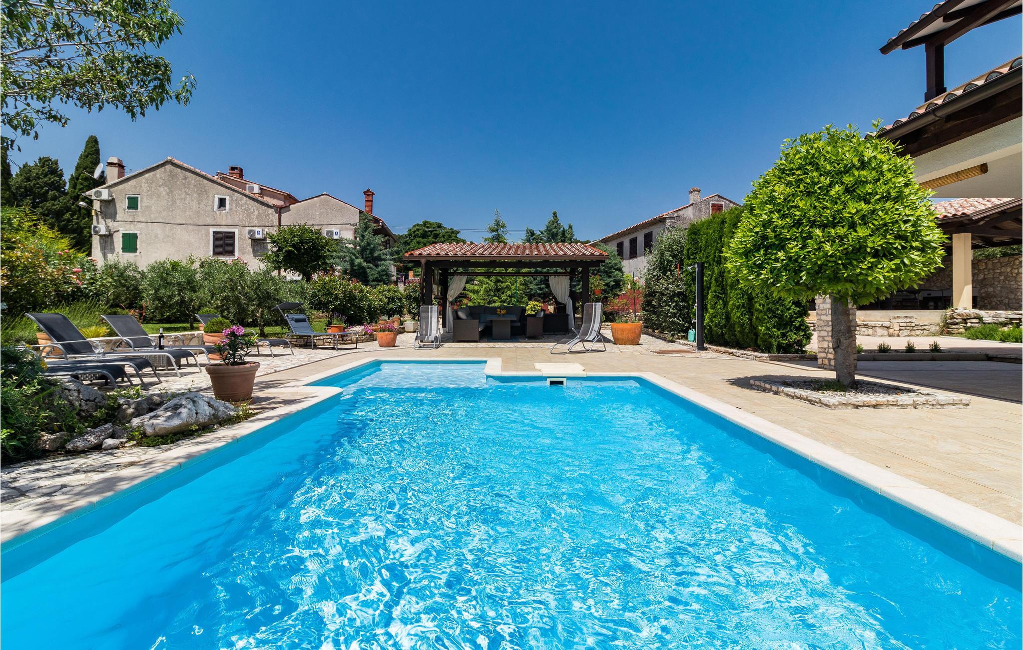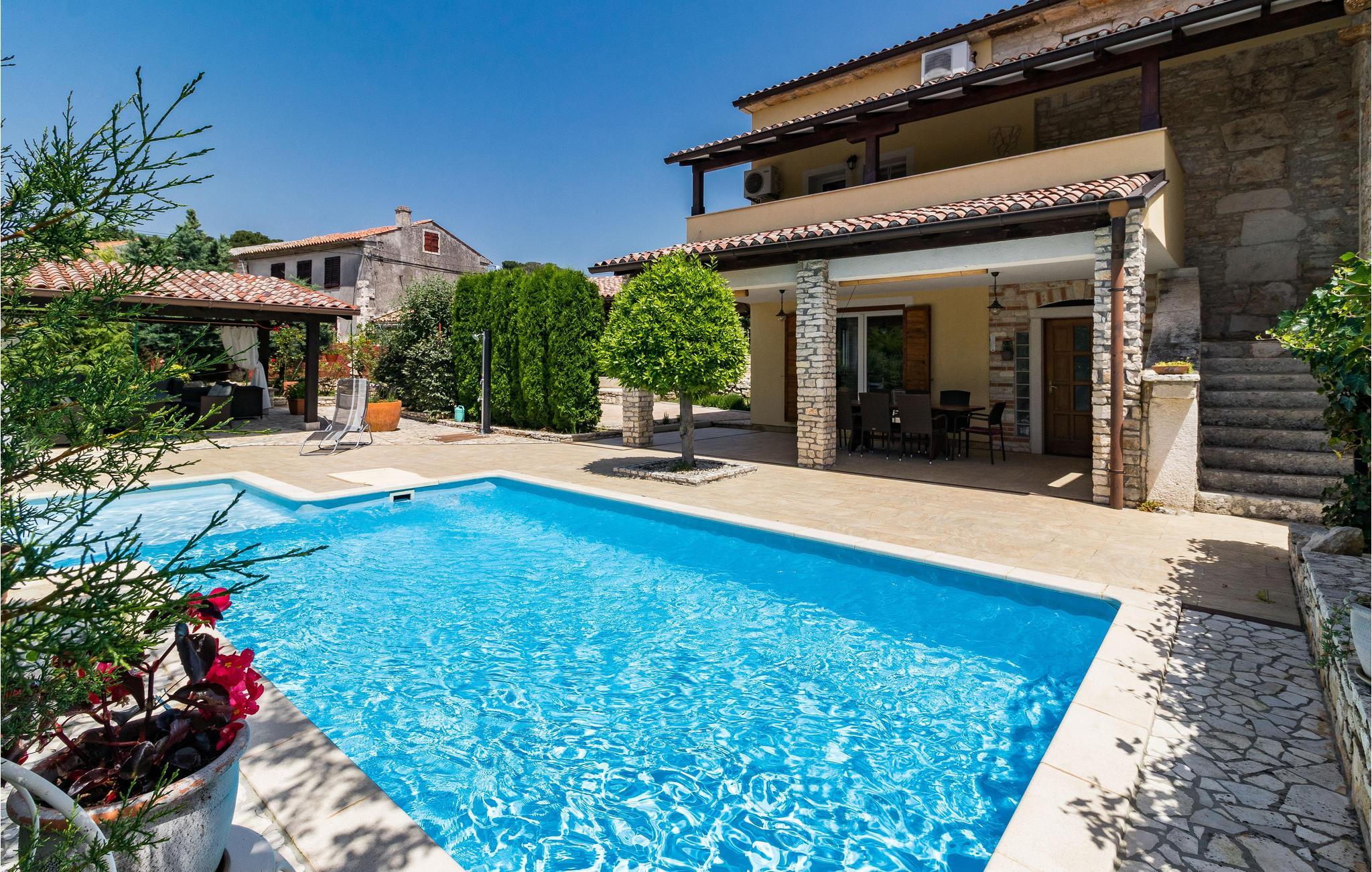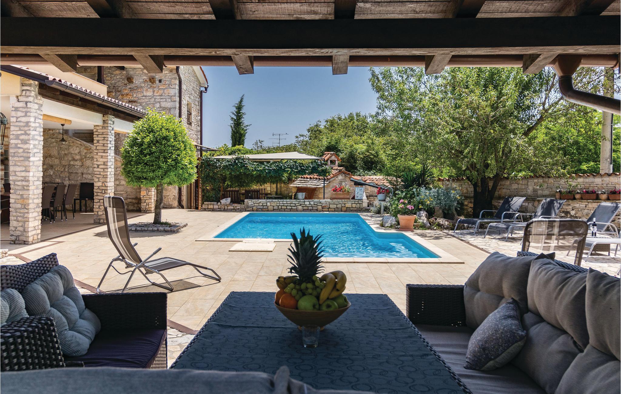 Dieses wunderschöne Poolhaus befindet sich in dem kleinen, istrischen Dorf Manjadvorci. Bei der Einrichtung wurden rustikale und moderne Elemente kombiniert. Die Räume sind großzügig gestaltet und jedes Schlafzimmer verfügt über ein eigenes Bad. Der Fährhafen Brestova, von dem aus Sie zu den Inseln Cres und Losinj fahren können ist ca. 1 Autostunde entfernt. Unbedingt besuchen sollten Sie die bekannte Riviera von Opatija, die Königin des kroatischen Tourismus. Auch die antike Stadt Pula mit dem Amphitheater ist sehr sehenswert. Das historische Städtchen Labin mit zahlreichen Ausstellungen und der Badeort Rabac sind ebenfalls einen Besuch wert. In der unmittelbarer Nähe befindet sich die Ranch 'Barba Tone', wo Sie Reitstunden nehmen und Ausflüge mit den Pferden durch Istrien unternehmen können. Auch therapeutisches Reiten möglich. Hier werden auch therapeutische Sitzungen für Erwachsene und Kinder angeboten. In der Nähe befindet sich eine traditionelle Konoba in der Sie zu günstigen Preisen einheimische Spezialitäten und Weine probieren können. Im Erdgeschoß befinden sich ein Schlaf- und Badezimmer für Menschen mit Behinderungen.