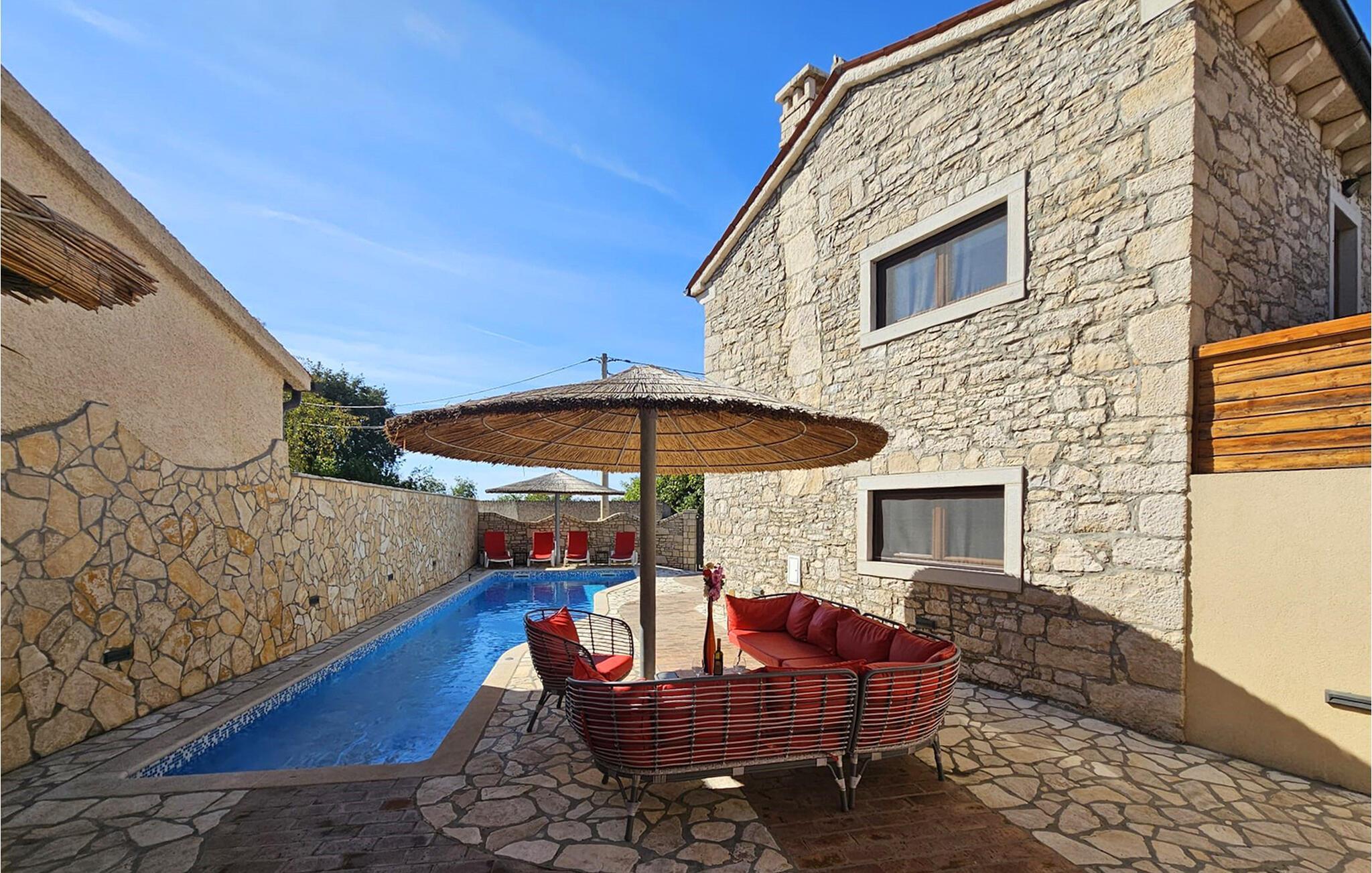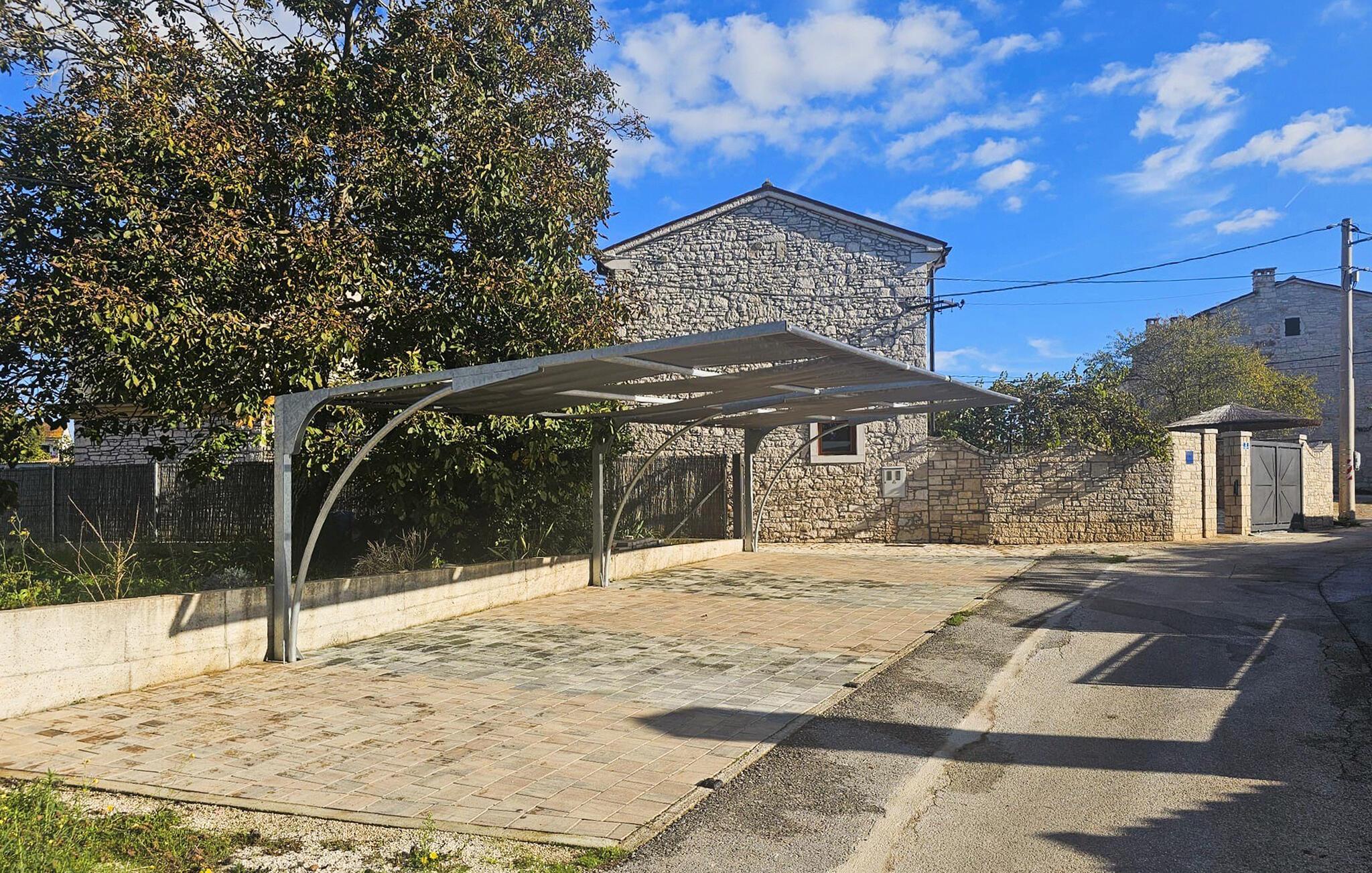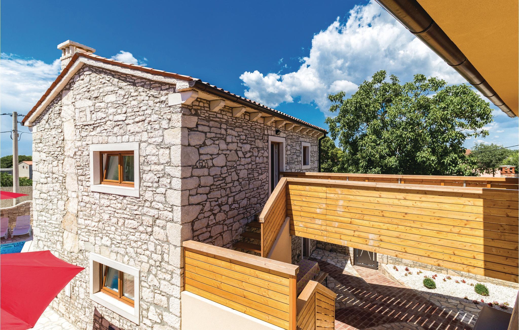 Dieses schöne Ferienhaus aus Stein befindet sich in Orbanici, einem Dorf in der Nähe von Barban. Es besteht aus mehreren separaten Einheiten, die den Hof umgeben und eine ganze Einheit bilden. Das Haupthaus besteht aus Erdgeschoss und erster Etage, die durch eine Innentreppe miteinander verbunden sind, während die erste Etage auch über Treppen von außen zugänglich ist. Im Erdgeschoss gibt es ein Wohnzimmer mit Küche, ein Esszimmer und ein Badezimmer, während sich im zweiten Stock zwei Schlafzimmer mit Bad befinden. Im zweiten Haus gibt es zwei Schlafzimmer im Erdgeschoss sowie ein großes Badezimmer, das direkt vom Hof aus zugänglich ist, ein Zimmer ist ein Durchgangszimmer. Besonders hervorzuheben ist der große Raum mit Whirlpool, Billard und der überdachten Sommerküche, die so verglast ist, dass sie bei Bedarf geöffnet oder geschlossen werden kann. Der Innenhof wird von einem großen Swimmingpool dominiert, in dem Sie sich an heißen Sommertagen erfrischen können. Auf der Sonnenterrasse wurde auch an Schatten gedacht, den Sie unter großen befestigten Sonnenschirmen aus natürlichen Materialien finden.