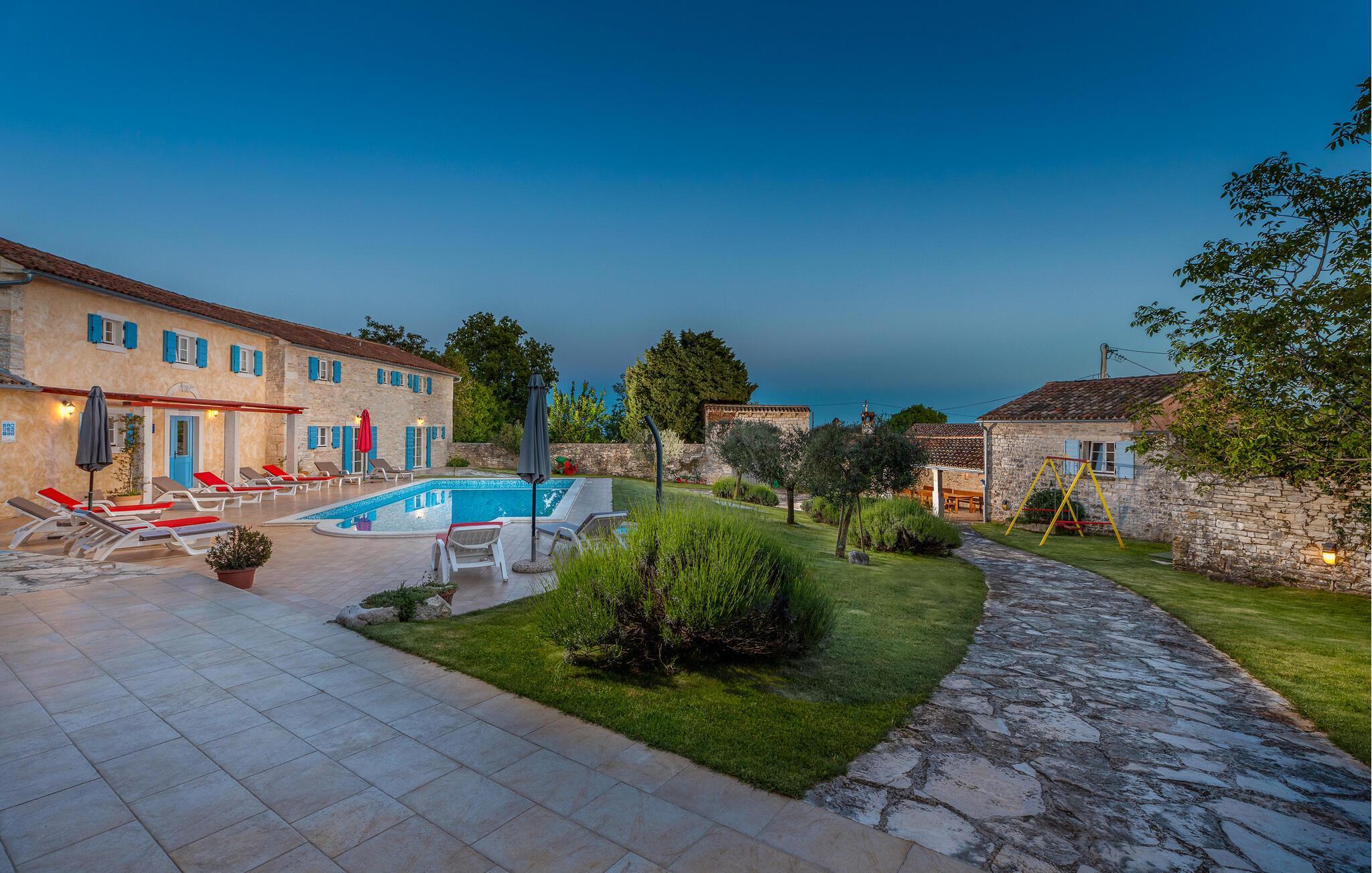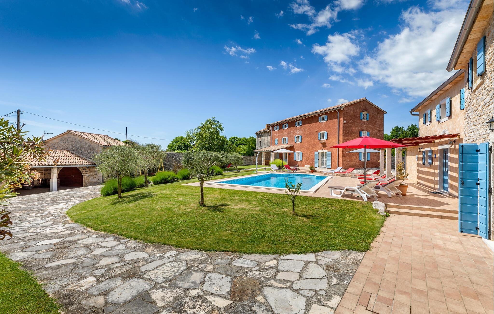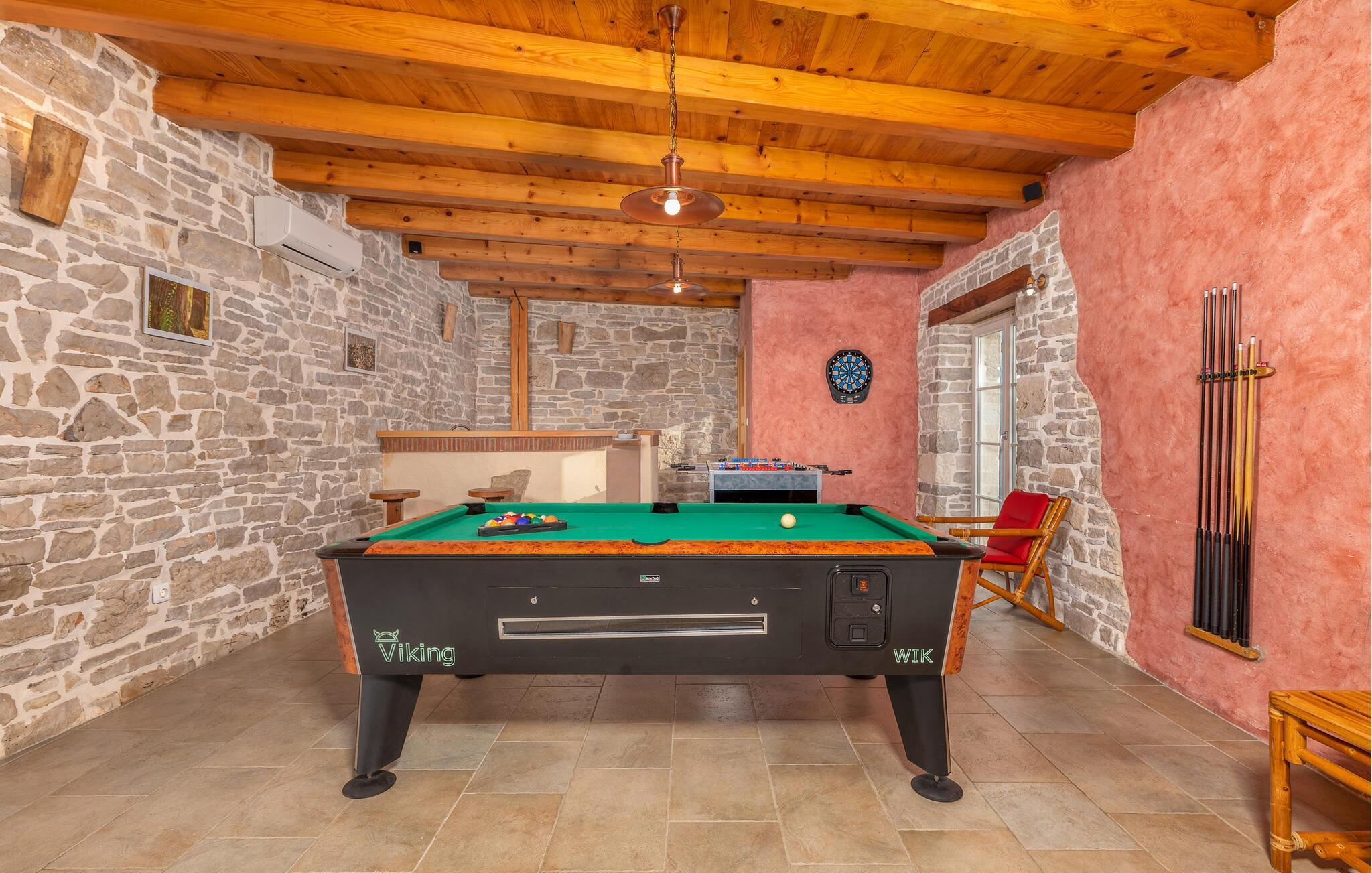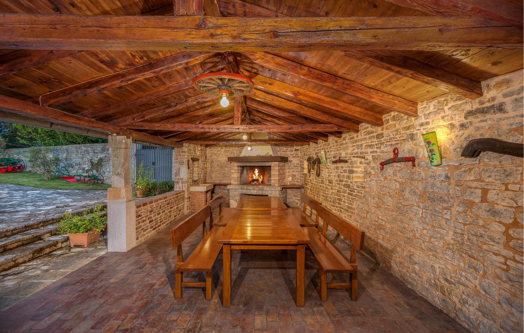 Dieses äußerst rustikale Ferienhaus mit großer Kapazität, welches auf drei Objekte aufgeteilt ist, befindet sich am Rand eines typisch istrischen Dorfes. Hundertjährige Wände, welche komplett restauriert worden, bieten Ihnen Privatsphäre und Geborgenheit. Innerhalb des ersten Hauses im Erdgeschoß befindet sich ein großer Wohnraum mit Küche und einem rustikalen Esssaal. Über die Stockwerke verteilen sich die gemütlichen Schlafzimmer. Im Erdgeschoss des zweiten Hauses können Sie sich zur Unterhaltung und für gemeinsame Stunden in einem Freizeitsaal mit einer kleinen Bar, Poolbillard, Pikado oder zum Tischfußball treffen. Eine Wellnessoase zum Relaxen mit Sauna, sowie ein Fitnessraum für die Aktiven unter Ihnen stehen ebenfalls zur Verfügung. Hier wird für jeden Geschmack etwas geboten. Auf den oberen Etagen des zweiten Hauses befinden sich drei weitere Schlafzimmer mit jeweils eigenem Badezimmer. Beide Häuser sind durch eine Außentreppe miteinander verbunden. Auf dem teilweise geschlossenen (4500 m2) Grundstück dominiert der große Außenpool. Hier können Sie an heißen Tagen ein willkommenes Bad genießen. Eine Spielecke für die Kleinen und eine große Sommerküche runden das idyllische Gesamtbild ab. Die waldreiche Umgebung lädt zu entspannten Spaziergängen ein. Dieses traumhafte Feriendomizil wird Ihnen sicher einen erholsamen und unvergessenen Urlaub bescheren. Besuchen Sie die mittelalterliche Stadt Barban! Barban hat vieles zu bieten: Paläste, Kirchen, Denkmäler aus dem Barock sowie der Gotik, die Fresken und die glagolitischen Aufzeichnungen, sowie eine Stadtmauer. Der Ort wird durch dieses reichhaltige kulturelle Erbe zu einer interessanten Region für Kulturliebhaber.