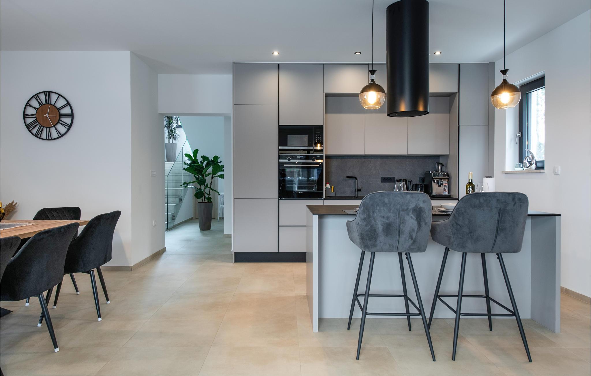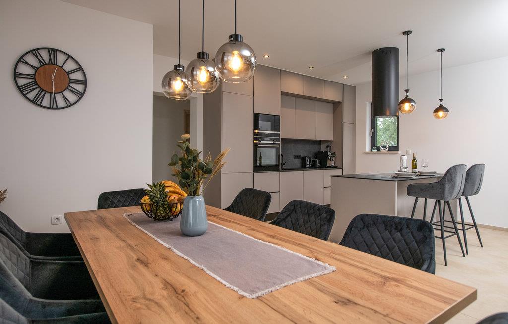 In der Nähe des Meeres lädt Sie dieses gut ausgestattete Ferienhaus zu einem erholsamen Aufenthalt ein. Es bietet ein hochwertiges, geschmackvolles Interieur mit Komfort und Platz für eine größere Familie oder mehrere Generationen. Genießen Sie die gemeinsamen Mahlzeiten am langen Esstisch und entspannen Sie in stilvollem Ambiente.