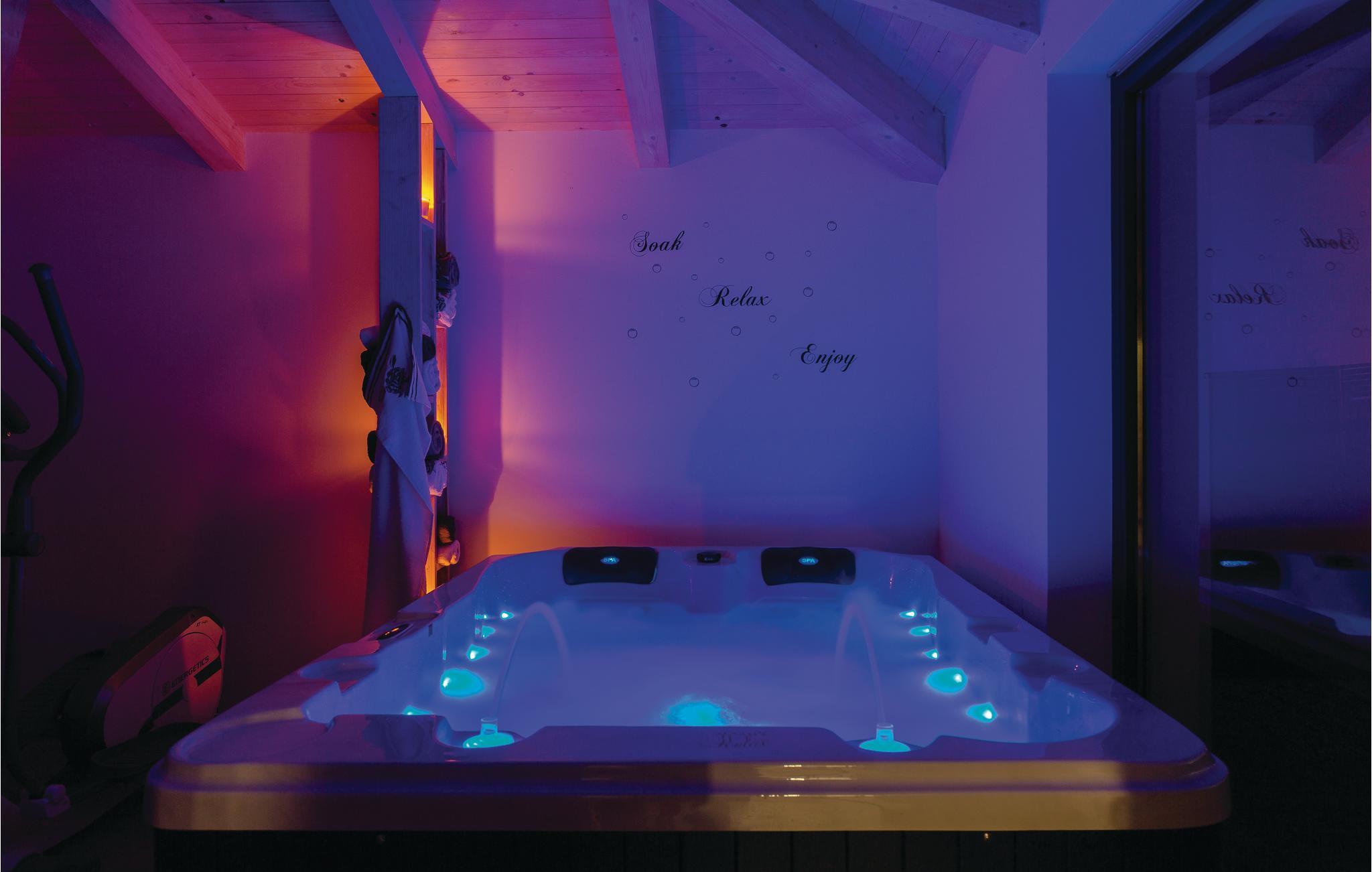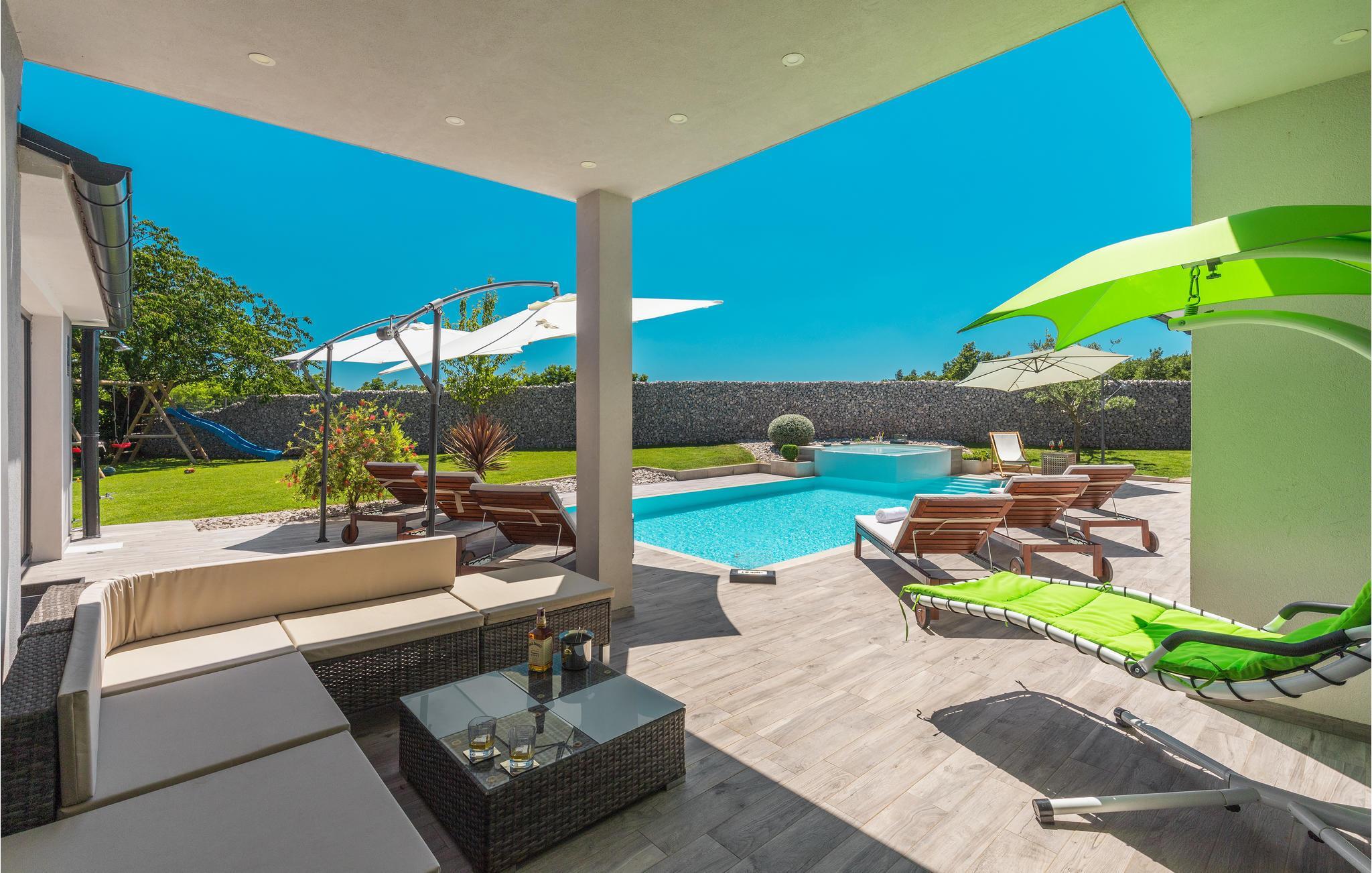 Im Garten erwarten Sie eine Sonnenterrasse, und eine Außenküche, sodass Sie gut draußen essen und kochen können. Der elegante Pool hat einen separaten Bereich für Kinder, aus dem Wasser in den Pool überläuft. Es gibt auch einen Wellnessbereich mit Sauna und Whirlpool.