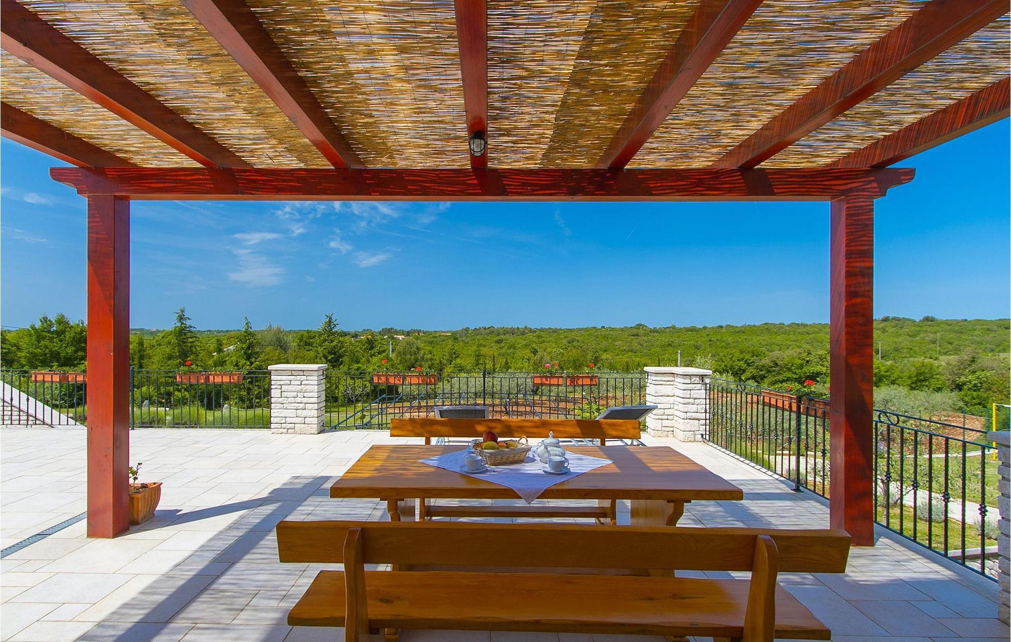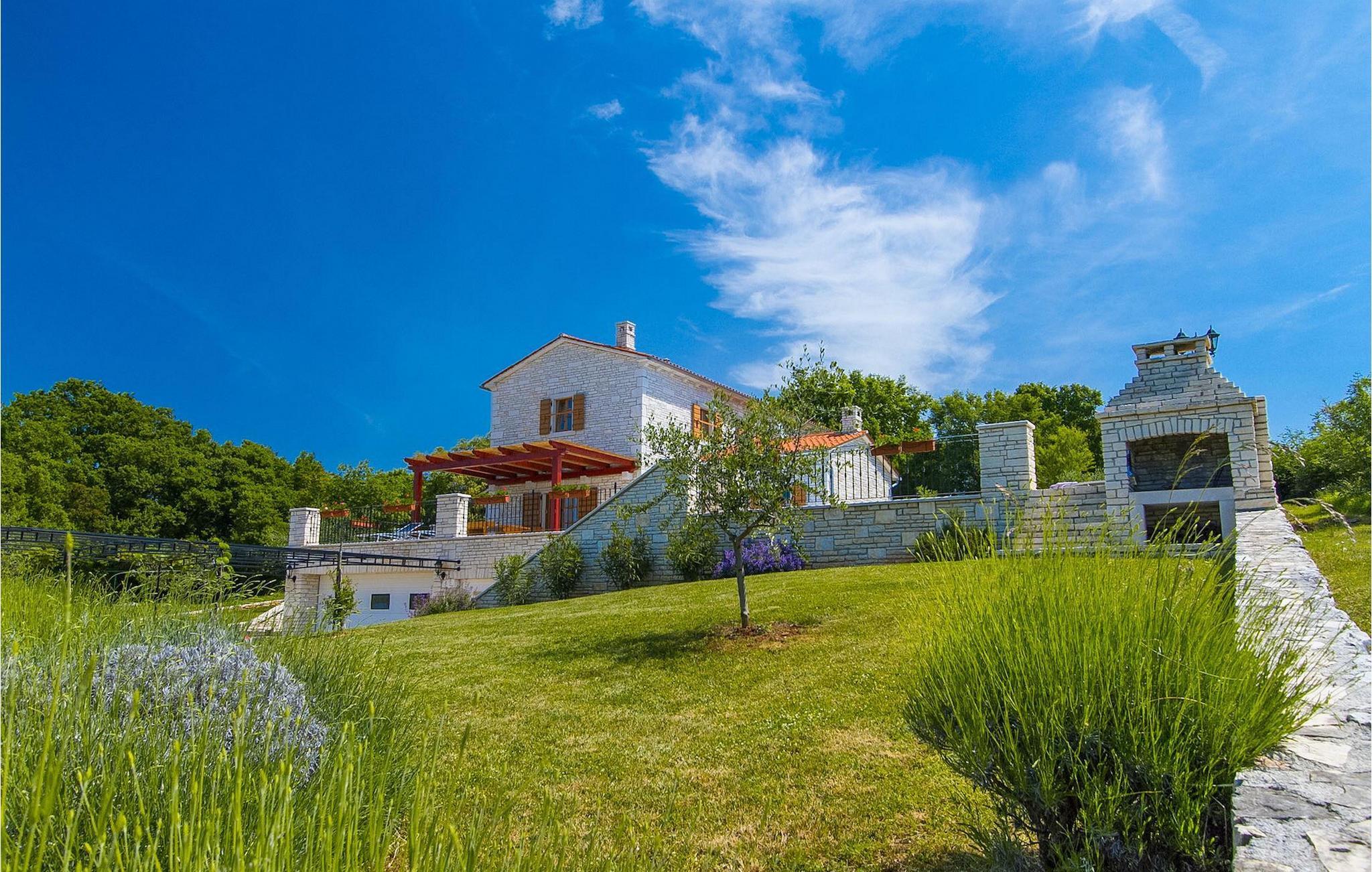 Der Außenbereich umfasst einen komplett eingezäunten großen grünen Garten mit Pool, wo Sie entspannen und die Sonne mit dem herrlichen Blick auf die schöne Natur genießen können. Auf der Terrasse steht ein Essbereich im Freien mit Holzkohlengrill zur Verfügung. Hier können Sie leckere Mahlzeiten zubereiten oder einfach ein Glas guten istrischen Weins genießen.