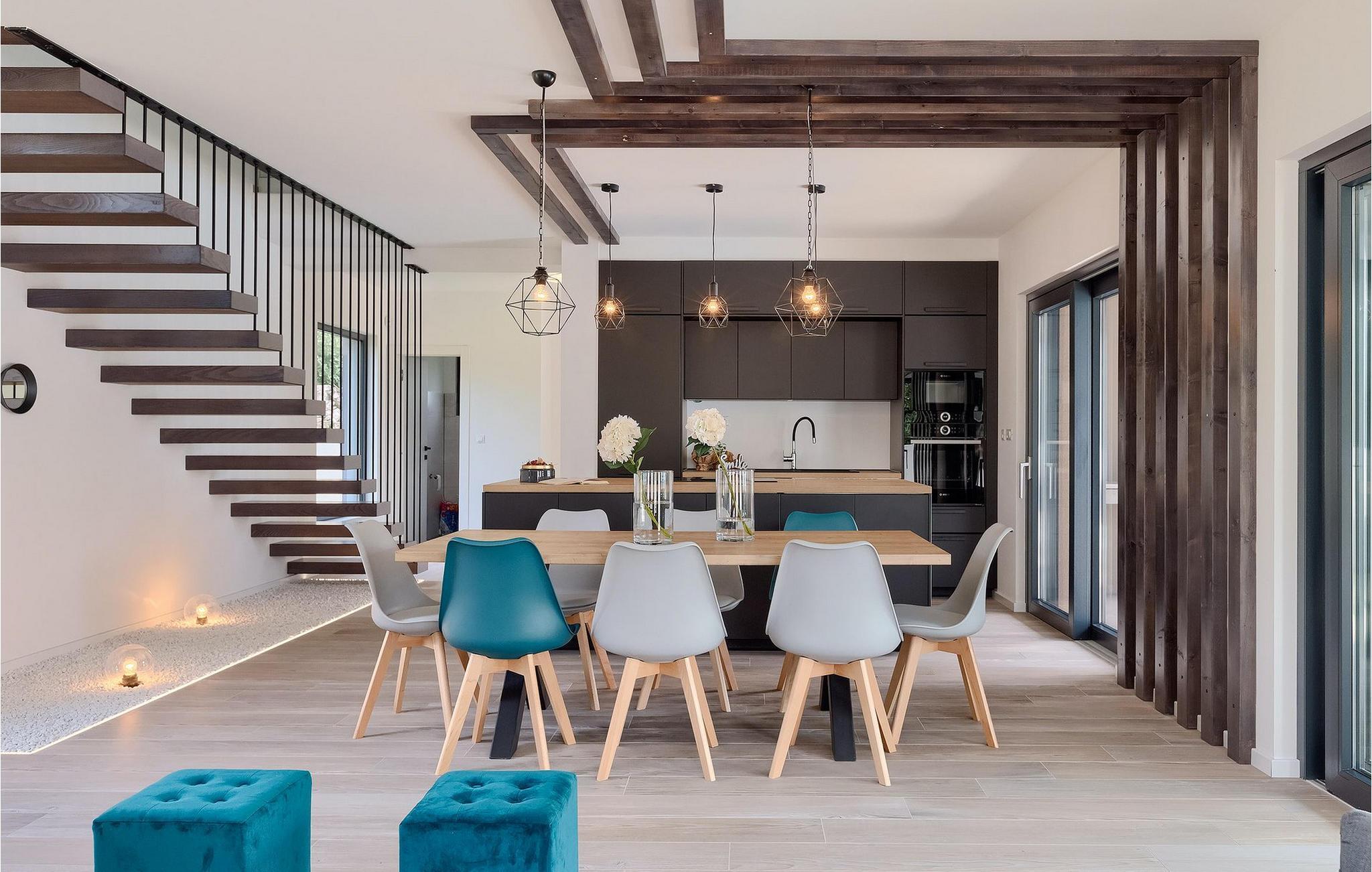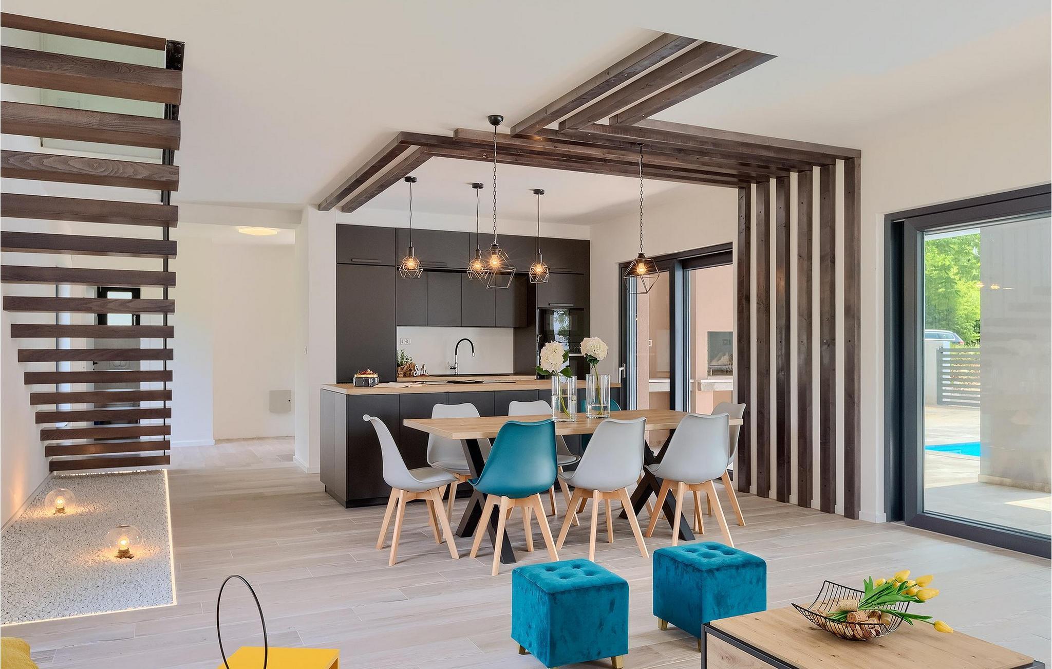 Das Esszimmer, Wohnzimmer und offen gestaltete Küche befinden sich im Erdgeschoss dieser Villa.