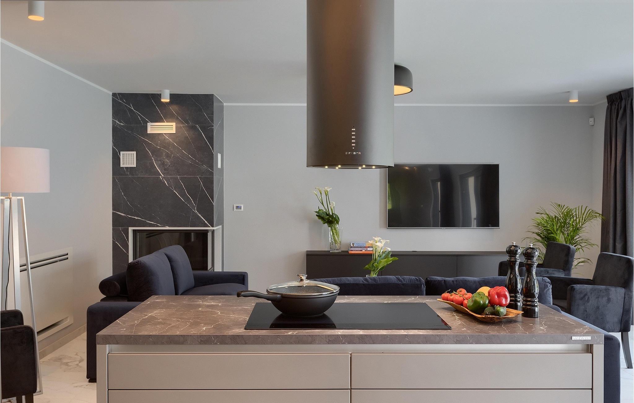 Eine völlig ausgestattete Küche und der Ess- und Wohnbereich befinden sich im offen-konzipierten Erdgeschoss,.