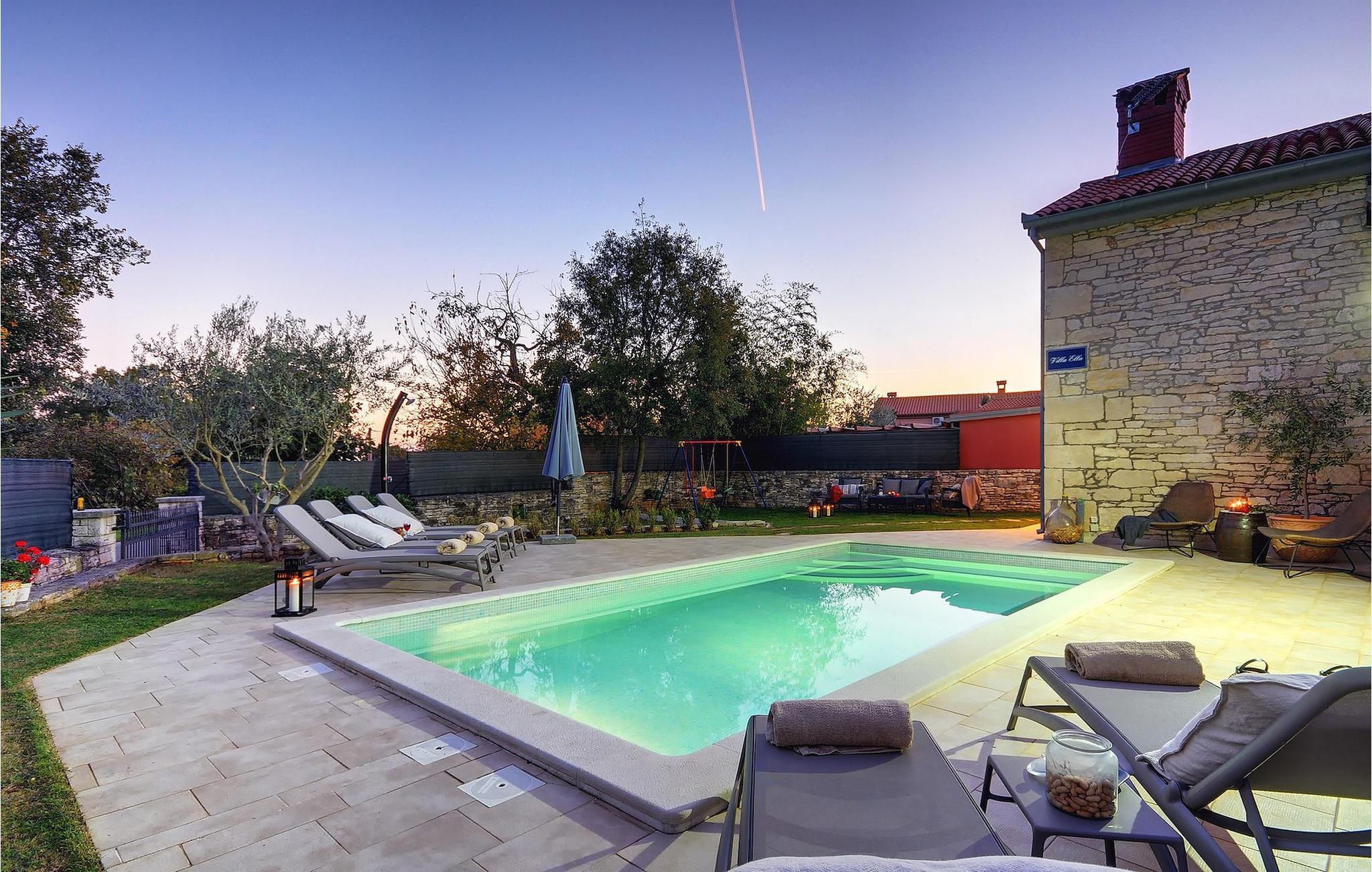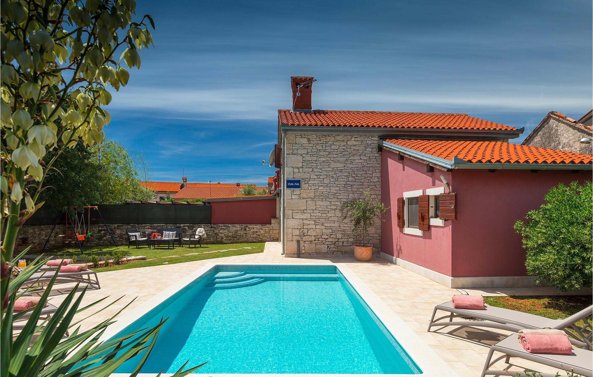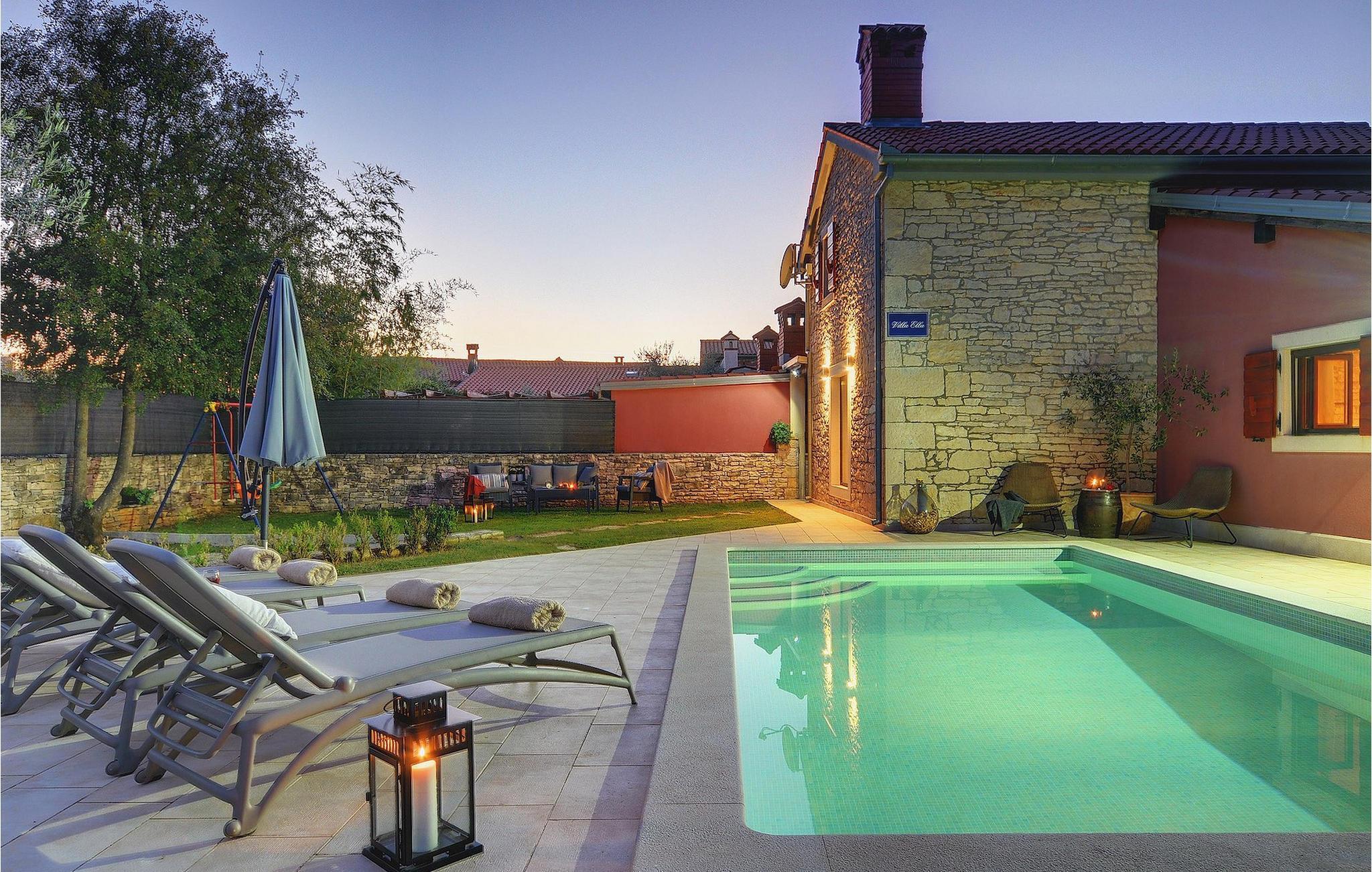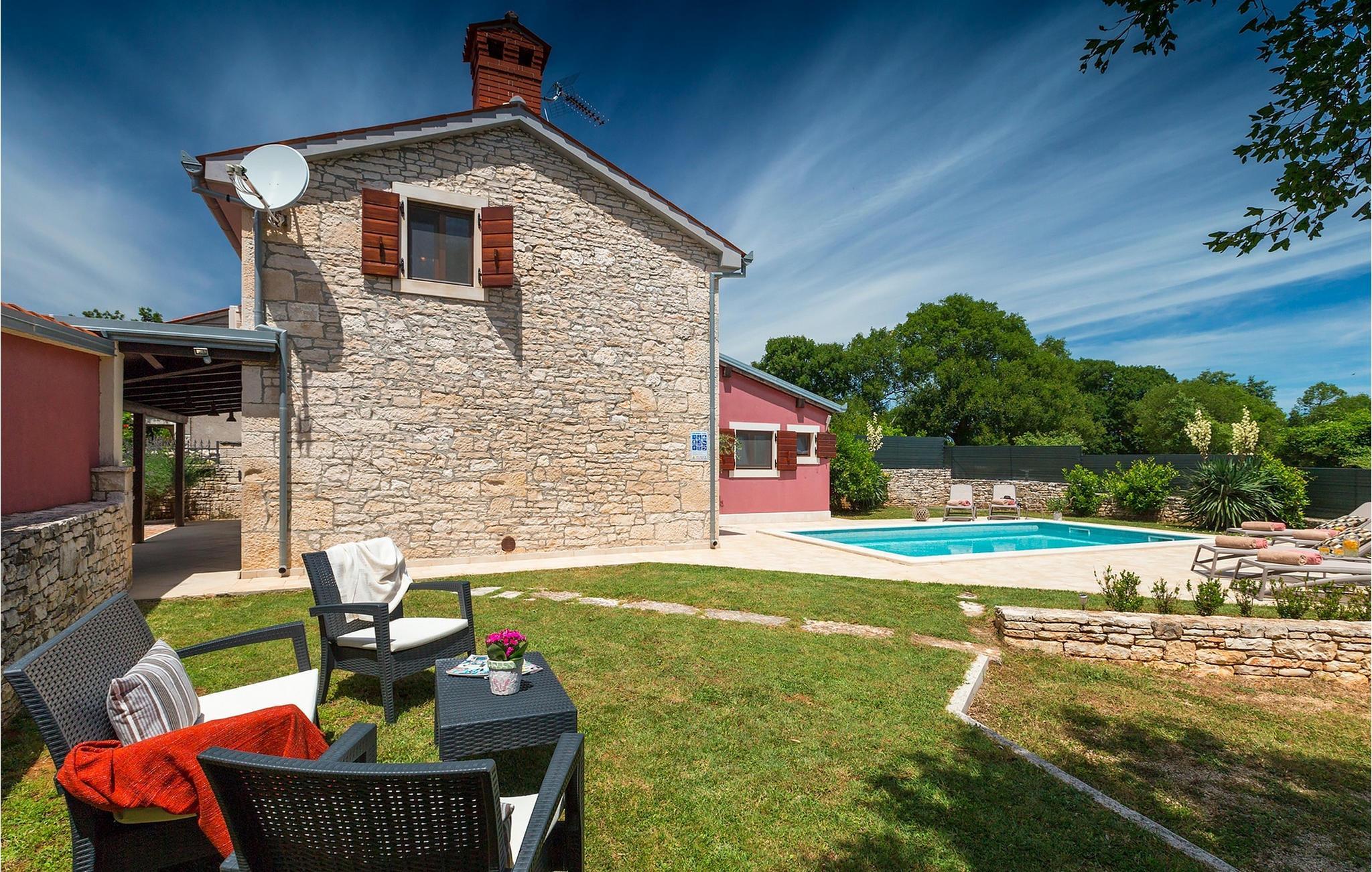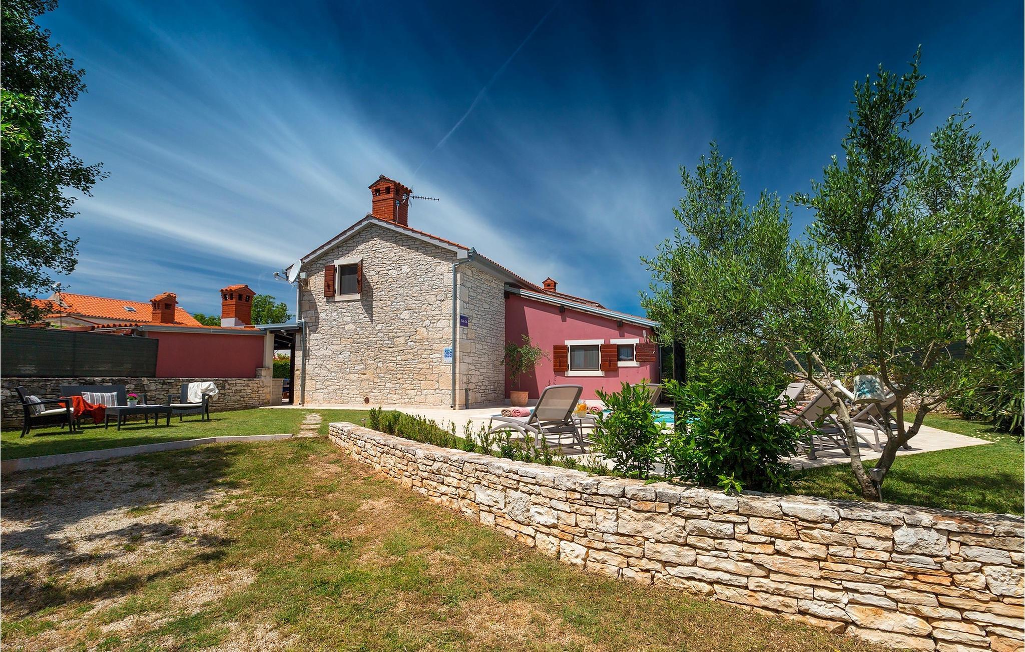 Diese charmante Villa wurde in 1860 gebaut und in 2010 komplett renoviert. Während der Renovierung wurde viel Wert darauf gelegt, den traditionellen Charme der Villa zu bewahren, sowohl im Innenraum als auch im Garten. Im Erdgeschoß finden Sie einen offenen Wohn-/Essbereich, in dem Holzbalken und offene Steinwände eine warme und einladende Atmosphäre schaffen. Für Saison 2018 ist eine Renovierung des Wohnzimmers vorgesehen. Der Kamin wird nicht mehr in diesem Raum sein. Im Erdgeschoß finden Sie auch das gemütliche Schlafzimmer mit Doppelbett, einem eigenen Badezimmer und schönem Blick auf den Poolbereich. 2 weitere Schlafzimmer, die über Klimaanlage und TV verfügen, befinden sich auf ersten Etage. Im ersten Stock gibt es noch ein weiteres Badezimmer. Mit insgesamt 3 Schlafzimmern und einem ausziehbaren Sofabett kann die Villa insgesamt 8 Personen beherbergen. Der Außenbereich ist auch bezaubernd: hier befindet sich der private Pool, der vom sorgfältig gepflegten Garten umgeben ist. Weiterhin können Sie im Garten leckere Mahlzeiten auf dem Grill zubereiten und im Freien essen, während Sie gleichzeitig die Friedlichkeit der istrischen Landschaft genießen. Den jüngsten Gästen steht der private Kinderspielplatz zur Verfügung.Diese wunderschöne Villa liegt inmitten der herrlichen hügeligen Landschaft Istriens ist aber zur gleichen Zeit nur einen Steinwurf vom smaragdblauen Meer und einsamen Kieselstränden der Adria entfernt. Eine sehr gute Pferderanch mit Trekking und Reiten in ihrem Angebot befindet sich gerade im Dorf Manjadvorci. Den Abenteurern stehen zur Verfügung ein großer Adrenalinpark nur 2 km von der Villa, ein Tauchzentrum in der schönen Bucht von Krnica (7 km entfernt), sowie zahlreiche verschiedene Wander- und Radwege in der Nähe der Villa. Hier gibt es eine große Auswahl an Gourmetgerichten zubereitet mit köstlichen lokalen Erzeugnissen, was bedeutet, dass Sie nie weit gehen werden müssen, um ein hervorragendes Essen zu finden. Ihre Lebensmitteln können Sie auch direkt von den lokalen Herstellern kaufen. Um die letzte Zutat zu dieser reichen Vielfalt an Aktivitäten hinzuzufügen, liegen die historische Stadt Pula, die für ihr atemberaubendes Kolosseum weltberühmt ist, und die lebendigen touristischen Hot Spots nur wenige Fahrminuten entfernt, sowie die Fähren für eine Tour um die atemberaubend schönen umliegenden Inseln.