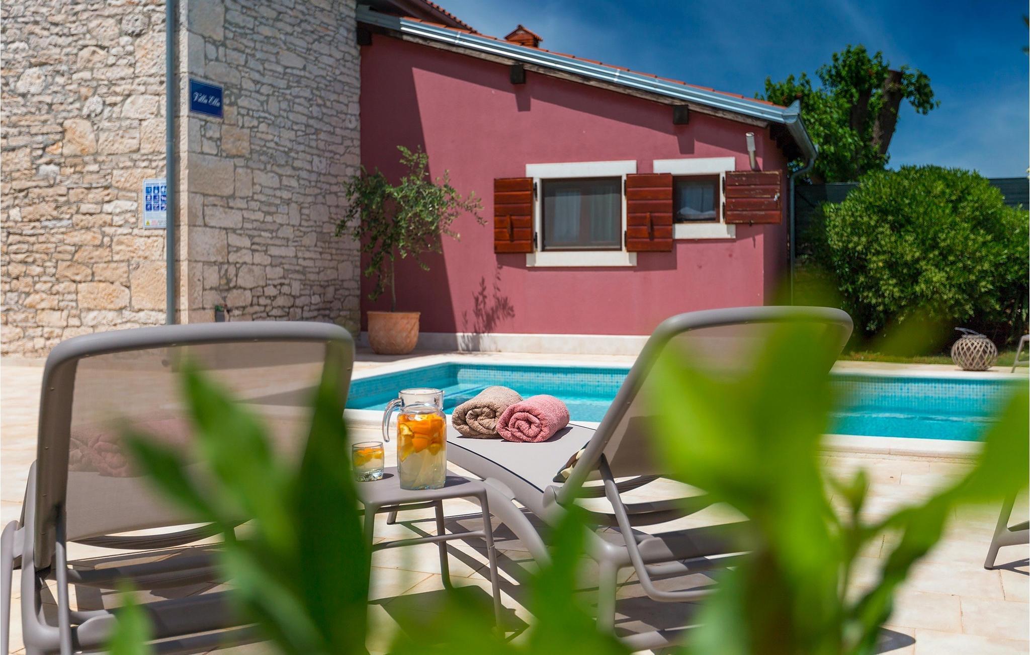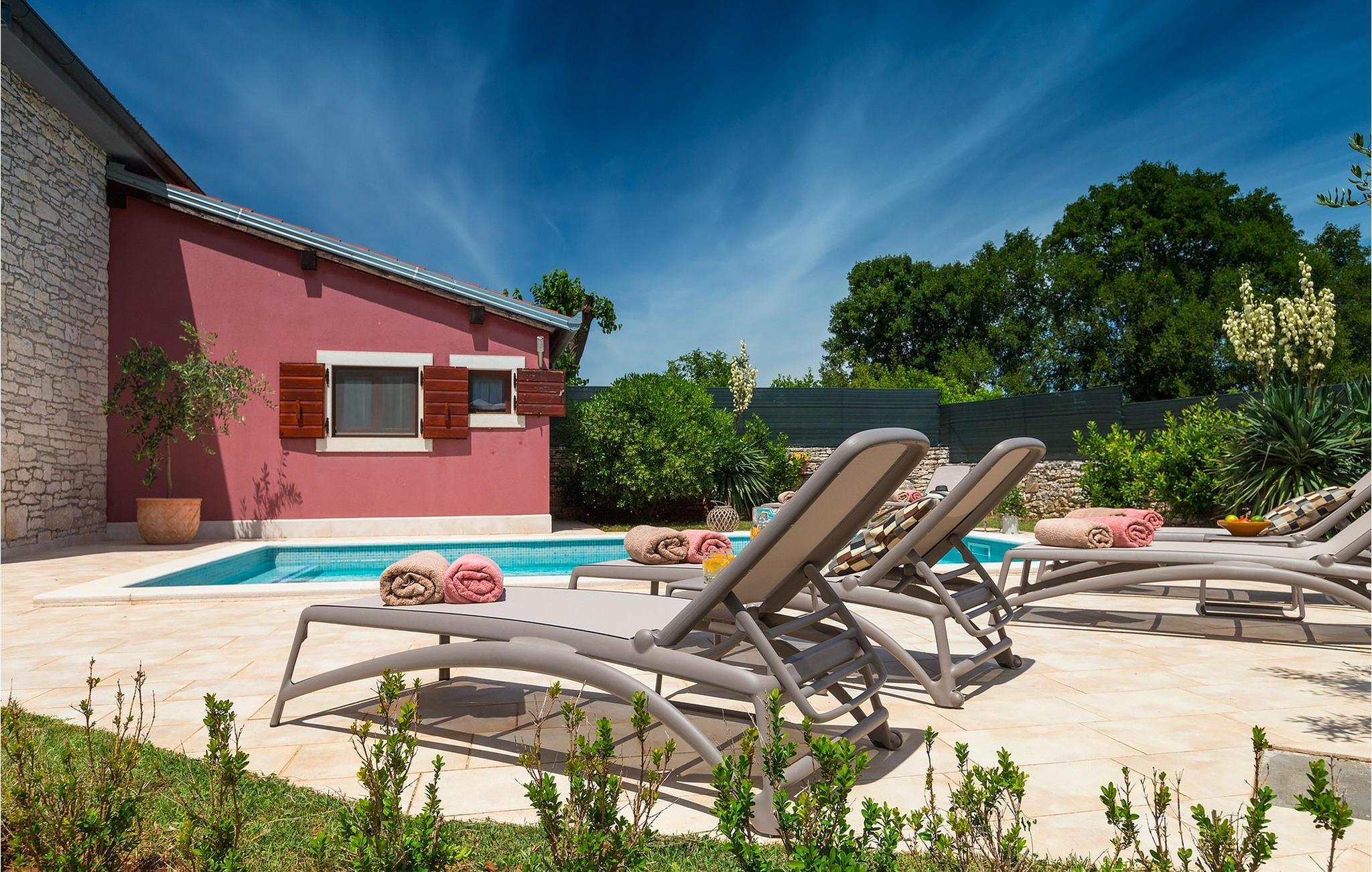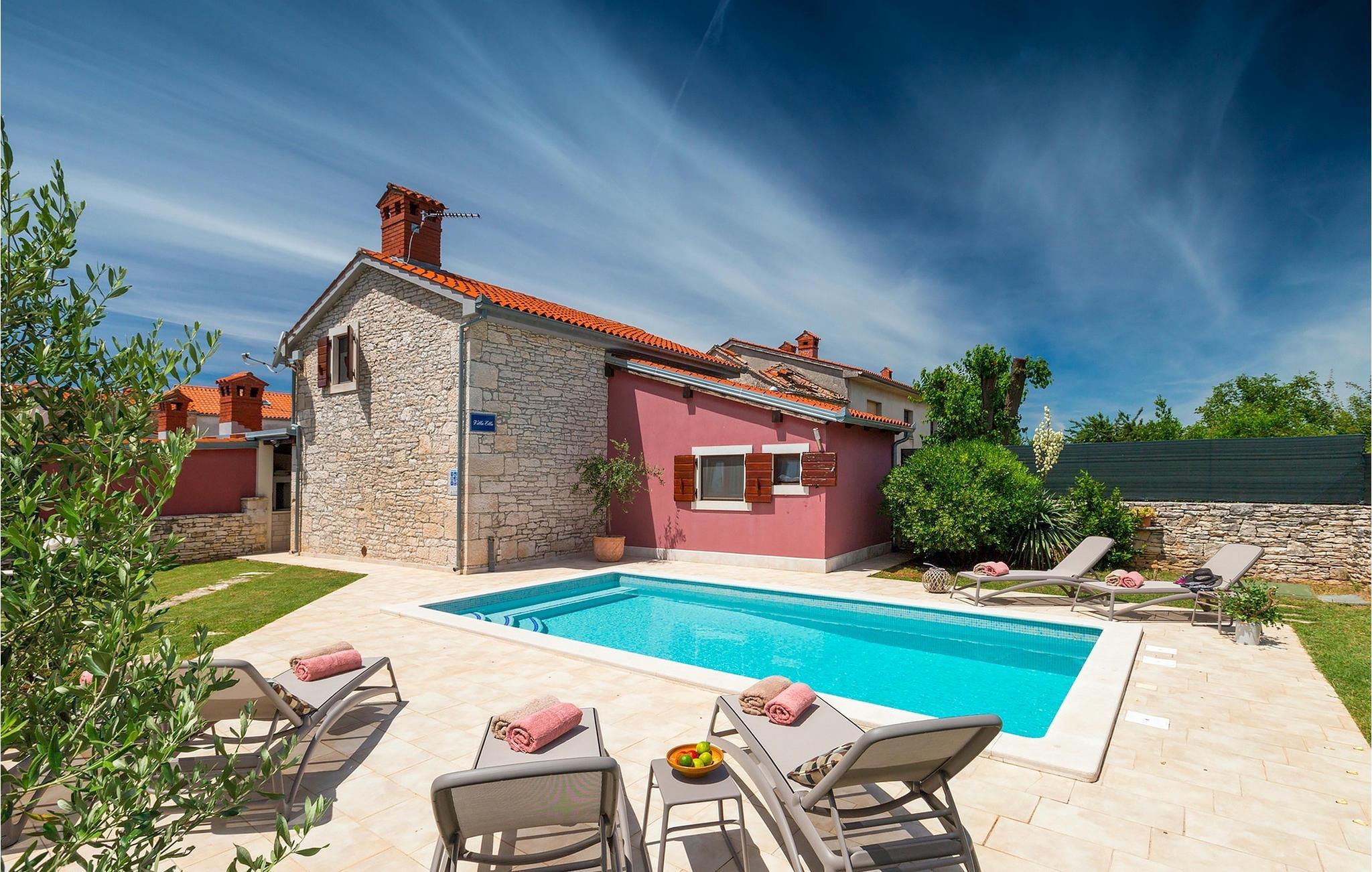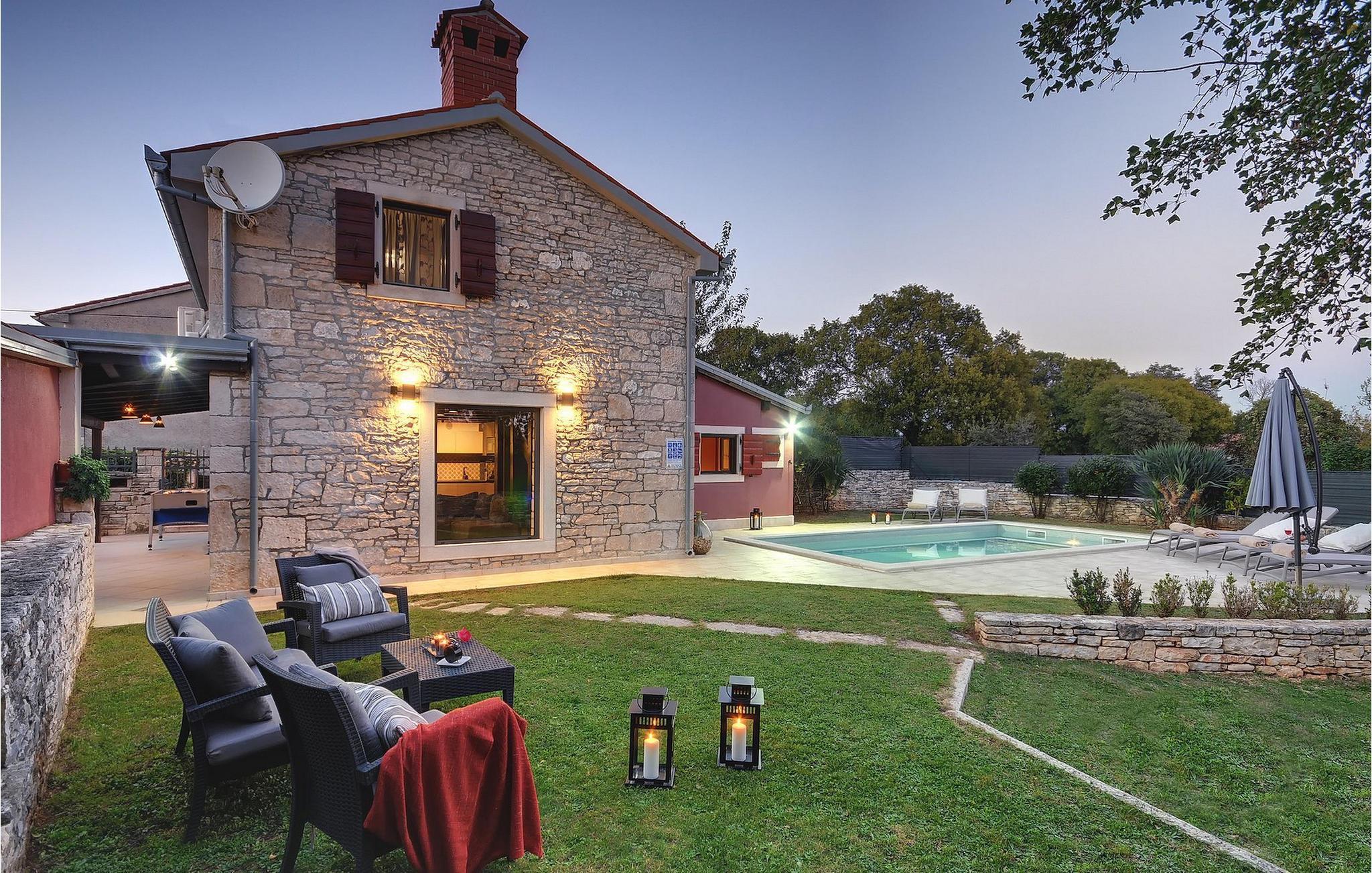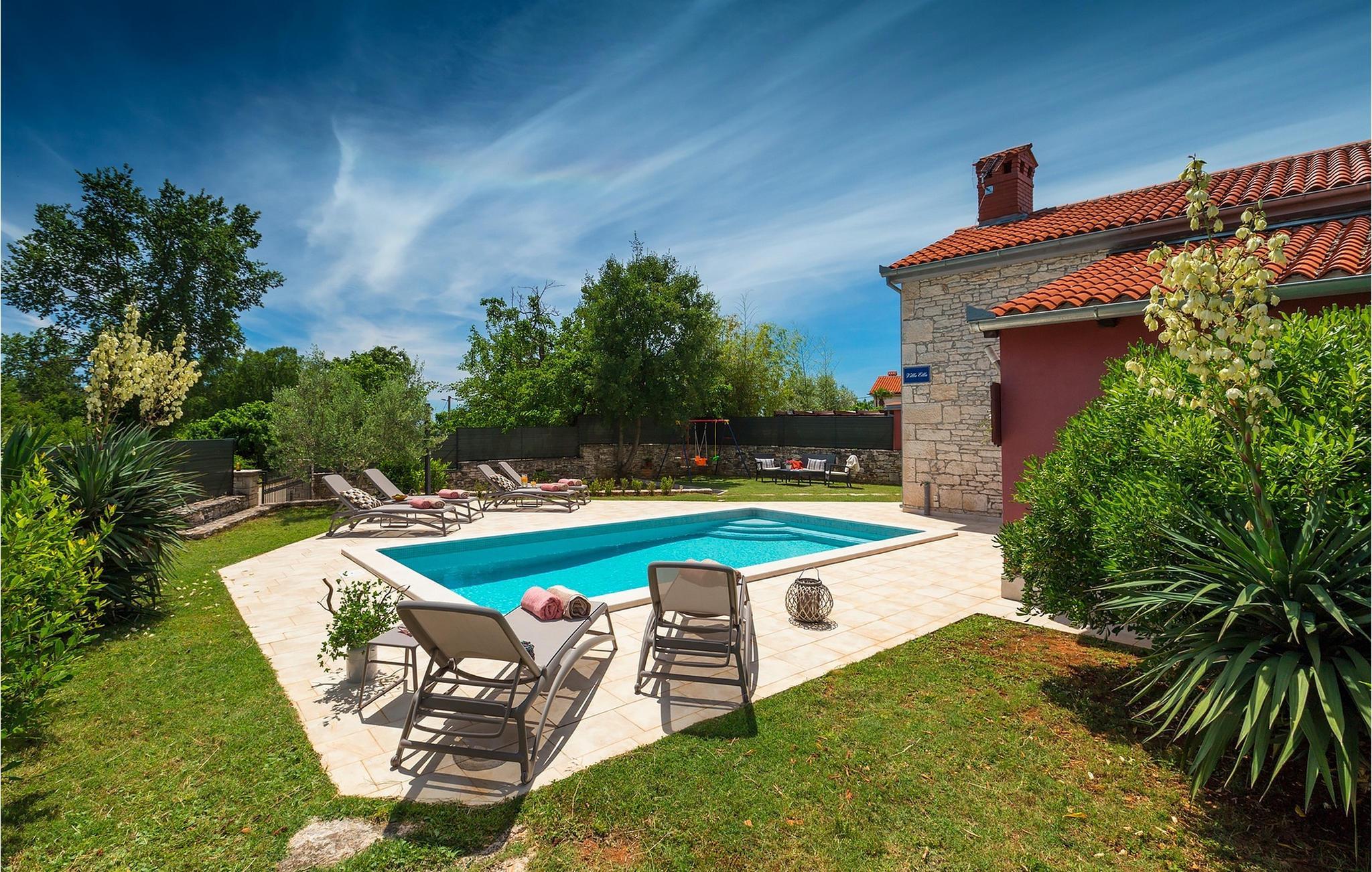 Diese charmante Villa wurde in 1860 gebaut und in 2010 komplett renoviert. Während der Renovierung wurde viel Wert darauf gelegt, den traditionellen Charme der Villa zu bewahren, sowohl im Innenraum als auch im Garten. Im Erdgeschoß finden Sie einen offenen Wohn-/Essbereich, in dem Holzbalken und offene Steinwände eine warme und einladende Atmosphäre schaffen. Für Saison 2018 ist eine Renovierung des Wohnzimmers vorgesehen. Der Kamin wird nicht mehr in diesem Raum sein. Im Erdgeschoß finden Sie auch das gemütliche Schlafzimmer mit Doppelbett, einem eigenen Badezimmer und schönem Blick auf den Poolbereich. 2 weitere Schlafzimmer, die über Klimaanlage und TV verfügen, befinden sich auf ersten Etage. Im ersten Stock gibt es noch ein weiteres Badezimmer. Mit insgesamt 3 Schlafzimmern und einem ausziehbaren Sofabett kann die Villa insgesamt 8 Personen beherbergen. Der Außenbereich ist auch bezaubernd: hier befindet sich der private Pool, der vom sorgfältig gepflegten Garten umgeben ist. Weiterhin können Sie im Garten leckere Mahlzeiten auf dem Grill zubereiten und im Freien essen, während Sie gleichzeitig die Friedlichkeit der istrischen Landschaft genießen. Den jüngsten Gästen steht der private Kinderspielplatz zur Verfügung.Diese wunderschöne Villa liegt inmitten der herrlichen hügeligen Landschaft Istriens ist aber zur gleichen Zeit nur einen Steinwurf vom smaragdblauen Meer und einsamen Kieselstränden der Adria entfernt. Eine sehr gute Pferderanch mit Trekking und Reiten in ihrem Angebot befindet sich gerade im Dorf Manjadvorci. Den Abenteurern stehen zur Verfügung ein großer Adrenalinpark nur 2 km von der Villa, ein Tauchzentrum in der schönen Bucht von Krnica (7 km entfernt), sowie zahlreiche verschiedene Wander- und Radwege in der Nähe der Villa. Hier gibt es eine große Auswahl an Gourmetgerichten zubereitet mit köstlichen lokalen Erzeugnissen, was bedeutet, dass Sie nie weit gehen werden müssen, um ein hervorragendes Essen zu finden. Ihre Lebensmitteln können Sie auch direkt von den lokalen Herstellern kaufen. Um die letzte Zutat zu dieser reichen Vielfalt an Aktivitäten hinzuzufügen, liegen die historische Stadt Pula, die für ihr atemberaubendes Kolosseum weltberühmt ist, und die lebendigen touristischen Hot Spots nur wenige Fahrminuten entfernt, sowie die Fähren für eine Tour um die atemberaubend schönen umliegenden Inseln.