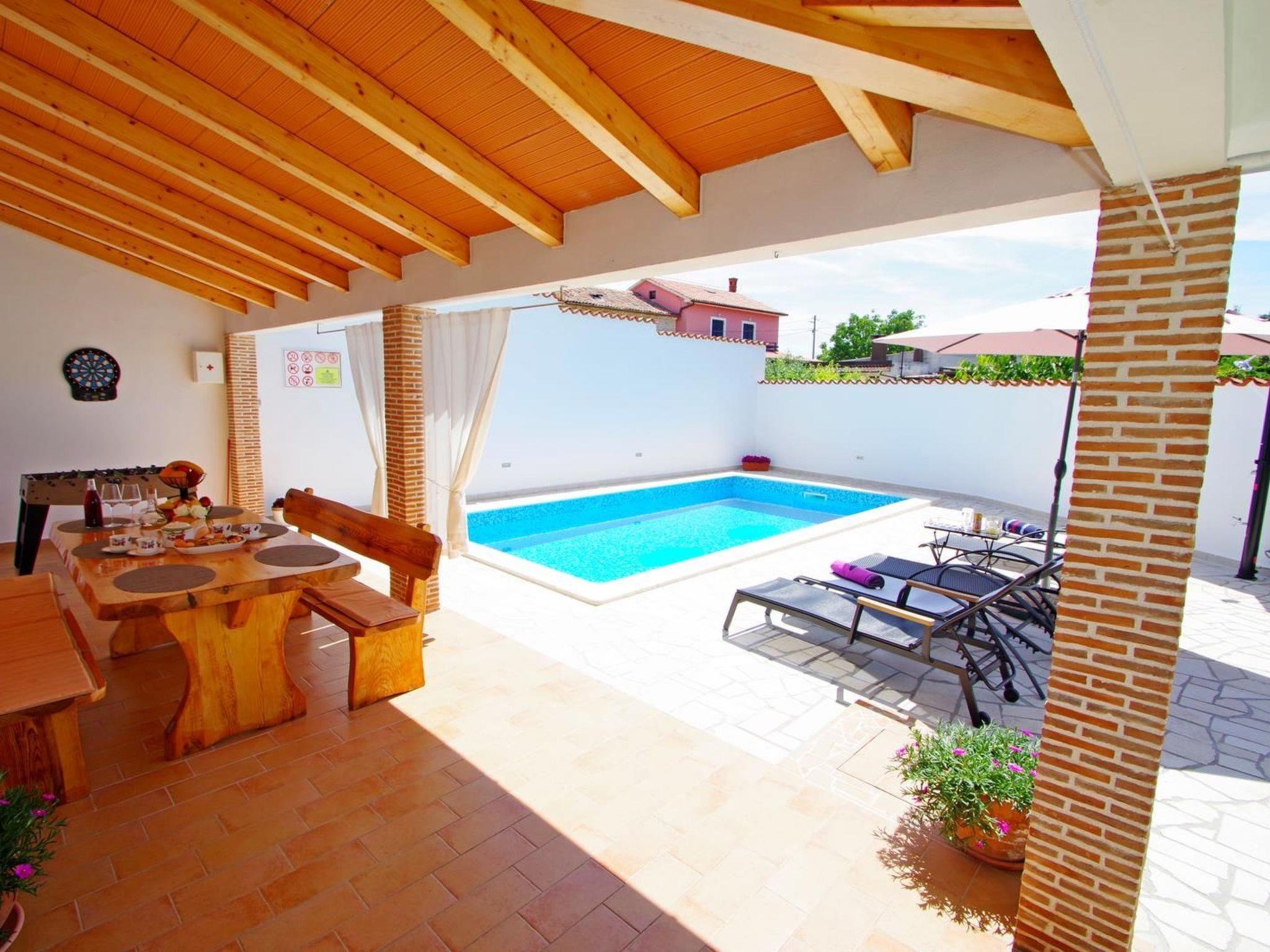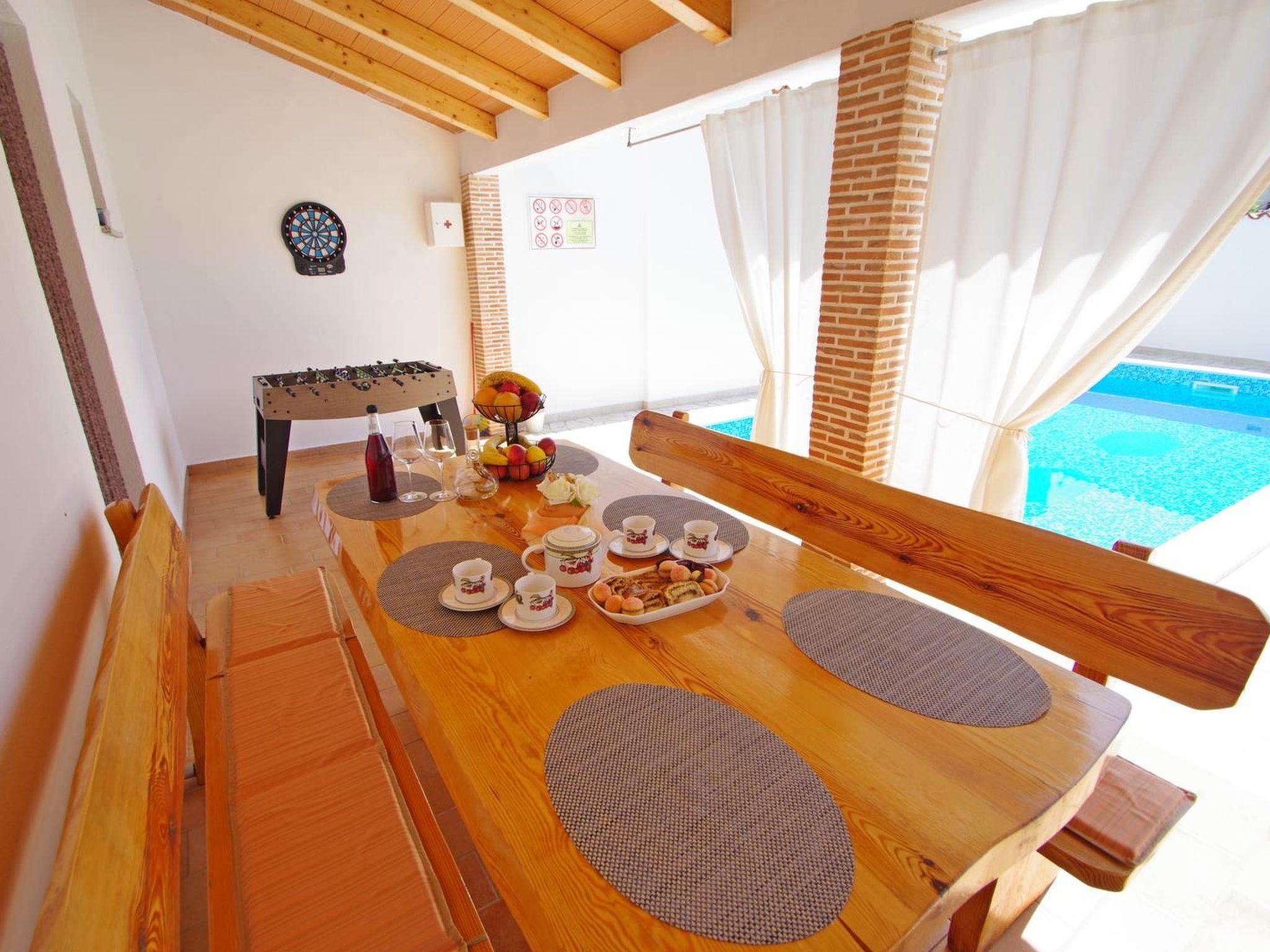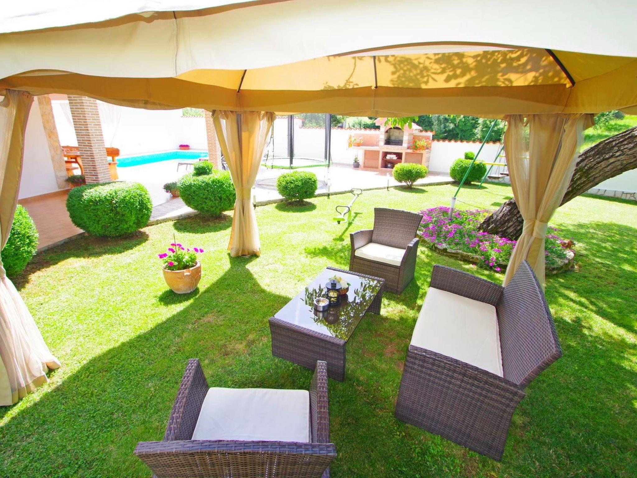 Das Schwimmbad ist 25 m2 groß und 1,35 m tief, umgeben von 8 Sonnenliegen, Außendusche, Sonnenschirm und Grill.