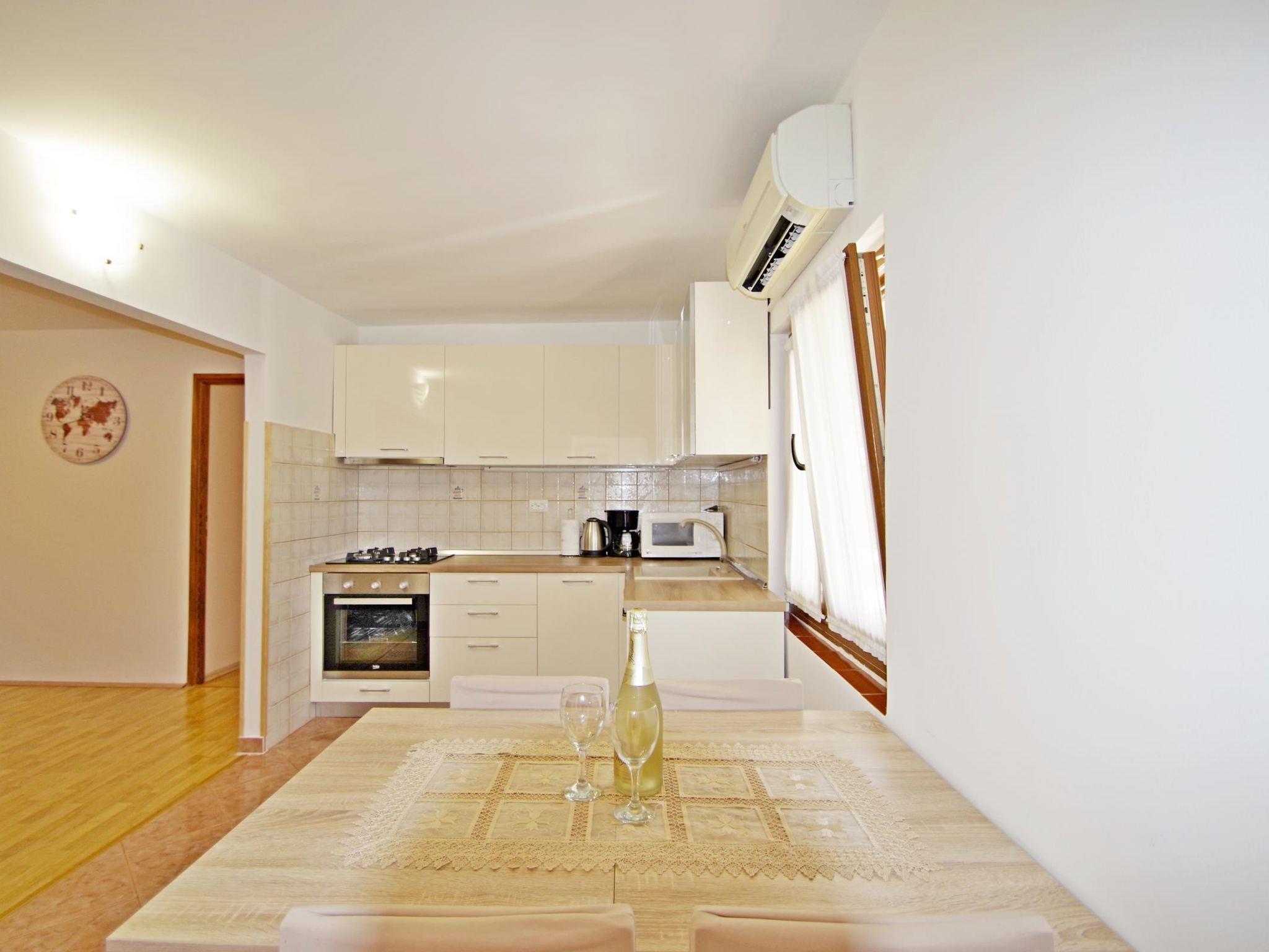 Voll ausgestattete Küche mit Esstisch für 4 Personen (4-Platten-Herd, 2 Gas + 2 elektrisch, Kühlschrank mit Gefrierfach, Backofen, Kaffeemaschine, Toaster, Dunstabzugshaube, Mikrowelle und Kochutensilien)