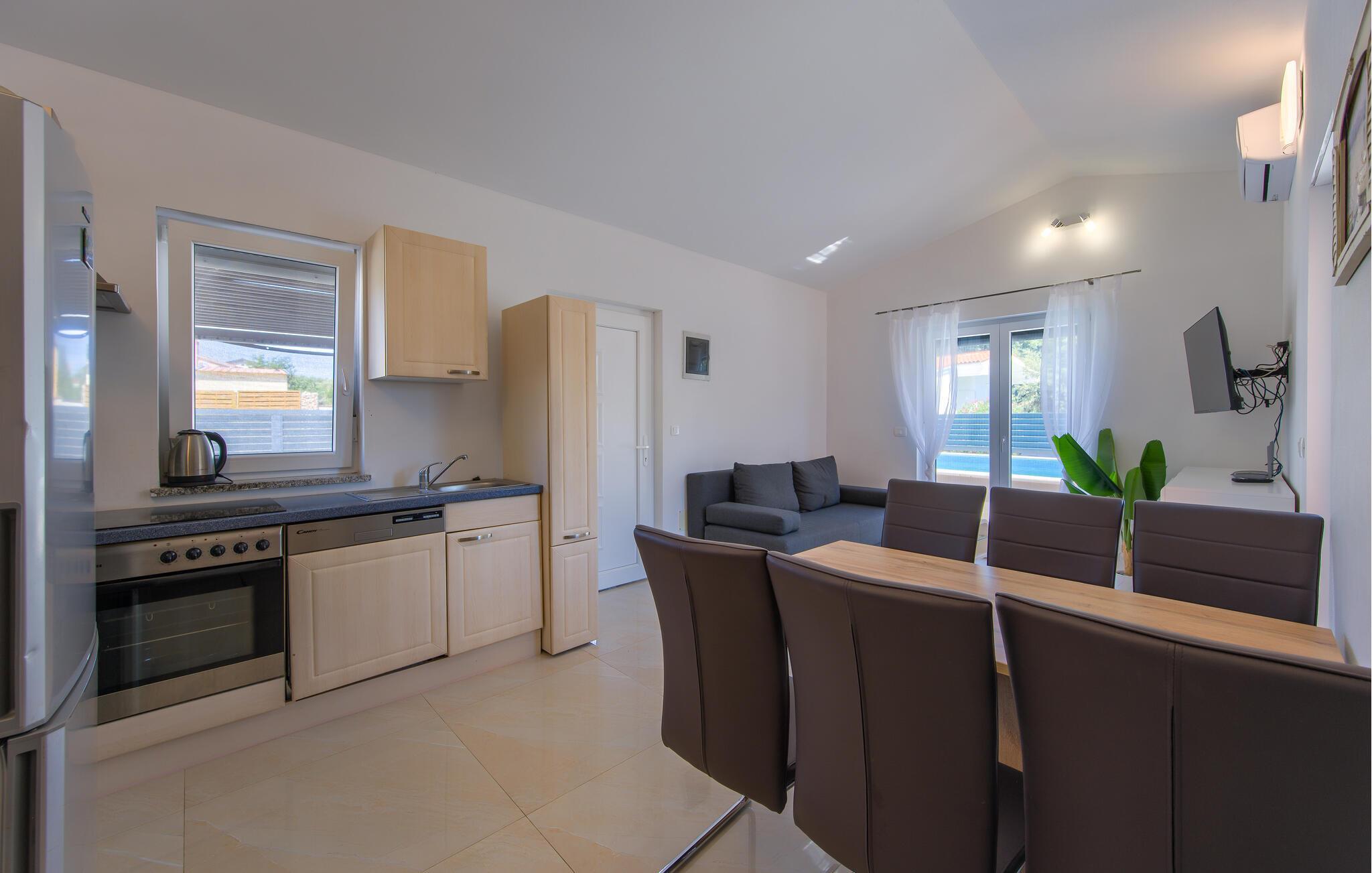 Dieses gemütliche Ferienhaus ist wie geschaffen für eine entspannte Auszeit vom Alltag. Ein schöne Holzoptik, ein gemütliches Sofa und eine moderne Küche schaffen eine behagliche Atmosphäre, in der Sie schnell zur Ruhe kommen und neue Energie tanken können. Egal ob Sie Lesen, Fernsehen oder eine frische Mahlzeit zubereiten – hier bestimmen Sie den Rhythmus Ihres Tages.