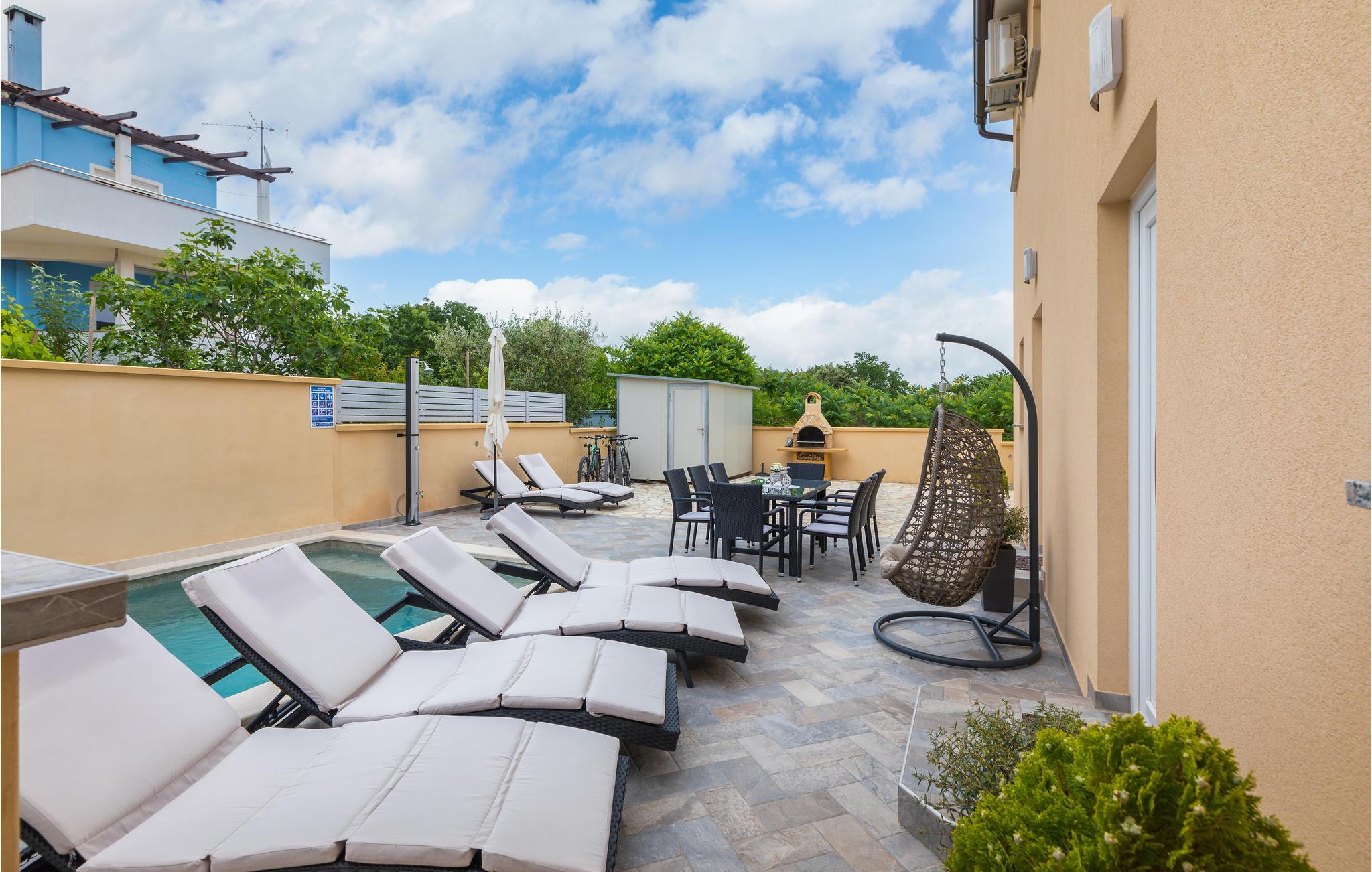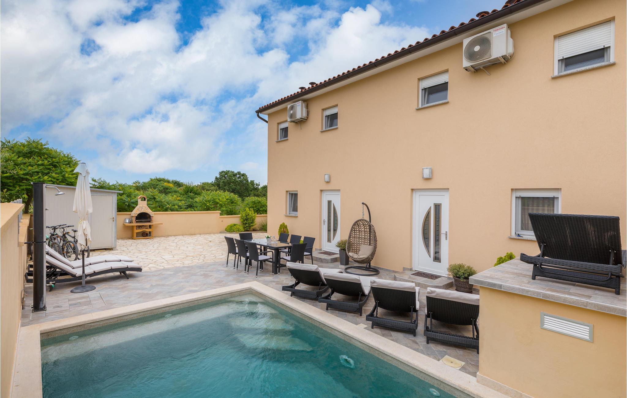 Das stilvolle Ferienhaus liegt in der Siedlung Betiga. Der Wohnraum besteht aus zwei separaten Wohnungen, von denen jede ein Wohnzimmer mit Küche und Essbereich sowie eine zusätzliche Toilette im Erdgeschoss hat, während im Obergeschoss zwei Schlafzimmer, zwei Badezimmer sowie Balkone mit teilweisem Meerblick sind. Genießen Sie das Sonnen und Baden im Garten am Poolbereich oder fahren Sie zu den Stränden und baden im herrlichen Meer. Das Doppelhaus bietet genügend Platz für mehrere Familien oder eine Gruppe von Freunden. In den nahe gelegenen Restaurants werden istrische Spezialitäten und hausgemachte Weine angeboten. Das Feriendomizil ist ein guter Ausgangspunkt um Ausflüge den zu den umliegenden Touristenzentren wie Rovinj, Fažana, Vodnjan, Pula und den Brijuni Insel zu unternehmen.