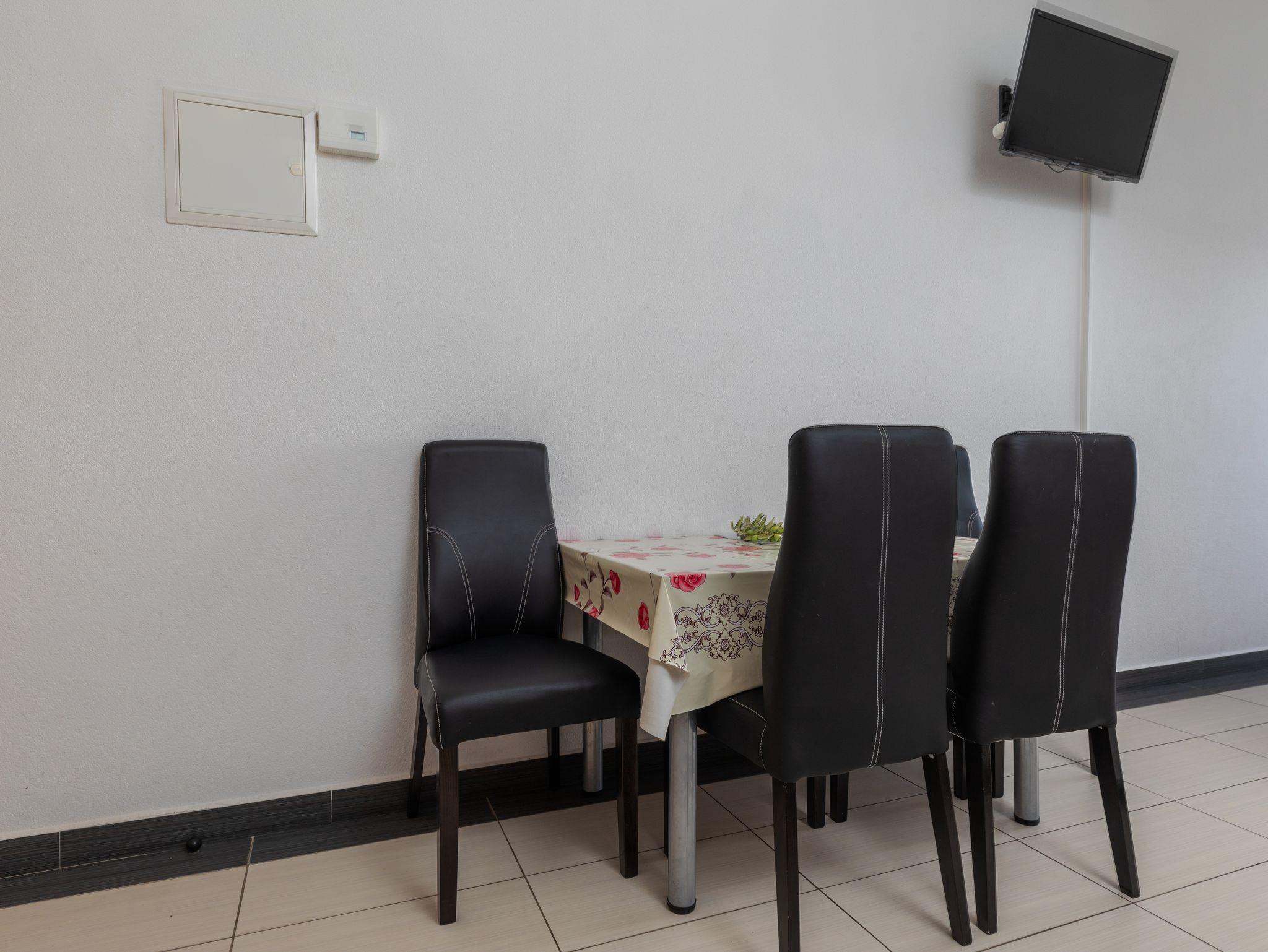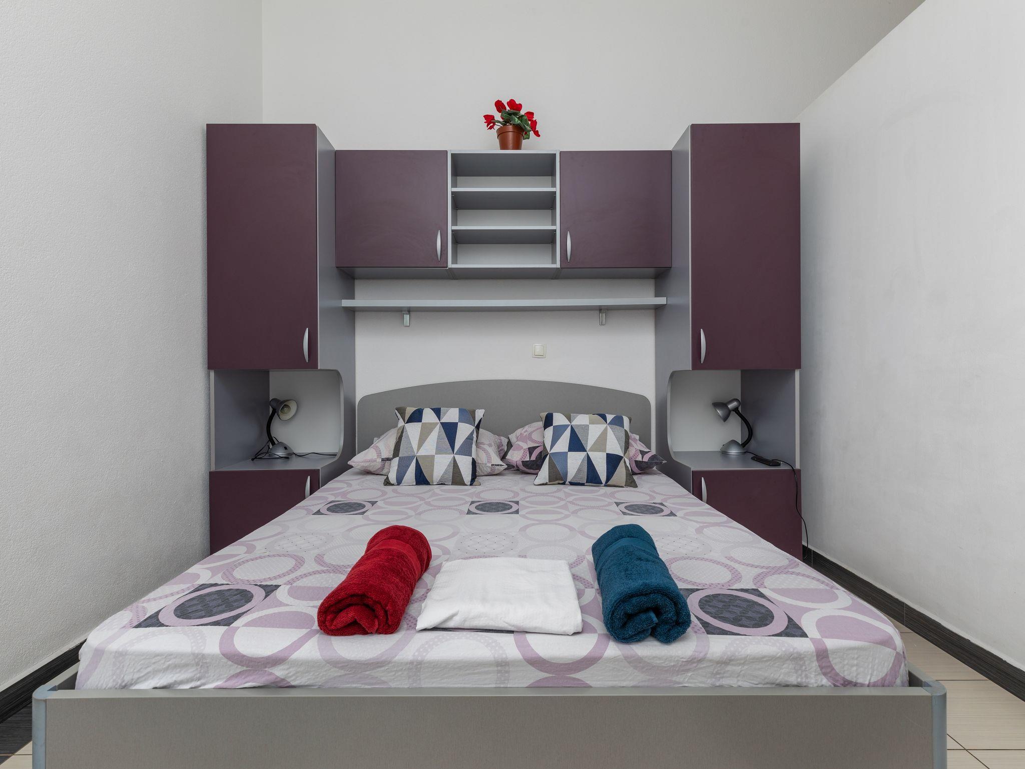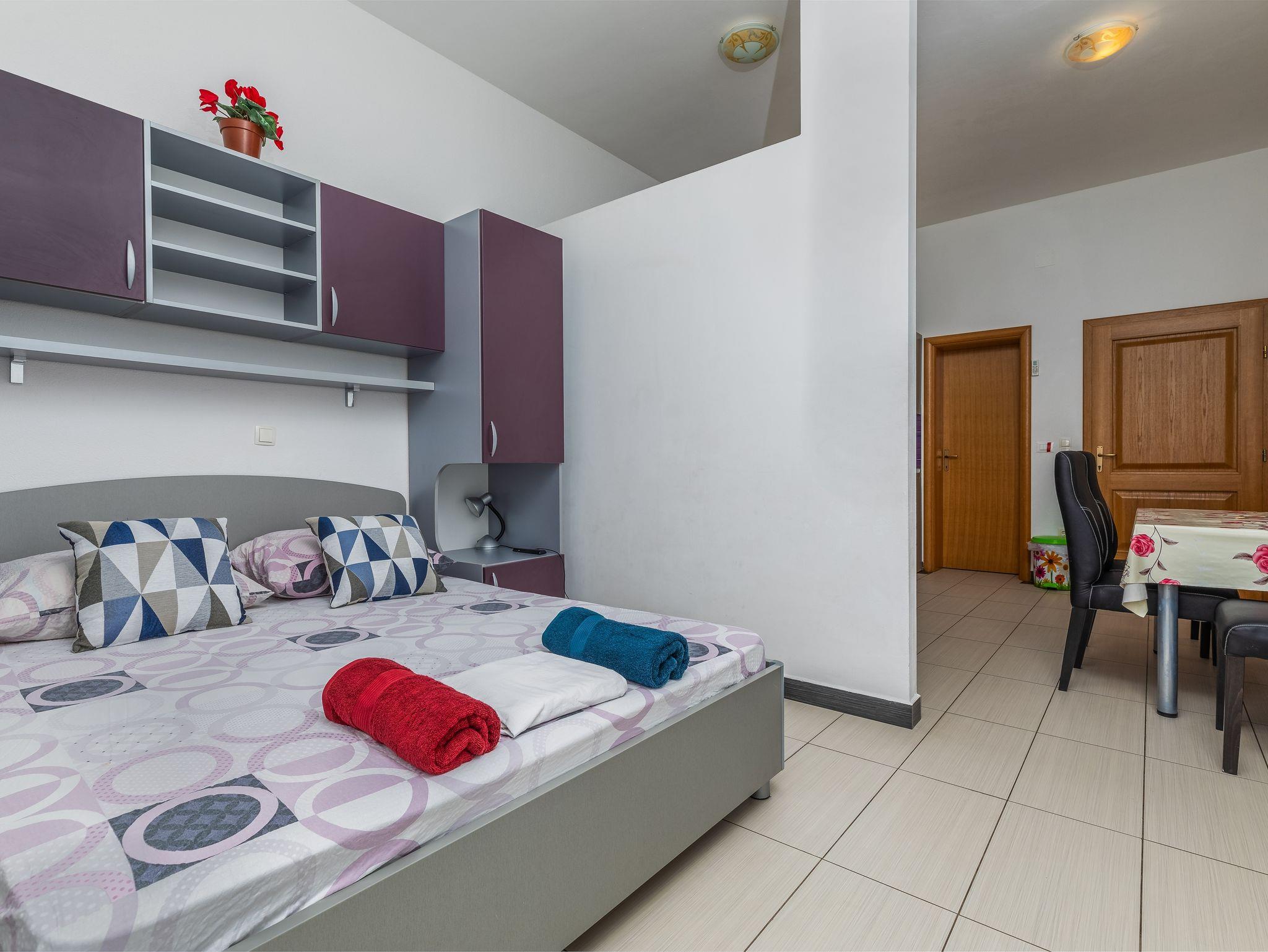 Studio bietet Platz für 2 Gäste. Die Betten sind in Schlafzimmern, die es 1 gibt, innerhalb einer Gesamtfläche von 22m2, angeordnet. Die Gäste haben einen eigenen Balkon zur Verfügung, auf der sie in warmen Sommernächten genießen können. Das Studio-Apartment bietet Meerblick. Es ist erlaubt, Speisen auf dem Gemeinschafts-Grill vorzubereiten. IM PREIS INBEGRIFFEN: Kurtaxe, Endreinigung, Klimatisierung, Parkplatz, Internet, Kinderbett, 2 Kinderbettchen (im Preis enthalten). VERBINDLICHE ZUSÄTZLICHE KOSTEN: Aufzahlung für Kurzaufenthalte (prozentualer Zuschlag pro Nächtigungsanzahl: 30% - 1, 20% - 2, 10% - 3). Die Verfügbarkeit zusätzlicher Dienstleistungen in Ihrem reservierten Termin und die Preise derselben (falls nicht aufgeführt) müssen im Voraus überprüft werden. Zusätzliche Dienstleistungen die in der Zahlungsaufforderung nicht aufgeführt sind werden direkt beim Vermieter bezahlt, angenommen der Gast nutzt auch diese.