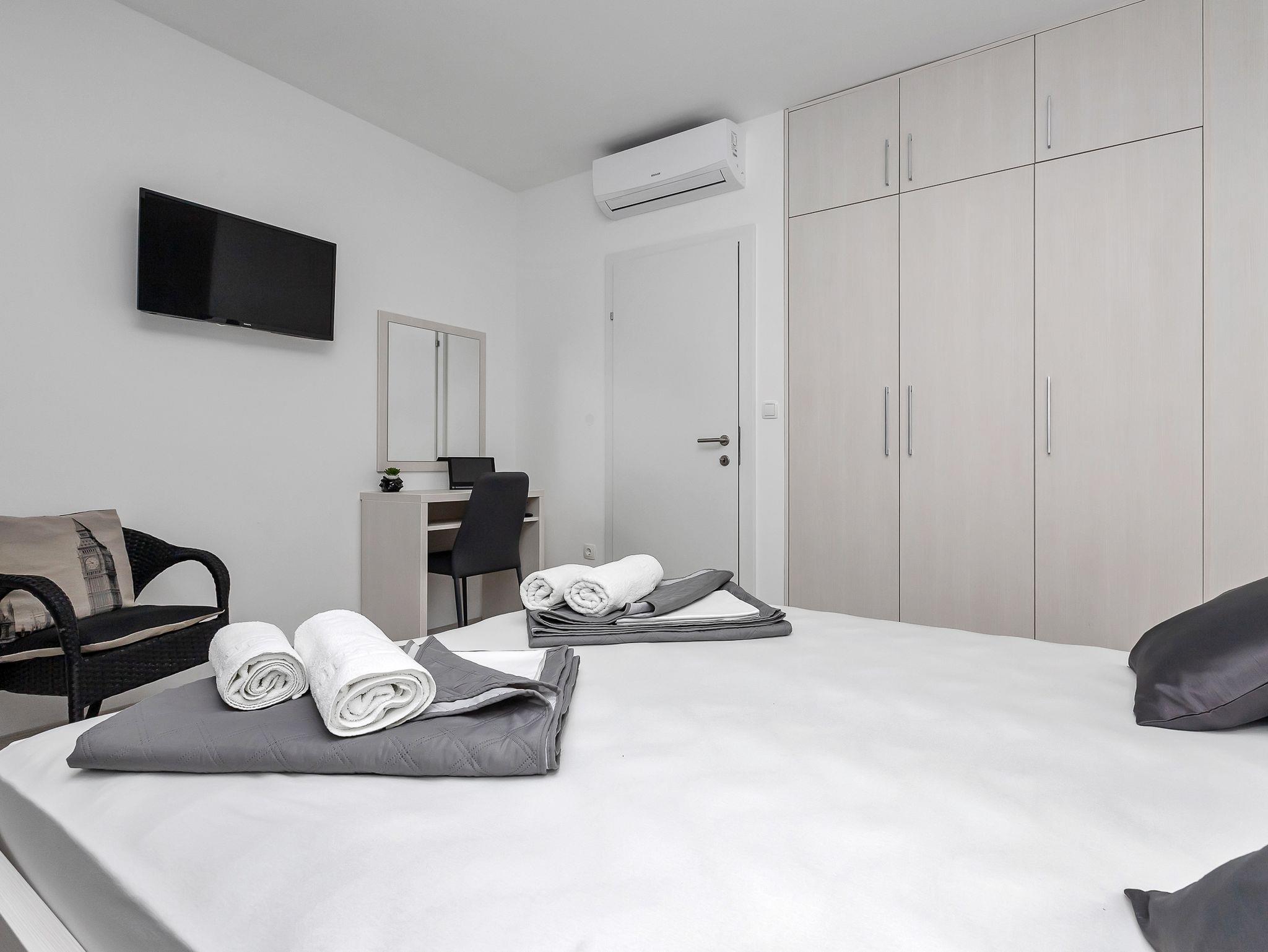 Ferienwohnung bietet Platz für 4 Gäste. Die Betten sind in Schlafzimmern, die es 1 gibt, und in Wohnzimmer, innerhalb einer Gesamtfläche von 44m2, angeordnet. Die Gäste haben eine eigene Terrasse zur Verfügung, auf der sie in warmen Sommernächten genießen können. Das Apartment bietet Meerblick. Es ist erlaubt, Speisen auf dem Gemeinschafts-Grill vorzubereiten. IM PREIS INBEGRIFFEN: Kurtaxe, Endreinigung, Klimatisierung, Parkplatz, Internet, Wäschewaschen, Kinderbett, Bügeleisen, Bügelbrett, Föhn, 1 Bett für Kinder (im Preis enthalten). Die Verfügbarkeit zusätzlicher Dienstleistungen in Ihrem reservierten Termin und die Preise derselben (falls nicht aufgeführt) müssen im Voraus überprüft werden. Zusätzliche Dienstleistungen die in der Zahlungsaufforderung nicht aufgeführt sind werden direkt beim Vermieter bezahlt, angenommen der Gast nutzt auch diese.