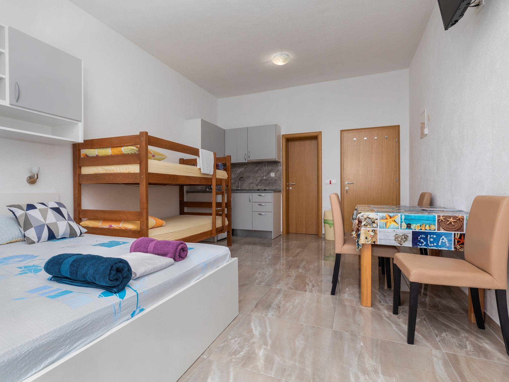 Studio bietet Platz für 2 Gäste. Die Betten sind in Schlafzimmern, die es 1 gibt, innerhalb einer Gesamtfläche von 23m2, angeordnet. Die Gäste haben einen eigenen Balkon zur Verfügung, auf der sie in warmen Sommernächten genießen können. Das Studio-Apartment bietet Meerblick. Es ist erlaubt, Speisen auf dem Gemeinschafts-Grill vorzubereiten. IM PREIS INBEGRIFFEN: Kurtaxe, Endreinigung, Klimatisierung, Parkplatz, Internet, Kinderbett, 2 Kinderbettchen (im Preis enthalten). VERBINDLICHE ZUSÄTZLICHE KOSTEN: Aufzahlung für Kurzaufenthalte (prozentualer Zuschlag pro Nächtigungsanzahl: 30% - 1, 20% - 2, 10% - 3). Die Verfügbarkeit zusätzlicher Dienstleistungen in Ihrem reservierten Termin und die Preise derselben (falls nicht aufgeführt) müssen im Voraus überprüft werden. Zusätzliche Dienstleistungen die in der Zahlungsaufforderung nicht aufgeführt sind werden direkt beim Vermieter bezahlt, angenommen der Gast nutzt auch diese.