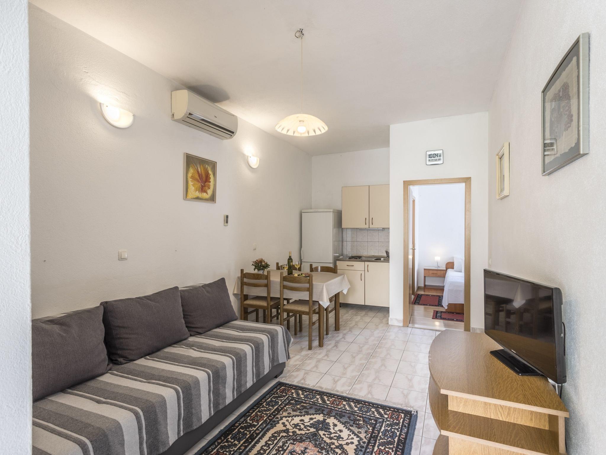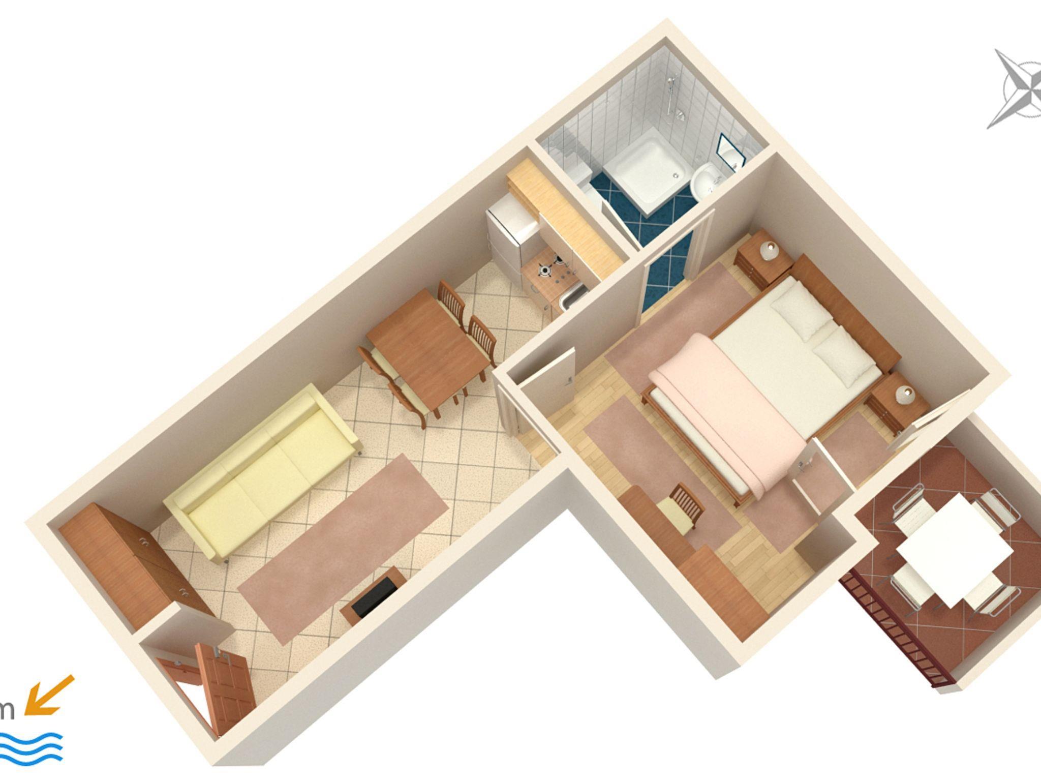 Ferienwohnung bietet Platz für 4 Gäste. Die Betten sind in Schlafzimmern, die es 1 gibt, und in Wohnzimmer, innerhalb einer Gesamtfläche von 31m2, angeordnet. Die Gäste haben eine eigene Terrasse zur Verfügung, auf der sie in warmen Sommernächten genießen können. Das Apartment bietet Meerblick. Es ist erlaubt, Speisen auf dem Gemeinschafts-Grill vorzubereiten. In der Unterkunftseinheit besteht die Möglichkeit des Mitbringens von Haustieren gegen Aufpreis. IM PREIS INBEGRIFFEN: Kurtaxe, Endreinigung, Klimatisierung, Parkplatz, Internet, Kinderbett, Bügeleisen, Sonnenschirm. VERBINDLICHE ZUSÄTZLICHE KOSTEN: Aufzahlung für Kurzaufenthalte (prozentualer Zuschlag pro Nächtigungsanzahl: 30% - 1, 20% - 2, 10% - 3). UNVERBINDLICHE ZUSÄTZLICHE KOSTEN: Wäschewaschen (5,00 € Waschen), Haustiere (5,00 € pro Nacht). Die Verfügbarkeit zusätzlicher Dienstleistungen in Ihrem reservierten Termin und die Preise derselben (falls nicht aufgeführt) müssen im Voraus überprüft werden. Zusätzliche Dienstleistungen die in der Zahlungsaufforderung nicht aufgeführt sind werden direkt beim Vermieter bezahlt, angenommen der Gast nutzt auch diese.