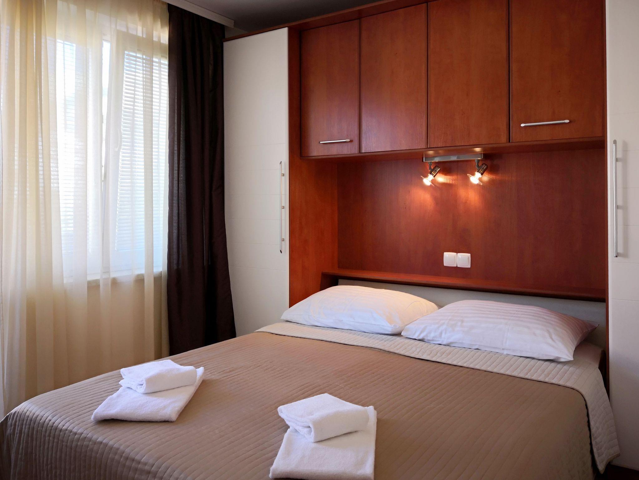 Ferienwohnung bietet Platz für 4 Gäste. Die Betten sind in Schlafzimmern, die es 2 gibt, innerhalb einer Gesamtfläche von 45m2, angeordnet. Die Gäste haben eine eigene Terrasse zur Verfügung, auf der sie in warmen Sommernächten genießen können. IM PREIS INBEGRIFFEN: Kurtaxe, Endreinigung, Klimatisierung, Parkplatz, Internet. VERBINDLICHE ZUSÄTZLICHE KOSTEN: Aufzahlung für Kurzaufenthalte (prozentualer Zuschlag pro Nächtigungsanzahl: 30% - 1, 20% - 2, 10% - 3). Die Verfügbarkeit zusätzlicher Dienstleistungen in Ihrem reservierten Termin und die Preise derselben (falls nicht aufgeführt) müssen im Voraus überprüft werden. Zusätzliche Dienstleistungen die in der Zahlungsaufforderung nicht aufgeführt sind werden direkt beim Vermieter bezahlt, angenommen der Gast nutzt auch diese.