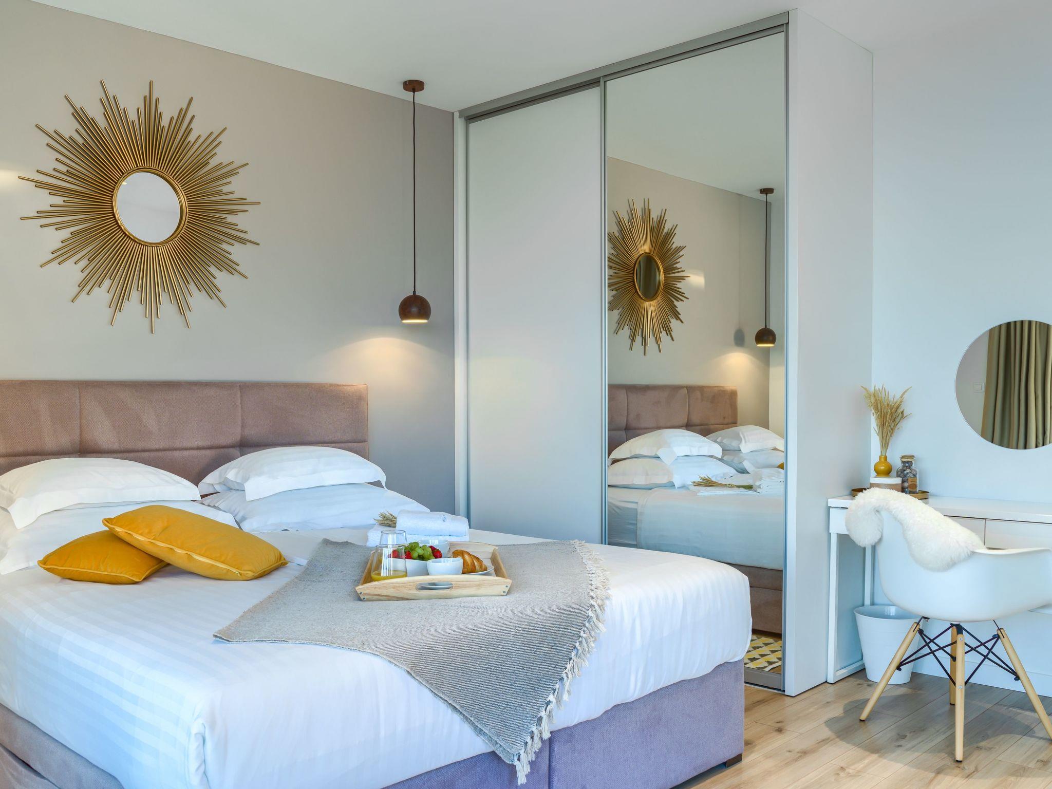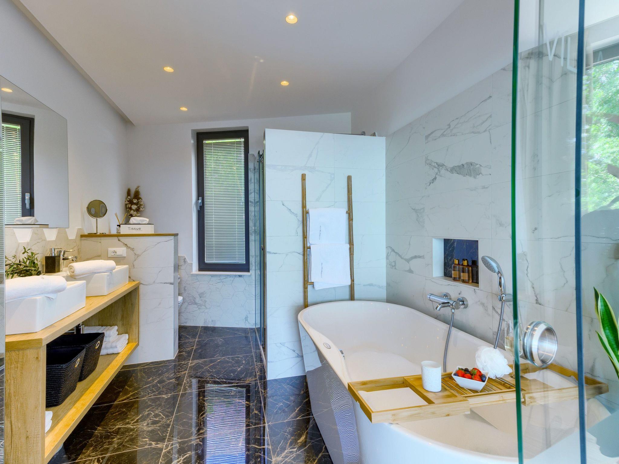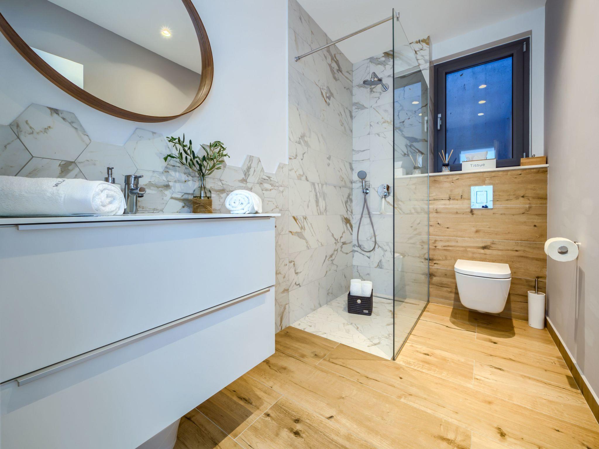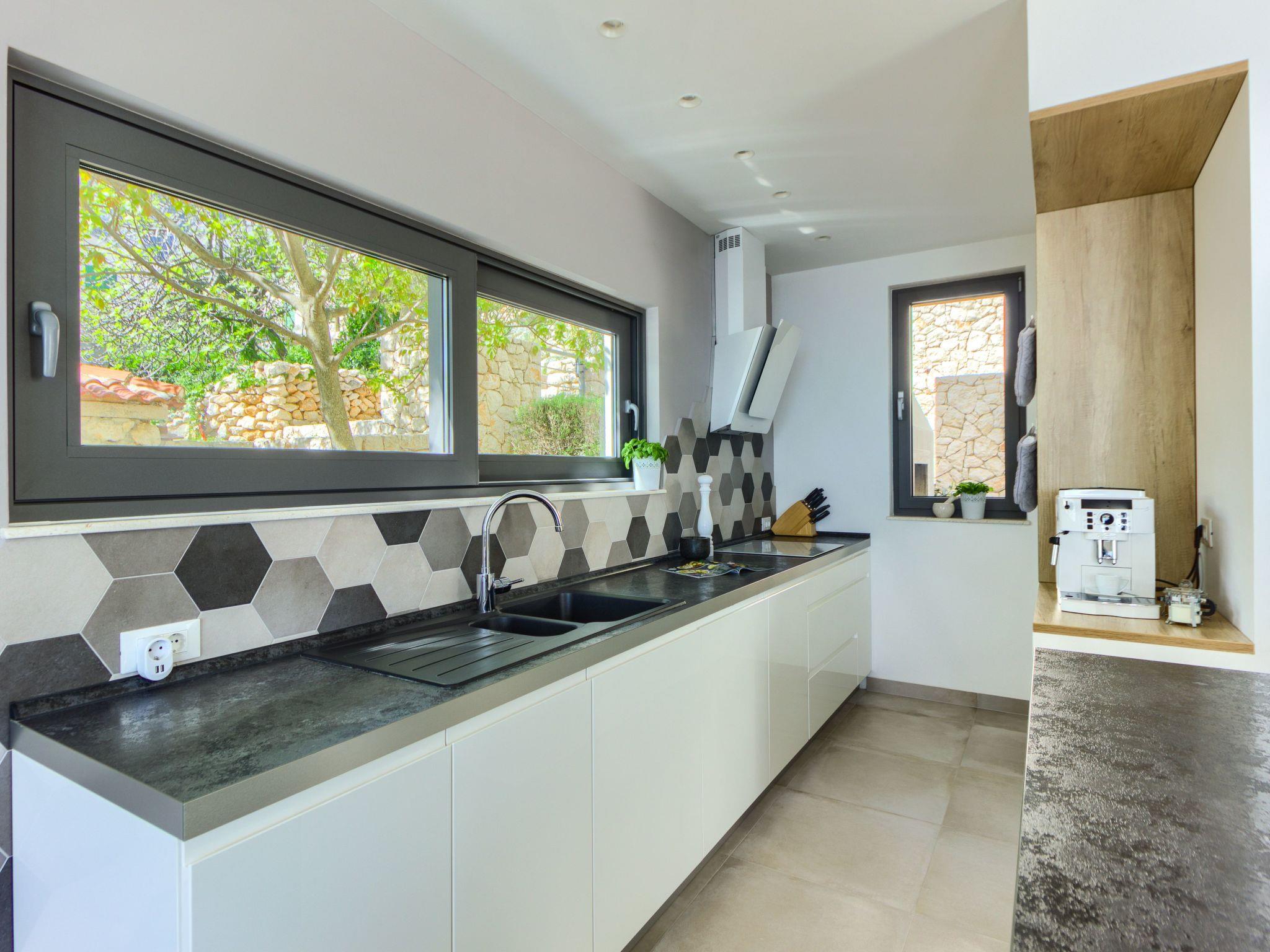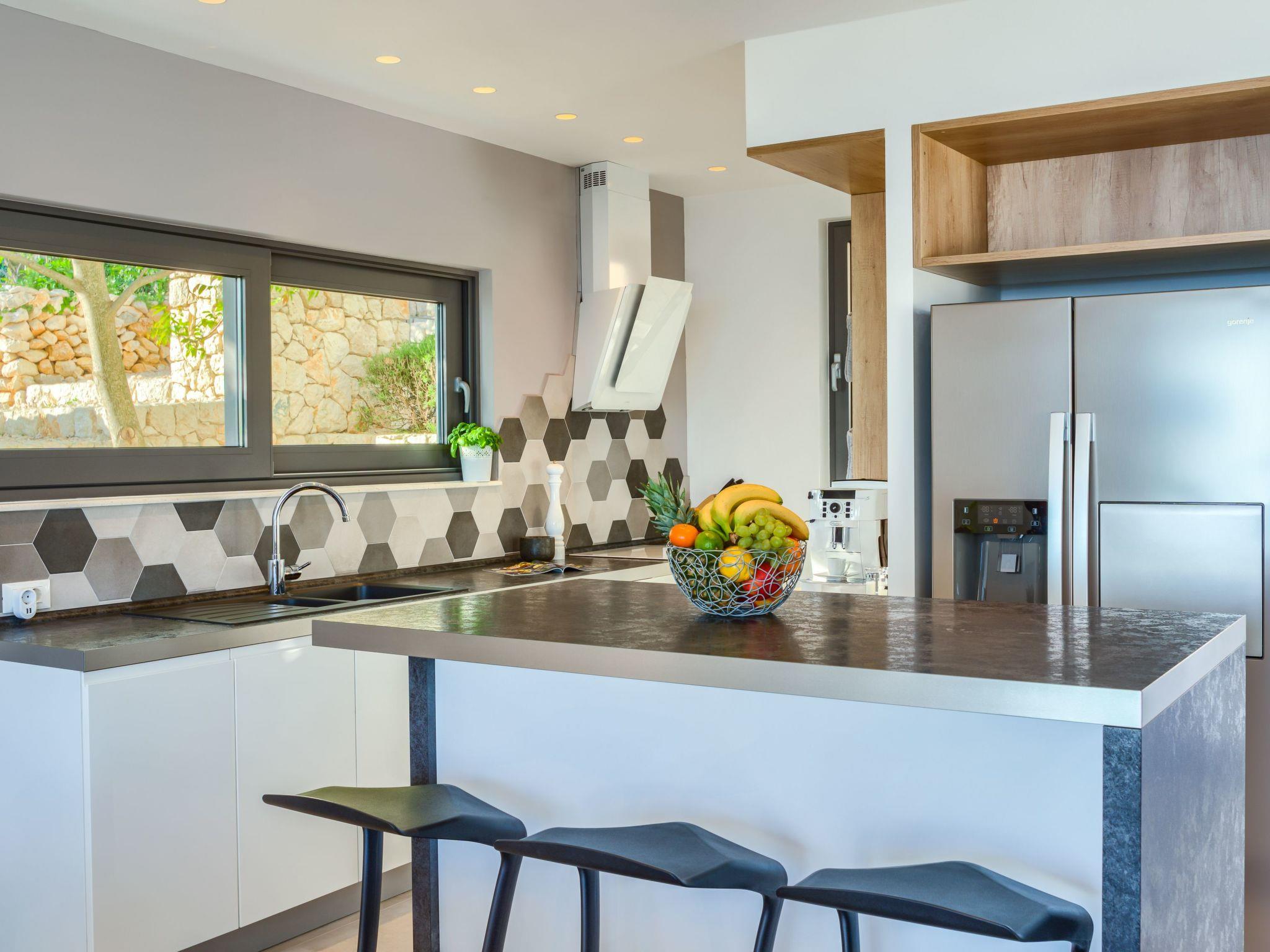 Die Villa verteilt sich auf zwei Stockwerke und beeindruckt mit einer Wohnfläche von 400 m², ergänzt durch großzügige Terrassen und Balkonflächen. Im Herzen der Villa befindet sich eine moderne, voll ausgestattete Küche mit Stehbar und unmittelbarem Zugang zu einem Atrium mit Grillkamin. Der offene Ess- und Wohnbereich, ausgestattet mit einem großen Eichenholztisch, einer komfortablen Lounge-Sofalandschaft, Ambilight Android TV, Soundbar und einem Sonos-Soundsystem, lädt zum Verweilen und Entspannen ein. Alle Zimmer in diesem Traumhaus sind klimatisiert und sorgen für eine angenehme Atmosphäre.